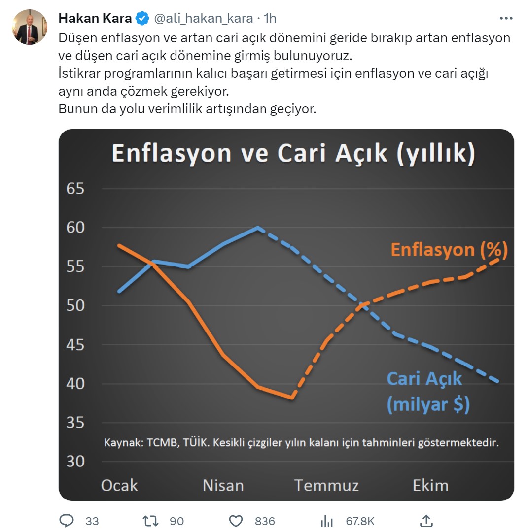 Eski Merkez Bankası Başekonomisti Hakan Kara, Türkiye’nin "artan enflasyon ve düşen cari açık dönemine" girdiğini paylaştı. Paylaştığı bir grafikle enflasyon ve cari açık seyrini ortaya koyan Hakan Kara, paylaşımında ise şunları kaydetti: “Düşen enflasyon ve artan cari açık dönemini geride bırakıp artan enflasyon ve düşen cari açık dönemine girmiş bulunuyoruz. İstikrar programlarının kalıcı başarı getirmesi için enflasyon ve cari açığı aynı anda çözmek gerekiyor. Bunun da yolu verimlilik artışından geçiyor.” Kaynak: Hakan Kara - Twitter [news_id:699918]