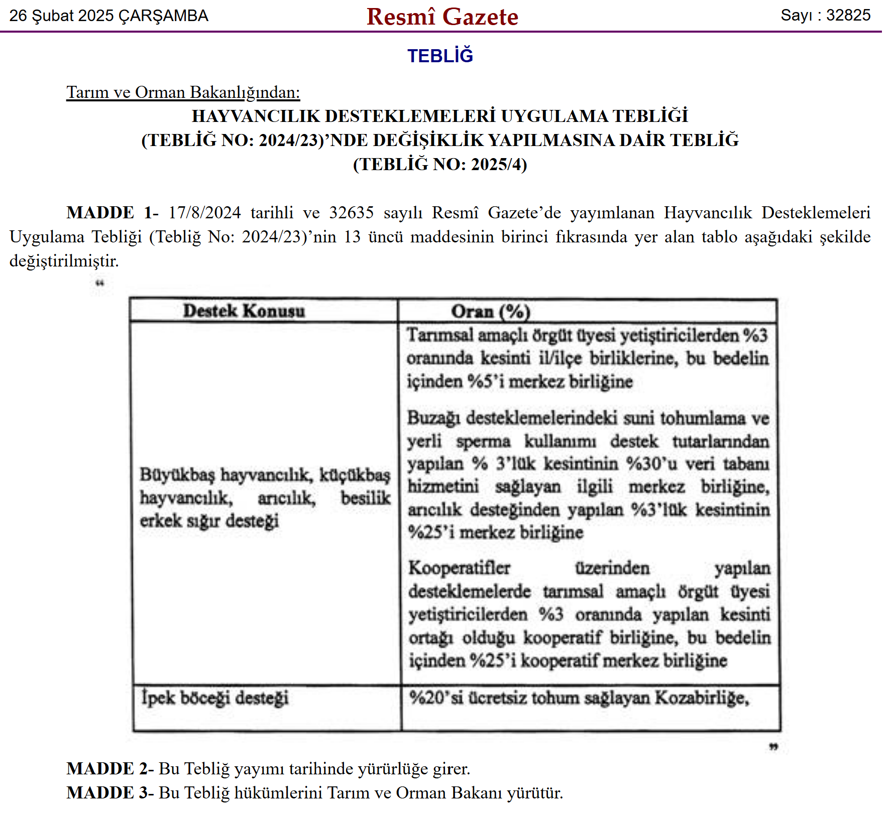 Resmi Gazete’de yayımlanarak yürürlüğe giren değişikliğe göre tarımsal amaçlı örgütlere üyelik şartı bulunan destek ödemelerinde, çiftçi örgütlerini güçlendirme adı altında yapılan kesintilerde güncellemeye gidildi. Tarım ve Orman Bakanlığı, hayvancılık destekleme ödemelerinde kesinti oranlarında değişiklik yapılmasına yönelik yeni düzenlemeyi hayata geçirdi. Yeni düzenlemeye göre, büyükbaş ve küçükbaş hayvancılık, arıcılık ve besilik erkek sığır desteği kapsamında tarımsal amaçlı örgüt üyesi yetiştiricilerden yapılan yüzde 3’lük kesintinin il veya ilçe birliklerine aktarılması sürecek. Ancak, bu bedelin yüzde 5’inin merkez birliğine ödenmesi gerekecek. Buzağı desteklemelerindeki suni tohumlama ve yerli sperma kullanımı destek tutarlarından yapılan yüzde 3’lük kesintinin yüzde 30’u, veri tabanı hizmetini sağlayan ilgili merkez birliğine aktarılacak. Arıcılık desteğinde ise yapılan kesintinin yüzde 25’inin merkez birliğine yönlendirilmesi sağlanacak. Kooperatifler üzerinden yapılan desteklemelerde de değişikliğe gidildi. Tarımsal amaçlı örgüt üyesi yetiştiricilerden yapılan yüzde 3’lük kesinti, üreticinin ortağı olduğu kooperatif birliğine aktarılacak ve bu tutarın yüzde 25’i kooperatif merkez birliğine verilecek. Yeni düzenlemenin, üretici birliklerini ve kooperatifleri güçlendirmeyi amaçladığı belirtilirken, desteklemelerin daha etkin yönetilmesine ve sürdürülebilir hayvancılık faaliyetlerinin desteklenmesine katkı sağlaması hedefleniyor. Kaynak: Resmi Gazete