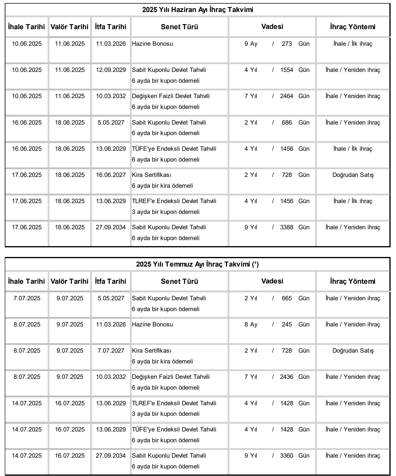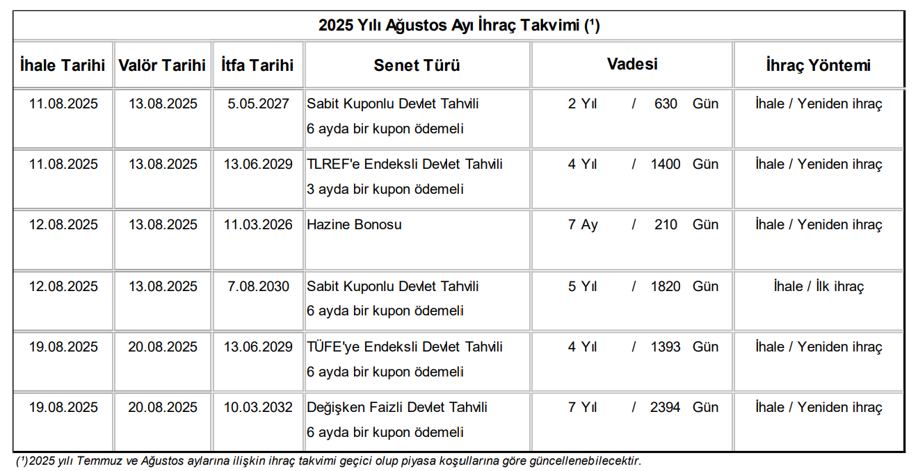 Hazine ve Maliye Bakanlığı, gelecek 3 aylık dönemde 919,3 milyar liralık iç borç servisine karşılık, 1 trilyon 24,3 milyar liralık iç borçlanmaya gideceğini duyurdu. Bakanlık, gelecek 3 aylık döneme ilişkin iç borçlanma stratejisini açıkladı. Buna göre Hazine, söz konusu dönemde 919,3 milyar liralık iç borç servisine karşılık 1 trilyon 24,3 milyar liralık iç borçlanma yapacağını bildirdi. Bu çerçevede Hazine; 📌 Haziran ayında toplam 265,6 milyar TL’lik iç borç servisine karşılık toplam 278,9 milyar TL’lik iç borçlanma, 📌 Temmuz ayında toplam 316 milyar TL’lik iç borç servisine karşılık toplam 349,4 milyar TL’lik iç borçlanma, 📌 Ağustos ayında toplam 337,7 milyar TL’lik iç borç servisine karşılık toplam 396 milyar TL’lik iç borçlanma yapılmasının planlandığını aktardı. Hazine'nin Haziran - Ağustos 2025 döneminde gerçekleştirilecek ihraçlar ile söz konusu ihraçlara ilişkin açıklamaları ise şöyle oldu: Kaynak: Hazine ve Maliye Bakanlığı