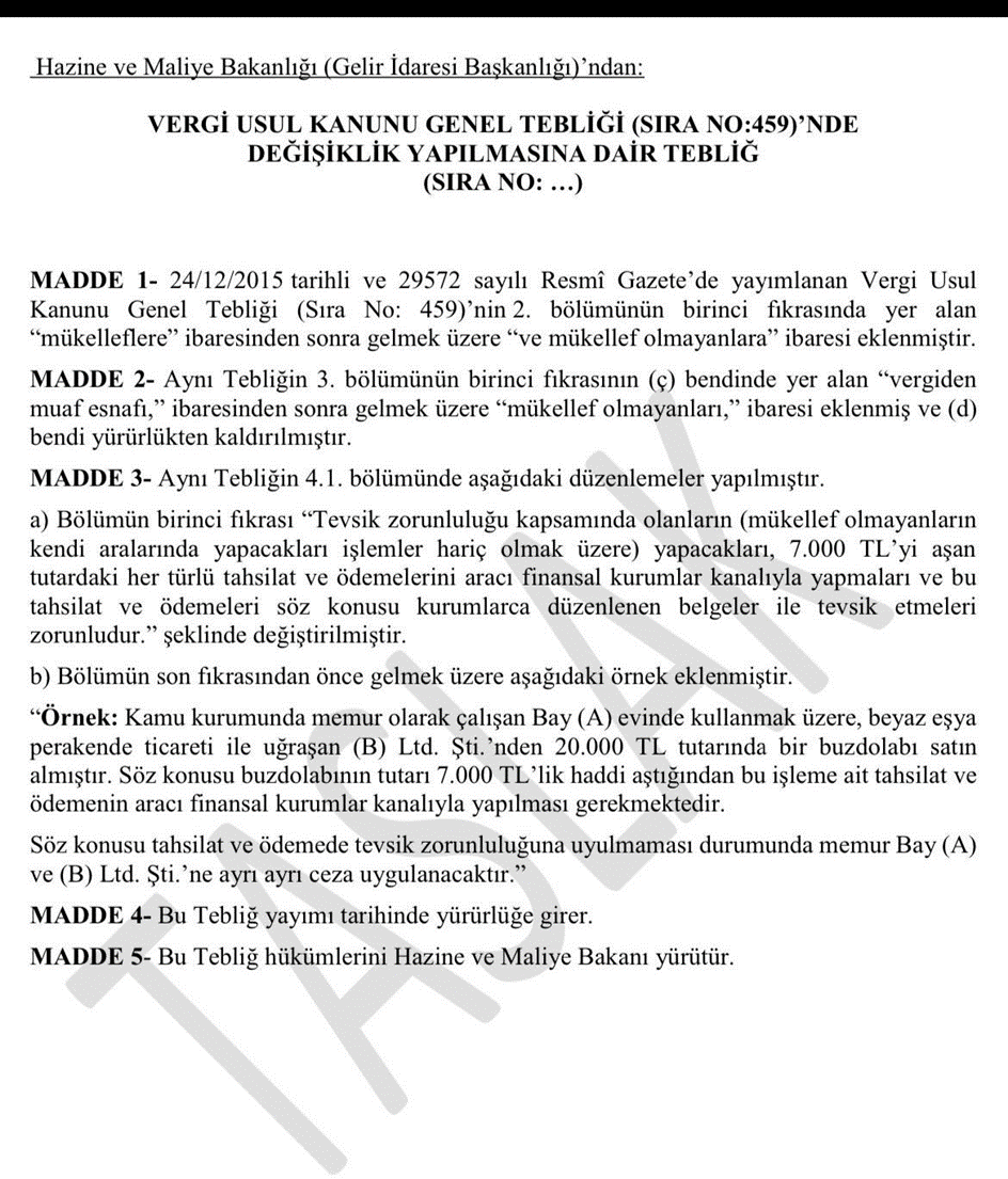 Prof. Dr. Şenol Babuşcu, Hazine ve Maliye Bakanlığı'nın yeni bir taslak düzenleme hazırlığında olduğunu ve bu düzenlemenin 7 bin TL ve üzeri ödemelerde banka veya kredi kartı kullanımını zorunlu kılacağını ayrıca mükellef olmayan kişiler için de geçerli olacağını duyurdu. Ziraat Bankası eski Genel Müdür Yardımcısı ve Başkent Üniversitesi Uluslararası Finans ve Bankacılık Bölüm Başkanı Prof. Dr. Şenol Babuşcu, sosyal medya hesabı X'ten yaptığı paylaşımda Hazine ve Maliye Bakanlığı'nın yeni bir taslak düzenleme hazırlığında olduğunu duyurdu. Babuşcu'nun paylaştığına göre, bu taslak düzenleme tebliğ haline gelirse, 7.000 TL ve üzeri ödemelerde banka veya kredi kartı kullanma zorunluluğu getirilecek. Taslak, mükellef olmayan kişilerin de 7.000 TL üzerindeki alışverişlerinde bu zorunluluğa uymalarını öngörüyor; aksi takdirde özel usulsüzlük cezası uygulanacak. Babuşcu'nun sosyal medya paylaşımı şu şekilde: “Bu taslak düzenleme tebliğ haline gelirse; Artık her kim olursa olsun 7.000,00 TL ve üzeri ödemelerini banka yada kredi kartı ile ödeme yapmak zorunda kalacak. Örnekten görüleceği üzere Kamu Kurumunda memur olarak çalışan Bay A evine aldığı 20.000 TL'lik buzdolabının ödemesini banka veya kredi kartı aracılığıyla yapmak zorunda. Kamu Kurumunda akademisyen olarak çalışan Bay B evindeki kütüphanesi için aldığı 10.000 TL'lik kitabın ödemesini banka veya kredi kartı aracılığıyla yapmak zorunda kalacak.. Bu taslaktan önce, alışverişte iki tarafta vergi mükellefi olursa 7000 TL’nin üzerindeki alışverişler banka veya kredi kartıyla olması gerekiyordu. Bu taslak yayınlanır, tebliğ haline gelirse mükellef olmayanlar da 7000 TL’nin üzerinde alışverişte banka veya kredi kartı kullanacak, aksi halde onlara da özel usülsüzlük cezası kesilecek.” Babuşcu'nun sosyal medya hesabından paylaştığı taslak metni ise şöyle: “Vergi Usul Kanunu Genel Tebliği (sıra no:459)'nde Değişiklik Yapılmasına Dair Tebliğ MADDE 1- 24/12/2015 tarihli ve 29572 sayılı Resmi Gazete'de yayımlanan Vergi Usul Kanunu Genel Tebliği (Sıra No: 459)'nin 2. bölümünün birinci fıkrasında yer alan "mükelleflere" ibaresinden sonra gelmek üzere "ve mükellef olmayanlara" ibaresi eklenmiştir. MADDE 2- Aynı Tebliğin 3. bölümünün birinci fıkrasının (ç) bendinde yer alan "vergiden muaf esnafı," ibaresinden sonra gelmek üzere "mükellef olmayanları," ibaresi eklenmiş ve (d) bendi yürürlükten kaldırılmıştır. MADDE 3- Aynı Tebliğin 4.1. bölümünde aşağıdaki düzenlemeler yapılmıştır. a) Bölümün birinci fıkrası "Tevsik zorunluluğu kapsamında olanların (mükellef olmayanların kendi aralarında yapacakları işlemler hariç olmak üzere) yapacakları, 7.000 TL'yi aşan tutardaki her türlü tahsilat ve ödemelerini aracı finansal kurumlar kanalıyla yapmaları ve bu tahsilat ve ödemeleri söz konusu kurumlarca düzenlenen belgeler ile tevsik etmeleri zorunludur." şeklinde değiştirilmiştir. b) Bölümün son fıkrasından önce gelmek üzere aşağıdaki örnek eklenmiştir. "Örnek: Kamu kurumunda memur olarak çalışan Bay (A) evinde kullanmak üzere, beyaz eşya perakende ticareti ile uğraşan (B) Ltd. Şti.'nden 20.000 TL tutarında bir buzdolabı satın almıştır. Söz konusu buzdolabının tutarı 7.000 TL'lik haddi aştığından bu işleme ait tahsilat ve ödemenin aracı finansal kurumlar kanalıyla yapılması gerekmektedir. Söz konusu tahsilat ve ödemede tevsik zorunluluğuna uyulmaması durumunda memur Bay (A) ve (B) Ltd. Şti.'ne ayrı ayrı ceza uygulanacaktır." MADDE 4- Bu Tebliğ yayımı tarihinde yürürlüğe girer. MADDE 5- Bu Tebliğ hükümlerini Hazine ve Maliye Bakanı yürütür.” Kaynak: GİB