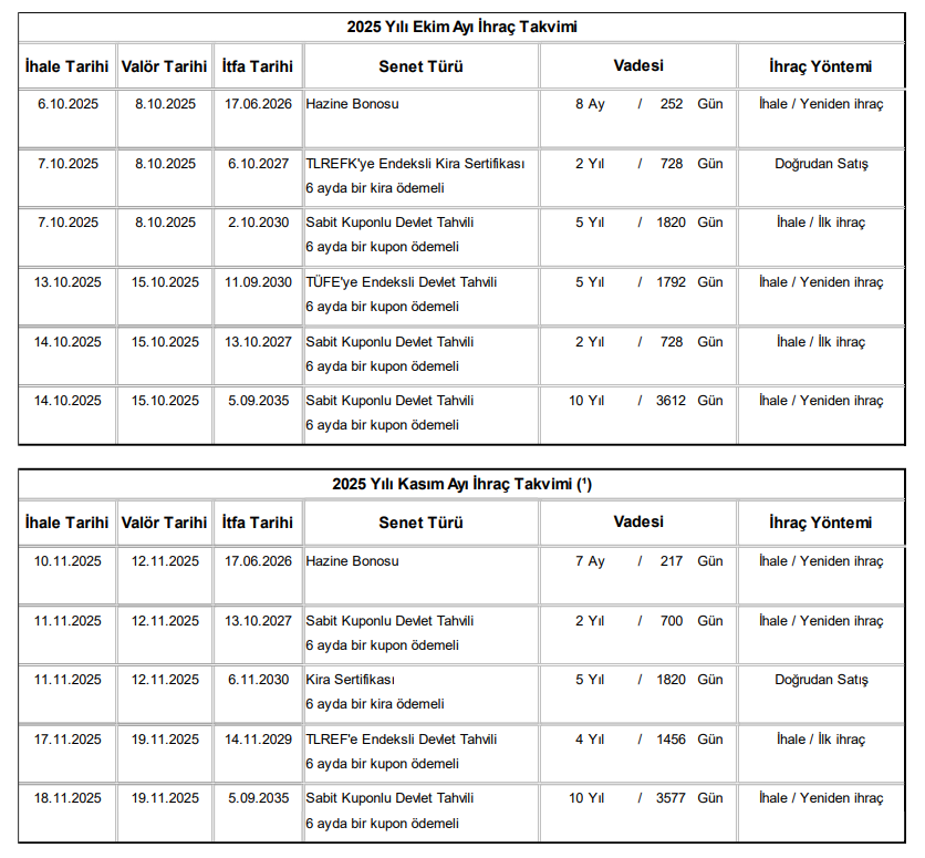 Hazine ve Maliye Bakanlığı, ekim-aralık döneminde 466,8 milyar liralık iç borç servisine karşılık, 538,5 milyar liralık iç borçlanmaya gidecek. Bakanlık, gelecek 3 aylık döneme ilişkin iç borçlanma stratejisini açıkladı. Buna göre Hazine, söz konusu dönemde 466,8 milyar liralık iç borç servisine karşılık 538,5 milyar liralık iç borçlanma yapacak. Bu çerçevede Hazine; 📌 Ekim ayında toplam 263,6 milyar TL’lik iç borç servisine karşılık toplam 290,1 milyar TL’lik iç borçlanma,. 📌 Kasım ayında toplam 95,0 milyar TL’lik iç borç servisine karşılık toplam 117,6 milyar TL’lik iç borçlanma, 📌 Aralık ayında toplam 108,2 milyar TL’lik iç borç servisine karşılık toplam 130,8 milyar TL’lik iç borçlanma yapılmasını planladı. Hazine'nin Ekim - Aralık 2025 döneminde gerçekleştirilecek ihraçlara ilişkin paylaştığı bilgiler şöyle oldu: Kaynak: Hazine ve Maliye Bakanlığı