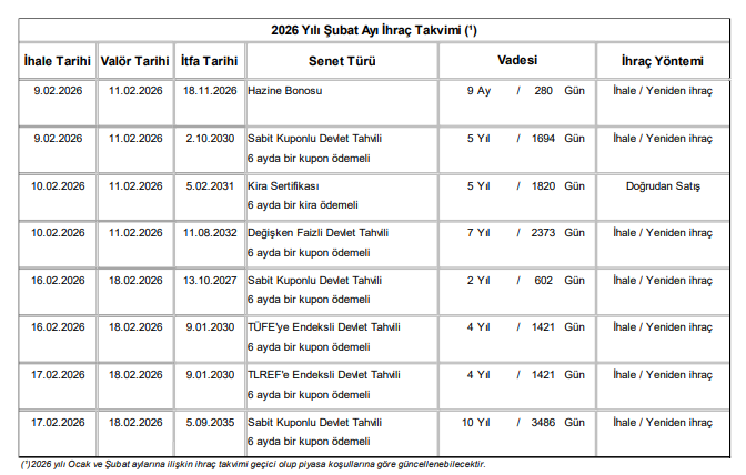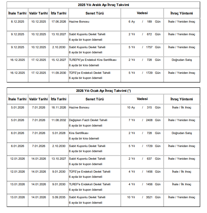 Hazine ve Maliye Bakanlığı, Aralık 2025-Şubat 2026 döneminde 1 trilyon 336,5 milyar liralık iç borç servisine karşılık 1 trilyon 249,8 milyar liralık iç borçlanmaya gidecek. Bakanlık, gelecek 3 aylık döneme ilişkin iç borçlanma stratejisini açıkladı. Buna göre Hazine, söz konusu dönemde 1 trilyon 336,5 milyar liralık iç borç servisine karşılık 1 trilyon 249,8 milyar liralık iç borçlanma yapacak. Bu çerçevede Hazine; 📌Aralık ayında toplam 109,6 milyar TL’lik iç borç servisine karşılık toplam 124,2 milyar TL’lik iç borçlanma, 📌Ocak ayında toplam 606,4 milyar TL’lik iç borç servisine karşılık toplam 542,6 milyar TL’lik iç borçlanma, 📌Şubat ayında toplam 620,5 milyar TL’lik iç borç servisine karşılık toplam 583 milyar TL’lik iç borçlanma yapacak. Hazine'nin Aralık 2025 – Şubat 2026 döneminde gerçekleştirilecek ihraçlar ile söz konusu ihraçlara ilişkin açıklamaları ise şöyle: Kaynak: Hazine ve Maliye Bakanlığı