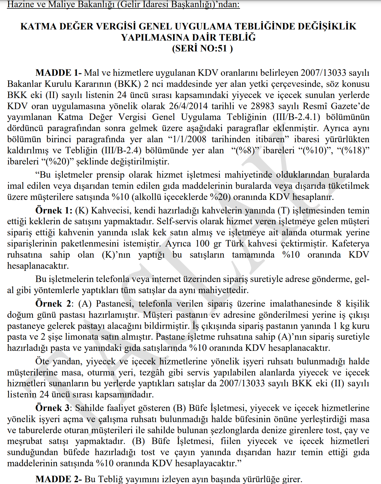 Hazine ve Maliye Bakanlığı, GİB'de yayımlanan taslak sonrası açıklama yaparak, yüzde 8 olan KDV oranın yüzde 10’a, yüzde 18 olan KDV oranının da yüzde 20’ye Temmuz 2023 tarihi itibarıyla çıkarıldığını ancak bazı işletmelerin bu oranları istismar ettiğini belirtti. Açıklamada, yeni tebliğ ile söz konusu istismarın önüne geçilmek için adım atıldığı aktarıldı. Gelirler İdaresi Başkanlığı'nın yayımladığı Katma Değer Vergisi Genel Tebliğinin yiyecek ve içecek sunulan yerlerde KDV oranını düzenleyen maddesinde değişiklik yapılacağı yönündeki açıklaması, bu işletmelerde KDV'ye zam yapıldığı yönünde anlaşılınca Hazine ve Maliye Bakanlığı bir açıklama yayımlayarak söz konu iddialara açıklık getirdi. GİB'in tebliği işletmelere uyarı niteliğinde Bakanlıktan yapılan açıklamada, yiyecek ve içecek satılan yerlerde yüzde 8 olan KDV oranının yüzde 10’a, yüzde 18 olan KDV oranının da yüzde 20’ye Temmuz 2023'te çıkarıldığına dikkat çekilerek, söz konusu KDV oranlarının bazı işletmelerce istismar edildiği ve GİB tarafından yayımlanan yeni tebliği ile buna karşı önlem alındığı aktarıldı. Bakanlığın açıklamasında şöyle denildi: "Gıdadaki KDV oranının düşük olması, başka sektörler tarafından istismar ediliyor. Hazine ve Maliye Bakanlığı, gıdalarda ve yeme içme hizmetinde %8 olan KDV oranını 2022 yılında gıdalar için yüzde 1’e indirdi. O tarihten sonra bu alan suistimal edilmeye başlandı. Gıdadaki KDV oranının yüzde 1 olması, yeme içme sektöründe KDV oranının yüzde 10 olması nedeniyle yeme içme sektöründe bulunan lokantaların bir kısmı, bu alanı istismar ediyor ve rekabet eşitliğini bozuyor. Lokanta veya kafelerin et, su, meyve suyu gibi ürünler satılmış göstererek, yeme içme hizmeti karşılığında yüzde 10 KDV hesaplamaları gerekirken sadece gıda malzemesi satıyormuş gibi yüzde 1 KDV oranından fiş veya fatura çıkışı yaptıkları tespit edildi. 41 bin mükellef denetlendi Hazine ve Maliye Bakanlığı bu konudaki yoklamaları ve denetimleri artırdı ve yaklaşık 41 bin mükellefi KDV oran uyumsuzluğu yönünden denetledi. Diğer taraftan denetimler sonucunda bazı marketlerin temizlik malzemesi sattıkları halde gıda malzemesi satmış gibi göstermek suretiyle KDV oranını yüzde 20 yerine yüzde 1 olarak hesapladıkları da tespit edildi. Hazine ve Maliye Bakanlığı, istismarın önüne geçmek ve bu konudaki tereddütleri gidermek maksadıyla Tebliğ Taslağını internet sitesinde yayınladı. Tebliğ taslağına göre, hizmet sunan lokanta, kafe, pastane gibi işletmeler kendilerinin hazırlayıp sundukları yiyecek ve içecekler ile dışarıdan temin edilerek buralarda sattıkları ürünler için %10 oranında KDV hesaplayacaklar. Bu işletmelerin telefonla veya internet üzerinden sipariş suretiyle adrese gönderme, gel-al gibi yöntemlerle yaptıkları tüm satışların da aynı mahiyette olduğu açıklanmaktadır. Öte yandan, yiyecek ve içecek hizmetlerine yönelik işyeri ruhsatı bulunmadığı halde müşterilerine masa, oturma yeri, tezgâh gibi servis yapılabilen alanlarda yiyecek ve içecek hizmetleri sunanların bu yerlerde yaptıkları satışlar da bu kapsamda olduğu belirtilmektedir. Ayrıca Tebliğ Taslağında konu hakkında açıklayıcı örnekler de yer almaktadır." Kaynak: GİB Öte yandan GİB üzerinden paylaşılan konuyla ilgili basın duyurusuna, "Mevcut durumda uygulanan KDV oranlarında (%1, %10 ve %20) herhangi bir artış yapılmamıştır." ifadeleri de eklendi.
