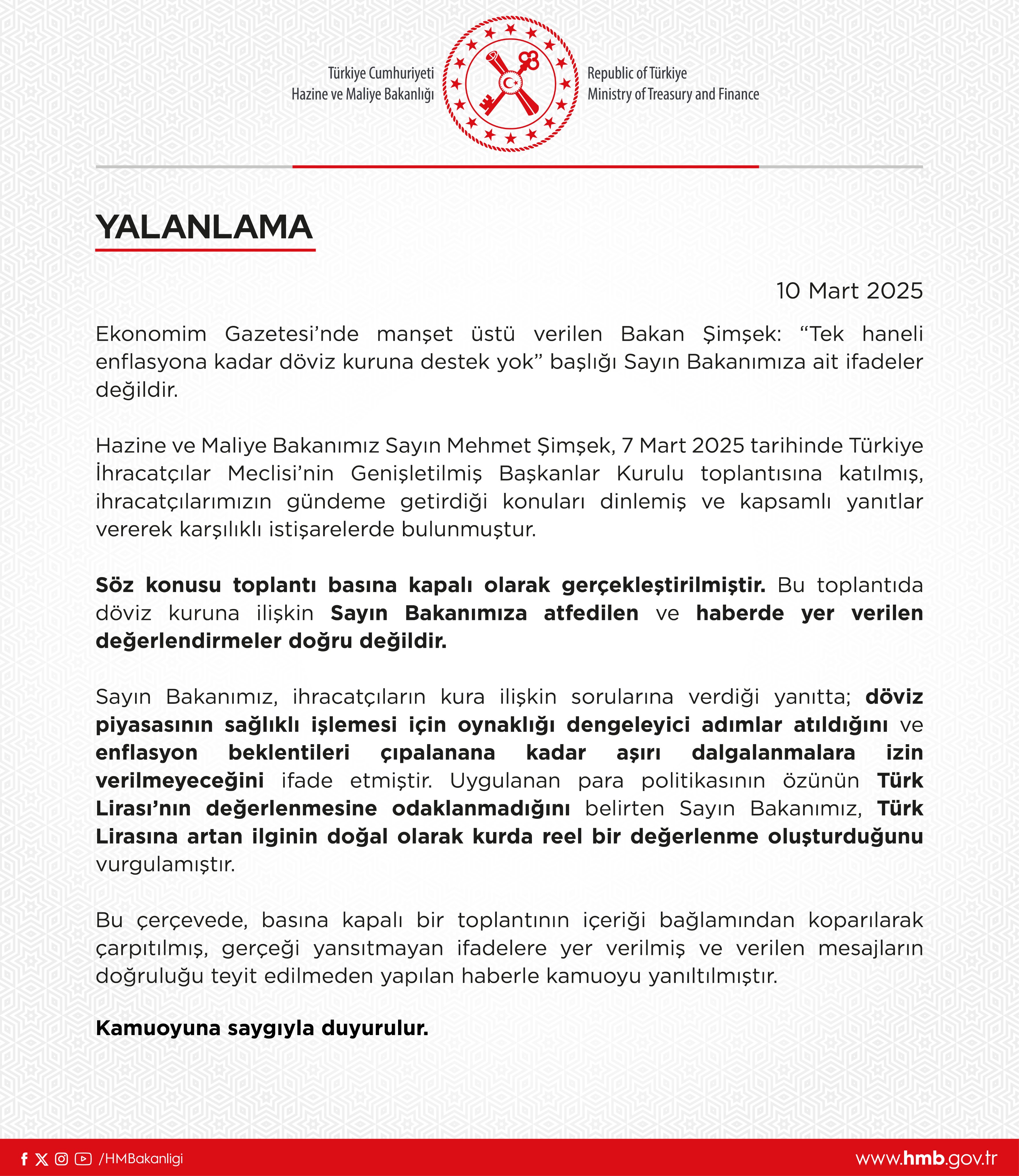 Hazine ve Maliye Bakanlığı, Bakan Şimşek’in "tek haneli enflasyona kadar döviz kuruna destek verilmeyeceği" yönünde bir ifadesinin olmadığını açıkladı. İstanbul’da Türkiye İhracatçılar Meclisi (TİM) Dış Ticaret Kompleksi binasında TİM Genişletilmiş Başkanlar Kurulu Toplantısı’na katılan Şimşek, ekonomi yönetiminin yaptığı çalışmaları ihracatçılara anlatırken, ihracatçıların da taleplerini dinlemişti. Basına kapalı gerçekleştirilen toplantının ardından ise Bakan Şimşek'in “Enflasyon tek haneye düşene kadar mevcut kur politikamıza devam edeceğiz” ifadelerini kullandığı öne sürülmüştü. Bu iddiaların ardından Hazine ve Maliye Bakanlığı ilgili söylemlerin Bakan Şimşek'e ait ifadeler olmadığını açıkladı. Bakanlık tarafından yapılan açıklamada şöyle denildi: "Ekonomim Gazetesi’nde manşet üstü verilen Bakan Şimşek: “Tek haneli enflasyona kadar döviz kuruna destek yok” başlığı Sayın Bakanımıza ait ifadeler değildir. Hazine ve Maliye Bakanımız Sayın Mehmet Şimşek, 7 Mart 2025 tarihinde Türkiye İhracatçılar Meclisi’nin Genişletilmiş Başkanlar Kurulu toplantısına katılmış, ihracatçılarımızın gündeme getirdiği konuları dinlemiş ve kapsamlı yanıtlar vererek karşılıklı istişarelerde bulunmuştur. Söz konusu toplantı basına kapalı olarak gerçekleştirilmiştir. Bu toplantıda döviz kuruna ilişkin Sayın Bakanımıza atfedilen ve haberde yer verilen değerlendirmeler doğru değildir. Sayın Bakanımız, ihracatçıların kura ilişkin sorularına verdiği yanıtta; döviz piyasasının sağlıklı işlemesi için oynaklığı dengeleyici adımlar atıldığını ve enflasyon beklentileri çıpalanana kadar aşırı dalgalanmalara izin verilmeyeceğini ifade etmiştir. Uygulanan para politikasının özünün Türk Lirası’nın değerlenmesine odaklanmadığını belirten Sayın Bakanımız, Türk Lirasına artan ilginin doğal olarak kurda reel bir değerlenme oluşturduğunu vurgulamıştır. Bu çerçevede, basına kapalı bir toplantının içeriği bağlamından koparılarak çarpıtılmış, gerçeği yansıtmayan ifadelere yer verilmiş ve verilen mesajların doğruluğu teyit edilmeden yapılan haberle kamuoyu yanıltılmıştır." Kaynak: Hazine ve Maliye Bakanlığı - X