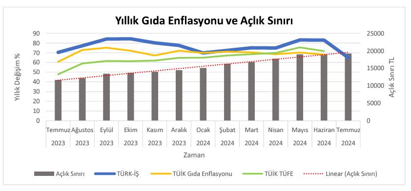 Türk-İş verilerine göre haziranda %0,05 artış ile durma noktasına gelen gıda enflasyonu temmuz ayında aylık bazda %1,35 artış kaydederek yeniden ivme kazandı. Türk-İş, temmuz ayı açlık ve yoksulluk sınırı araştırmasının sonuçlarını açıkladı. Türk-İş verilerine göre Ankara’da yaşayan dört kişilik bir ailenin sağlıklı, dengeli ve yeterli beslenebilmesi için yapması gereken aylık gıda harcaması tutarını gösteren açlık sınırı 19 bin 234 TL'ye yükseldi. Açlık sınırı haziranda 18 bin 979 TL düzeyindeydi. Böylelikle halen 17 bin 2 TL olarak uygulanan asgari ücret ile açlık sınırı arasındaki makas 2 bin 232 TL'ye çıkmış oldu. Gıda harcaması ile giyim, konut (kira, elektrik, su, yakıt), ulaşım, eğitim, sağlık ve benzeri ihtiyaçlar için yapılması zorunlu diğer aylık harcamalarının toplam tutarını ifade eden yoksulluk sınırı ise temmuzda 62 bin 652 TL'ye yükseldi. Haziranda yoksulluk sınırı 61 bin 820 TL seviyesindeydi. Gıda enflasyonu yeniden ivmelendi Türk-İş verilerine göre gıda enflasyonu ise aylık %1,35, on iki aylık %64,99, yıllık ise ortalama %81,16 artış kaydetti. Böylelikle haziranda %0,05 artış ile durma noktasına gelen gıda enflasyonunun yeniden ivme kazandığı görüldü. Kaynak: Türk-İş Türk-iş’ten fiyat artışlarına ilişkin yapılan değerlendirme ise şöyle oldu: “Başta dar ve sabit gelirli çalışanlar ve emekliler olmak üzere neredeyse toplumun tüm kesimleri için insan onuruna yaraşır şartlarda yaşantılarını sürdürebilmeleri her geçen gün daha da zorlaşmaktadır. Konfederasyonumuz çalışanların geçim koşullarını ve temel ihtiyaç maddelerindeki fiyat değişikliğinin aile bütçesine yansımalarını belirlemek amacıyla bu çalışmayı ortaya koymuştur. Temmuz ayı itibarıyla bekâr bir çalışanın yaşama maliyeti ile net asgari ücret (vergi kesintisi olmadan) arasındaki fark 7.900 TL olmuştur. Ailede çalışan sayısının genelde tek kişi olduğu ve ek bir gelirin söz konusu olmadığı durumlarda, elde edilen ücret geliri ailenin temel ihtiyaçlarını karşılamaktan uzak kalmakta ve ücretlerin yetersizliği tartışma konusu olmaktadır. Gıda harcaması tutarına yılbaşına göre gelen ek yük 4.185 TL olmuştur. Tüm temel harcamalar için yapılması gereken harcama tutarı ise son yedi ayda 13.633 TL artış göstermiştir. Mevcut ekonomik ortamda emekçilerin alım gücü her geçen gün daha da zayıflamaktadır. Gelir artışlarında insan onuruna yaraşır bir tutar belirlenmediği sürece çalışanlar ve emekliler yoksullaşmaya devam edecektir.” Kaynak: Türk-İş [news_id:741032] [news_id:741094]