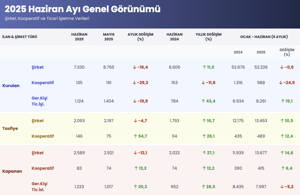Türkiye'de kurulan şirket sayısı, haziranda bir önceki aya göre yüzde 16,4 azalarak 7 bin 330, kapanan şirket sayısı yüzde 12,1 azalışla 2 bin 569 oldu. Türkiye Odalar ve Borsalar Birliği (TOBB), haziran ayına ilişkin kurulan-kapanan şirket istatistiklerini açıkladı. Buna göre, haziranda kurulan şirket sayısı, mayısa kıyasla yüzde 16,4 azalışla 8 bin 765'ten 7 bin 330'a geriledi. Aynı dönemde kapanan şirket sayısı da yüzde 12,1 azalarak 2 bin 569 oldu. Mayısta 2 bin 921 şirket kapanmıştı. Haziranda kurulan şirket sayısı, geçen yılın aynı ayına göre yüzde 11, kapanan şirket sayısı da yüzde 27,1 artış gösterdi. Haziranda bir önceki aya göre kurulan şirket sayısı yüzde 16,4, gerçek kişi ticari işletme sayısı yüzde 19,9, kooperatif sayısı yüzde 29,3 azalış gösterdi. Aynı dönemde kapanan şirket sayısı yüzde 12,1 azalırken, kooperatif sayısı yüzde 12,2, gerçek kişi ticari işletme sayısı yüzde 20,3 arttı. Haziranda geçen yılın aynı ayına göre kurulan gerçek kişi ticari işletme sayısı yüzde 43,4, şirket sayısı yüzde 11 artarken, kooperatif sayısı yüzde 11,8 azaldı. Bu dönemde kapanan şirket sayısında yüzde 27,1, kooperatif sayısında yüzde 12,2, gerçek kişi ticari işletme sayısında yüzde 28,5 artış kayıtlara geçti. [news_id:777296]