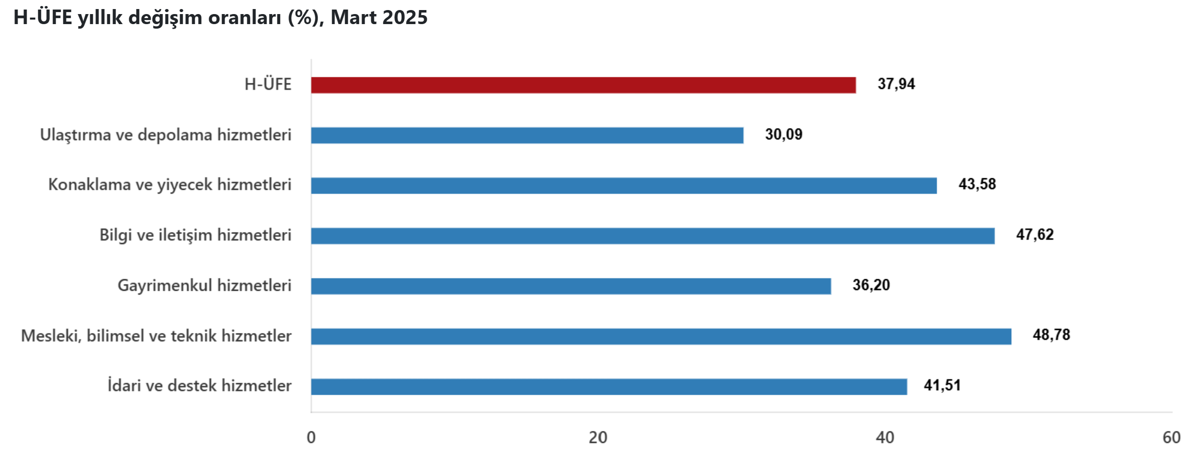 Hizmet Üretici Fiyat Endeksi (H-ÜFE), martta aylık bazda yüzde 2,25, yıllık bazda yüzde 37,94 artış gösterdi. Türkiye İstatistik Kurumu (TÜİK), mart ayına ilişkin H-ÜFE verilerini açıkladı. Buna göre, H-ÜFE, martta bir önceki aya kıyasla yüzde 2,25, geçen yılın aralık ayına göre yüzde 13,78, geçen yılın aynı ayına göre yüzde 37,94 ve 12 aylık ortalamalara göre yüzde 55,7 yükseldi. Endeks, geçen yılın aynı ayına göre, ulaştırma ve depolama hizmetlerinde yüzde 30,09, konaklama ve yiyecek hizmetlerinde yüzde 43,58, bilgi ve iletişim hizmetlerinde yüzde 47,62, gayrimenkul hizmetlerinde yüzde 36,2, mesleki, bilimsel ve teknik hizmetlerde yüzde 48,78, idari ve destek hizmetlerinde yüzde 41,51 artış kaydetti. H-ÜFE, bir önceki aya göre ulaştırma ve depolama hizmetlerinde yüzde 2,2, konaklama ve yiyecek hizmetlerinde yüzde 2,7, bilgi ve iletişim hizmetlerinde yüzde 1,92, gayrimenkul hizmetlerinde yüzde 2,96, mesleki, bilimsel ve teknik hizmetlerde yüzde 2,45, idari ve destek hizmetlerinde yüzde 1,72 arttı. Kaynak: TÜİK [news_id:770493]