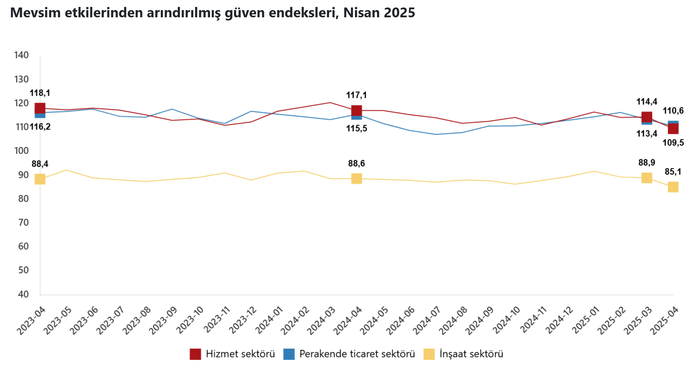 Güven endeksi, nisanda geçen aya kıyasla hizmet sektöründe yüzde 4,3, perakende ticaret sektöründe yüzde 2,5 ve inşaat sektöründe yüzde 4,2 azaldı. Türkiye İstatistik Kurumu (TÜİK), nisan ayına ilişkin hizmet, perakende ticaret ve inşaat güven endekslerini açıkladı. Buna göre, mevsim etkilerinden arındırılmış güven endeksi nisanda aylık bazda hizmet sektöründe yüzde 4,3 gerileyerek 109,5 oldu. Perakende ticaret sektöründe ise yüzde 2,5 azalarak 110,6, inşaat sektöründe yüzde 4,2 gerileyerek 85,1 değerini aldı. Hizmet sektöründe nisanda bir önceki aya kıyasla, son üç aylık dönemde iş durumu yüzde 6,6, son üç aylık dönemde hizmetlere olan talep yüzde 6,9 azalırken, gelecek üç aylık dönemde hizmetlere olan talep beklentisi yüzde 0,8 artış gösterdi. Perakende ticaret sektöründe, son üç aylık dönemde iş hacmi-satışlar yüzde 2,6, mevcut mal stok seviyesi yüzde 2,4, gelecek üç aylık dönemde iş hacmi-satışlar beklentisi de yüzde 2,5 geriledi. İnşaat sektöründe alınan kayıtlı siparişlerin mevcut düzeyi yüzde 1,9, gelecek üç aylık dönemde toplam çalışan sayısı beklentisi yüzde 6,4 azalış gösterdi. Kaynak: TÜİK