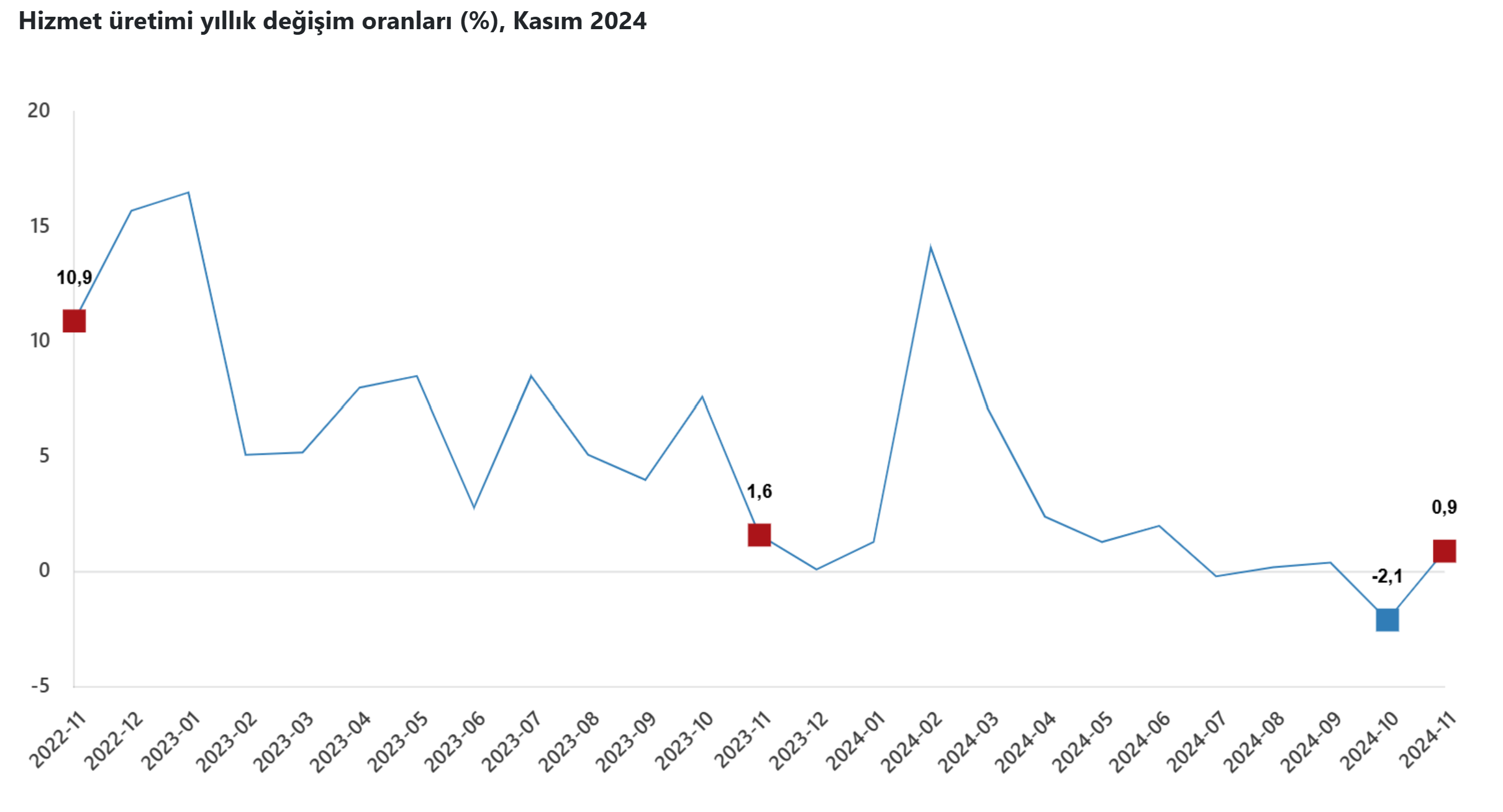 TÜİK verilerine göre hizmet üretim endeksi 2024 yılı kasımda aylık bazda yüzde 0,2 azalırken, yıllık bazda yüzde 0,9 artış kaydetti. Türkiye İstatistik Kurumu (TÜİK) Kasım 2024 dönemine ait Hizmet Üretim Endeksi verilerini açıkladı. Buna göre; hizmet üretim endeksi (2021=100) 2024 yılı Kasım ayında aylık bazda yüzde 0,2 azalırken, yıllık bazda yüzde 0,9 arttı. Kaynak: TÜİK Hizmet üretim endeksi (2021=100) 2024 yılı Kasım ayında bir önceki yılın aynı ayına göre yüzde 0,9 arttı. Aynı ayda ulaştırma ve depolama hizmetleri yüzde 3,0 azaldı, konaklama ve yiyecek hizmetleri yüzde 6,9 arttı, bilgi ve iletişim hizmetleri yüzde 2,5 arttı, gayrimenkul hizmetleri yüzde 11,6 arttı, mesleki, bilimsel ve teknik hizmetler yüzde 3,1 arttı, idari ve destek hizmetleri ise yüzde 2,2 arttı. Hizmet üretim endeksi (2021=100) 2024 yılı Kasım ayında bir önceki aya göre yüzde 0,2 azaldı. Aynı ayda ulaştırma ve depolama hizmetleri yüzde 0,9 azaldı, konaklama ve yiyecek hizmetleri aynı kaldı, bilgi ve iletişim hizmetleri yüzde 0,7 arttı, gayrimenkul hizmetleri yüzde 3,2 arttı, mesleki, bilimsel ve teknik hizmetler yüzde 1,2 arttı, idari ve destek hizmetleri ise yüzde 1,1 azaldı.