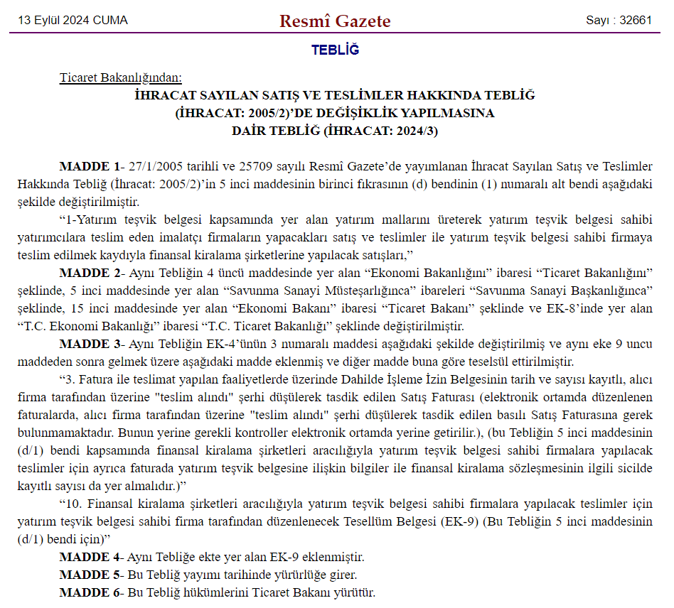 İmalatçı firmaların, yatırım teşvik belgesi sahibi firmaya teslim edilmek kaydıyla finansal kiralama şirketlerine yapılacak satışları, ihracat sayılan satış ve teslimler kapsamına alındı. Ticaret Bakanlığınca hazırlanan İhracat Sayılan Satış ve Teslimler Hakkında Tebliğde Değişiklik Yapılmasına Dair Tebliğ, Resmi Gazete'de yayımlanarak yürürlüğe girdi. Önceki tebliğde yatırım teşvik belgesi kapsamında yer alan yatırım mallarını üreterek yatırım teşvik belgesi sahibi yatırımcılara teslim eden imalatçı firmaların satış ve teslimleri, ihracattan sayılan satış ve teslimler arasında yer alıyordu. Yeni tebliğle, imalatçı firmaların yatırım teşvik belgesi sahibi firmaya teslim edilmek kaydıyla finansal kiralama şirketlerine yapılacak satışları da kapsama dahil edildi. Tebliğle ihracat sayılan satış ve teslimler ile ilgili taahhütlerin kapatılması için gerekli bilgi ve belgelerde düzenleme yapıldı. Ayrıca önceki tebliğde yer alan kurum ve kuruluşların isimleri de güncellendi. Kaynak: Resmi Gazete