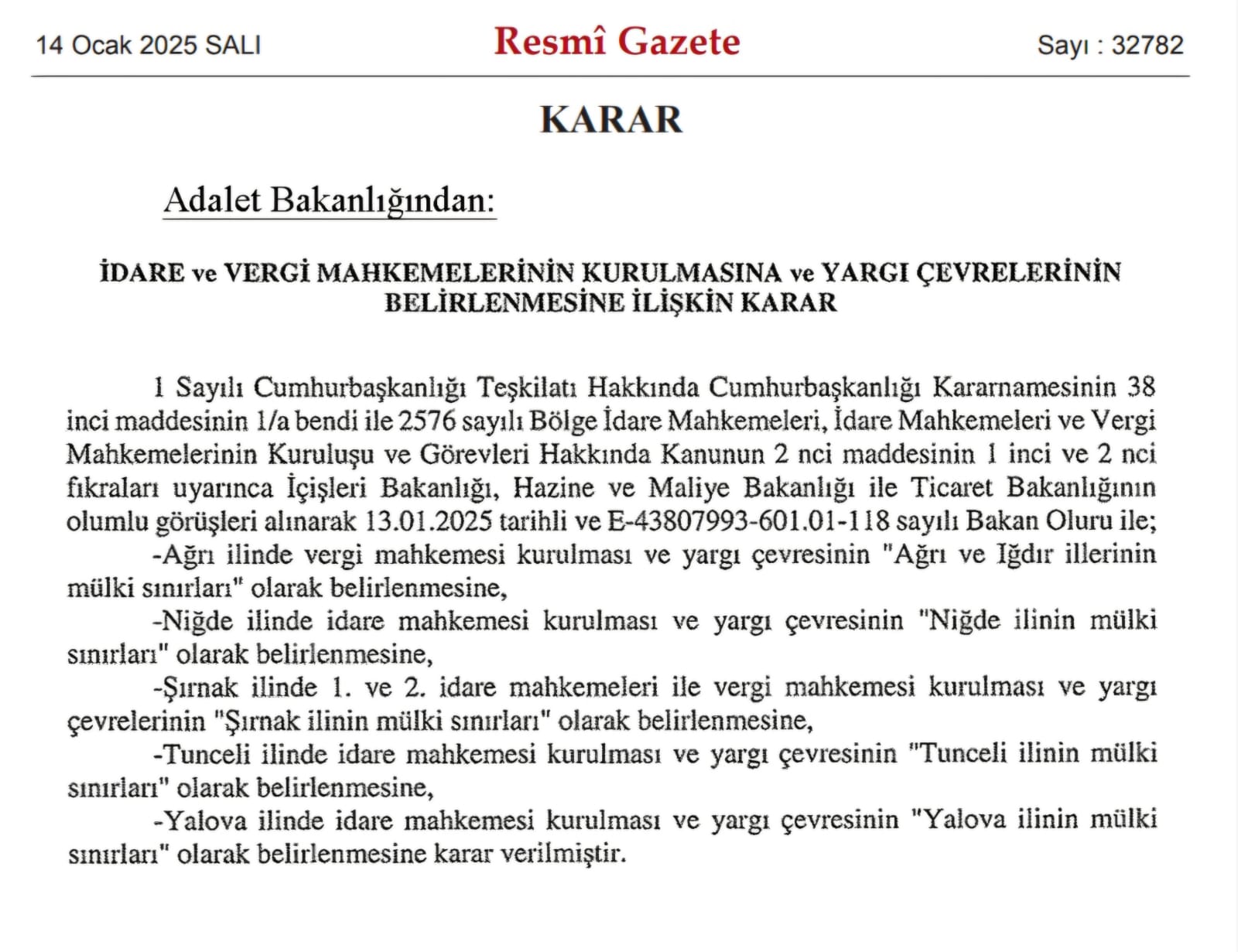 Adalet Bakanlığı kararıyla Ağrı, Şırnak, Tunceli ve Yalova'da İdare mahkemesi; Ağrı ve Şırnak’ta vergi mahkemesi kurulması kararı alındı. Bazı illerde idare ve vergi mahkemelerinin kurulmasına ve yargı çevrelerinin belirlenmesine ilişkin Adalet Bakanlığı kararı, Resmi Gazete'de yayımlandı Buna göre, Ağrı'da vergi mahkemesi kurulması ve yargı çevresinin "Ağrı ve Iğdır illerinin mülki sınırları" olarak belirlenmesi, Niğde'de idare mahkemesi kurulması ve yargı çevresinin "Niğde ilinin mülki sınırları" olarak belirlenmesi, Şırnak'ta 1. ve 2. idare mahkemeleri ile vergi mahkemesi kurulması ve yargı çevrelerinin "Şırnak ilinin mülki sınırları" olarak belirlenmesi, Tunceli'de idare mahkemesi kurulması ve yargı çevresinin "Tunceli ilinin mülki sınırları" olarak belirlenmesi, Yalova'da idare mahkemesi kurulması ve yargı çevresinin "Yalova ilinin mülki sınırları" olarak belirlenmesi kararlaştırıldı. Bakan Tunç'tan açıklama Konuya ilişkin X hesabından yazılı açıklama yapan Adalet Bakanı Yılmaz Tunç, şunları söyledi: “Yargılamaların makul sürede sonuçlandırılması, adaletin gecikmeden tecellisi, mahkemelerde ihtisaslaşmanın sağlanması amacıyla adımlarımızı kararlılıkla atmaya devam ediyoruz. Ülke genelinde idare ve vergi mahkemesi kurulu bulunmayan iller yönünden bölgelerin coğrafi durumlarını ve iş hacmini dikkate alarak yaptığımız çalışmalar sonucunda; Niğde, Şırnak, Tunceli ve Yalova illerimizde idare mahkemesi, Ağrı ve Şırnak illerimizde vergi mahkemesi kurulma kararı Resmi Gazete’de yayımlanarak yürürlüğe girmiştir. Yeni kurulan mahkemelerle birlikte idare mahkemesi kurulu il sayısını 65’e, vergi mahkemesi kurulu il sayısını ise 38’e yükseltmiş olduk. Yeni kurulan mahkemelerimizin ülkemize, milletimize ve yargı teşkilatımıza hayırlı olmasını diliyorum.” Kaynak: Yılmaz Tunç - X