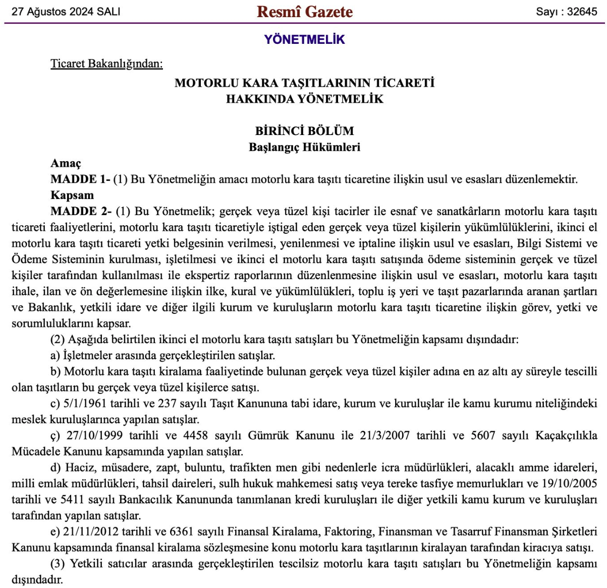 Motorlu taşıtların ticaretine ilişkin yönetmelik, Erdoğan'ın imzasıyla 27 Ağustos 2024 günü Resmi Gazete’de yayımlandı. Yetki belgesi olmayanların satışı ilan vermesine sınırlandırmalar getirildi. Cumhurbaşkanı Recep Tayyip Erdoğan'ın imzasını taşıyan yönetmelik; Bilgi Sistemi ve Ödeme Sisteminin kurulması, işletilmesi ve ikinci el motorlu kara taşıtı satışında ödeme sisteminin gerçek ve tüzel kişiler tarafından kullanılması ile ekspertiz raporlarının düzenlenmesine ilişkin usul ve esasları, motorlu kara taşıtı ihale, ilan ve ön değerlemesine ilişkin ilke, kural ve yükümlülükleri, toplu iş yeri ve taşıt pazarlarında aranan şartları ve Bakanlık, yetkili idare ve diğer ilgili kurum ve kuruluşların motorlu kara taşıtı ticaretine ilişkin görev, yetki ve sorumluluklarını kapsıyor. İnternet üzerinden ikinci el araç satışına yönelik düzenlemelerin de yer aldığı yönetmelikle yetki belgesi olmayanların online platformlarda araç satış ilanı vermesine sınırlamalar getirildi. İkinci el araç satışı için işletmelerin ilan verirken uyması gereken kurallar şu şekilde belirtildi: MADDE 21- a) Yetki belgesi numarası ve yetki belgesindeki işletme adı veya unvanı ile 20 nci maddenin ikinci fıkrasında belirtilen diğer bilgilere güncel olarak yer vermek. b) Üçüncü kişileri yanıltıcı bilgi ve belgelere yer vermemek. c) İkinci el motorlu kara taşıtının satılması, taşıt teslim belgesi süresinin veya ilan verme yetkisinin sona ermesi halinde ilan faaliyetine gecikmeksizin son vermek. İlan platformlarının uyması gereken kurallar ise, MADDE 22- (1) Başkalarına ait motorlu kara taşıtlarının pazarlama ve satışına yönelik ilanlara elektronik ortam sağlayan platformlar aşağıdaki hususlara uymakla yükümlüdür: a) İşletmelerin üyeliğinin veya kaydının yapılmasından ve yenilenmesinden önce Bilgi Sistemi üzerinden yetki belgesi kontrolü yapmak ve yetki belgesine sahip olmayan işletmelerin üyeliğine veya kaydına izin vermemek. b) Gerçek kişinin adı, soyadı ve T.C. kimlik numarası ya da yabancı kimlik numarası ile telefon numarasını; tüzel kişinin unvanı ve telefon numarasını üyelikten veya ilanın yayımlanmasından önce doğrulamak. Her takvim yılında en az bir defa bu bilgilerin doğruluğunu kontrol etmek, güncellenmesini sağlamak ve bu bilgileri beş yıl süreyle saklamak. c) İlan veren gerçek kişilerin ad soyad bilgilerinin tam ad ve soyadı veya tam ad ve soyadın/soyadlarının baş harflerini ve varsa tescil edilmiş işletme adını, tüzel kişilerin ise tescil edilmiş unvanını ve varsa işletme adını içerecek şekilde gösterilmesini sağlamak. ç) İlana konu taşıtın ilan veren kişiye veya ilan verenin gerçek kişi olması halinde birinci ve ikinci derece kan hısımlarına veya eşine ait olduğunu ya da ilanı veren kişinin ilana konu taşıt sahibi tarafından yetkilendirildiğini ilanı yayımlamadan önce Bakanlığın elektronik sistemleri üzerinden doğrulamak. d) İlanlara ilişkin talep ve şikâyetlerin internet tabanlı iletişim yöntemlerinden en az biri ve telefon aracılığıyla iletebilmesi için müşteri hizmetleriyle iletişim imkânı sunmak. Bu talep ve şikâyetlerin etkin şekilde yönetilerek sonuçlandırılmasını sağlamak. e) Piyasa yapısını bozucu veya tüketiciyi yanıltıcı ilanları önlemeye yönelik tedbirleri almak. Araç yetki belgesi nasıl ve nereden alınır? İkinci el araç alımı satımı için gerekli olan ve ticaret il müdürlükleri tarafından verilecek yetki belgeleri için, çalışma ruhsatında ikinci el taşıt ticaretinin bulunması gerekecek. Türkiye Odalar ve Borsalar Birliği ile Türkiye Esnaf ve Sanatkârları Konfederasyonu'ndan alınacak mesleki yeterlilik belgesi ile gümrük ve ticaret il müdürlüklerine başvurulacak ve "yetki belgesi" alınacak. kaynak:hürriyet