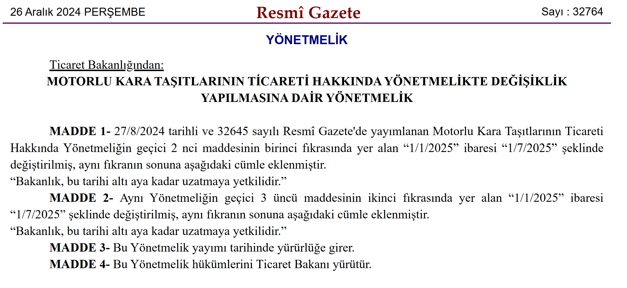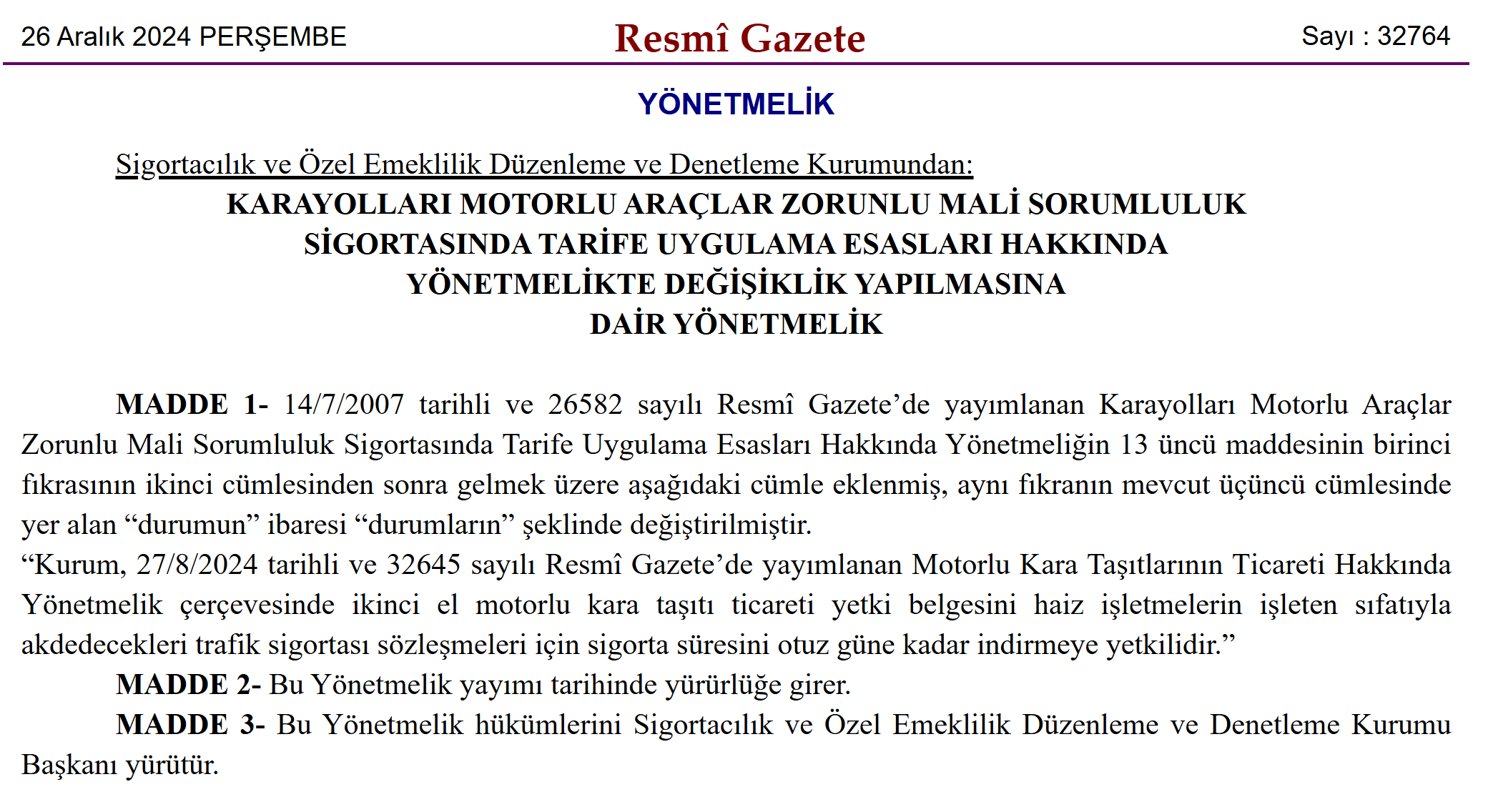 Resmi Gazete’de yayımlanan kararlar ile ikinci el araç satışlarında uygulanan 6 ay ve 6 bin kilometre şartı uzatılırken, araç satışıyla iştigal edenlerin kısa süreli sigorta yaptırabilmesinin önü açıldı. İkinci el araç satışıyla iştigal edenlerin araçlara kısa süreli zorunlu trafik sigortası yapabilmelerinin önü açıldı. İkinci el araç satışında aracın zorunlu trafik sigortasının yeni sahibi için 15 gün süreyle geçerli olmasına yönelik uygulamanın 5 Aralık'ta kaldırılması, ikinci el araç satıcılarının bu yönde şikayetine neden olmuştu. Karayolları motorlu araçlar zorunlu mali sorumluluk sigortasında tarife uygulama esasları hakkında yönetmelikte bu duruma ilişkin düzenleme yapan yönetmelik Resmi Gazete'nin bugünkü sayısında yayımlandı. Buna göre, Sigortacılık ve Özel Emeklilik Düzenleme ve Denetleme Kurumu (SEDDK), ikinci el motorlu kara taşıtı ticareti yetki belgesini haiz işletmelerin işleten sıfatıyla akdedecekleri trafik sigortası sözleşmeleri için sigorta süresini 30 güne kadar indirmeye yetkili kılındı. Kaynak: Resmi Gazete '6 ay-6 bin km' düzenlemesinde süre uzatıldı Resmi Gazete'de yayımlanan kararla, ikinci el araç satışında uygulanan 6 ay-6 bin kilometre ve ilan kısıtlaması uygulamalarının süresi de yeniden uzatıldı. Ticaret Bakanlığı'ndan yapılan açıklamaya göre söz konusu kısıtlamanın bitiş tarihi 1 Temmuz 2025 tarihine çekildi. Düzenlemeyle, sıfır kilometre araçların tescil tarihinden itibaren 6 ay veya 6 bin kilometre geçmedikçe ikinci el olarak satışı yasaklanıyor. Ayrıca ikinci el araçların, üretici veya distribütör tarafından tavsiye edilen güncel satış fiyatının üzerinde bir fiyattan ilana konularak satışının yapılmasının önüne geçilmesi amaçlanıyor. Kaynak: Resmi Gazete