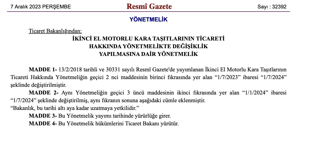 Ticaret Bakanlığı, ikinci el araç satışlarına getirdiği "6 ay ve 6 bin kilometre" kısıtlamasının süresini 1 Temmuz 2024 tarihine kadar uzattı. Ticaret Bakanlığı tarafından hazırlanan "İkinci El Motorlu Kara Taşıtlarının Ticareti Hakkında Yönetmelikte Değişiklik Yapılmasına Dair Yönetmelik", Resmi Gazete'de yayımlandı. Buna göre, ikinci el kara taşıtı ticaretiyle iştigal edenlerin, otomobil ve arazi taşıtlarının pazarlanmasını veya satışını ilk tescil tarihinden itibaren altı ay ve altı bin kilometre geçmedikçe doğrudan veya dolaylı olarak yapamayacaklarına ilişkin kararda yer alan “1 Temmuz 2023” ibaresi "1 Temmuz 2024" olarak değiştirildi. Aynı yönetmelikle, geçici 3. maddede yer alan ikinci el motorlu kara taşıtlarının üretici veya distribütör tarafından tavsiye edilen güncel satış fiyatının üzerinde bir fiyattan ilan yoluyla pazarlamasının 1 Ocak 2024 tarihine kadar yapılamayacağına yönelik düzenleme de 1 Temmuz 2024 tarihine uzatıldı. Maddeye eklenen ibareyle ayrıca Ticaret Bakanlığı'nın bu süreyi 6 aya kadar uzatmasına imkan tanındı. Kaynak: Resmi Gazete [news_id:716998] [news_id:716866]