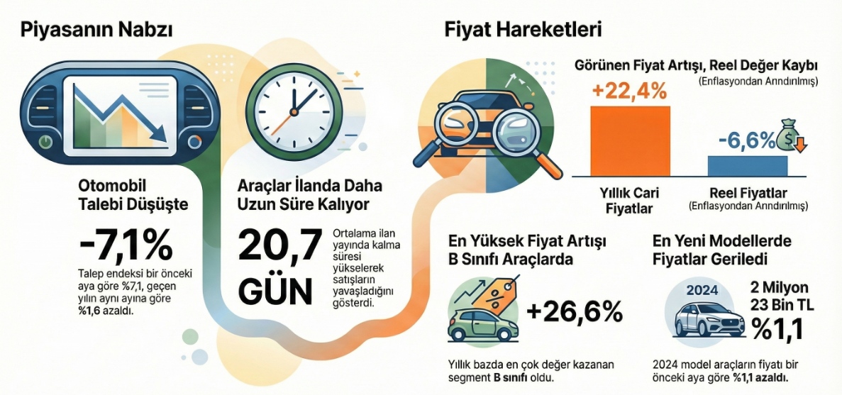 BETAM tarafından hazırlanan "Otomobil Piyasası Görünümü" raporuna göre, enflasyondan arındırılmış reel fiyatlar kasım ayında yüzde 6,6 oranında gerileme kaydetti. Bahçeşehir Üniversitesi Ekonomik ve Toplumsal Araştırmalar Merkezi (BETAM) tarafından sahibindencom'da yayınlanan ilanlardan hareketle hazırlanan ve ikinci el otomobil piyasasının genel durumunu analiz eden "Otomobil Piyasası Görünümü" raporu yayımlandı. Kasım ayı verileri incelenerek hazırlanan rapora göre, otomobil talep endeksi bir önceki aya göre yüzde 7,1, geçen yılın aynı ayına göre ise yüzde 1,6 oranında azaldı. Otomobil piyasasında canlılık göstergesi olarak kullanılan satılık otomobil ilanlarının ne kadar süre yayında kaldıklarını gösteren kapatılan ilan yaşı ise bir önceki aya kıyasla 0,7 gün uzayarak 20,7 gün oldu. Cari fiyatlarda sınırlı artış Enflasyonun etkisinden arındırılmış (reel) fiyatlarda yıllık bazda düşüş devam ederken, cari fiyatlarda artış gözlemlendi. Ortalama satılık otomobil cari fiyatı geçen yılın kasım ayına kıyasla yüzde 22,4 artarak 1 milyon 101 bin TL seviyesine ulaştı. Enflasyondan arındırılmış reel fiyatlar ise aynı dönemde yüzde 6,6 oranında azaldı. Reel fiyatlar bir önceki aya kıyasla ise yüzde 0,5’lik sınırlı bir artış gösterdi. En yüksek artış B sınıfında Fiyat artışları araç sınıfları bazında incelendiğinde, tüm sınıflarda yıllık artış görüldü. Yıllık bazda en yüksek fiyat artışı yüzde 26,6 ile B sınıfında gerçekleşirken, onu yüzde 25,6 ile D sınıfı ve yüzde 25,3 ile C sınıfı takip etti. En düşük artış ise yüzde 21,7 ile E sınıfında gerçekleşti. Ortalama fiyatlar B sınıfında 731 bin 740 TL, C sınıfında 974 bin 458 TL, D sınıfında 1 milyon 406 bin TL ve E sınıfında 2 milyon 266 bin TL oldu. Yılına göre fiyat değişimleri Rapor, model yıllarına göre fiyat değişimlerini de mercek altına aldı. Eski model araçlar (2004-2018) arasında en yüksek yıllık artış yüzde 16,2 ile 2014-2018 grubunda görülürken, en düşük artış yüzde 5,6 ile 2004-2008 grubunda yaşandı. Genç araç grubunda ise 2019 model araçlar yıllık yüzde 17 artışla öne çıktı. İkinci el piyasasının en yeni grubu olan 2024 model araçların fiyatı ise bir önceki aya göre yüzde 1,1 azalarak 2 milyon 23 bin TL seviyesine geriledi. [news_id:786024] [news_id:795415]