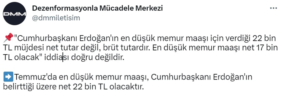 Cumhurbaşkanlığı İletişim Başkanlığı, memur maaşının net 17 bin TL olacağıyla ilgili sosyal medya üzerinden yayılan bilgilerin doğru olmadığını, en düşük memur maaşının net 22 bin TL olacağını duyurdu. Cumhurbaşkanlığı İletişim Başkanlığı, Dezenformasyon Bülteni'nin 71. sayısını yayımladı. Bültende, en düşük memur maaşının net 17 bin TL olacağı iddialarının doğru olmadığı belirtilerek, temmuz ayında en düşük memur maaşının, net 22 bin TL olacağı duyuruldu. Kaynak: Dezenformasyonla Mücadele Merkezi - Twitter