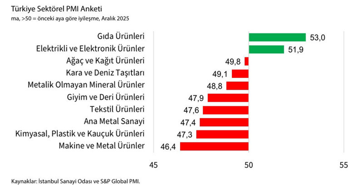 İmalat PMI aralık ayında 48,9 ile son bir yılın en yüksek değerini aldı. Ekonomik büyümenin öncü göstergesi olan imalat sanayi performansında en hızlı ve güvenilir referans kabul edilen İstanbul Sanayi Odası (İSO) Türkiye İmalat PMI (Satın Alma Yöneticileri Endeksi) anketinin Aralık 2025 dönemi sonuçları açıklandı. Eşik değer olan 50,0’nin üzerinde ölçülen tüm rakamların sektörde iyileşmeye işaret ettiği anket sonuçlarına göre manşet PMI aralıkta eşik değer 50,0’nin altında kalsa da aylık bazda üst üste ikinci kez artarak kasımdaki 48,0 seviyesinden 48,9’a yükseldi. Böylece endeks, yılın son ayında faaliyet koşullarındaki bozulmanın oldukça sınırlı kalarak, son 12 ayın en hafif düzeyinde gerçekleştiğine işaret etti. Yeni siparişlerdeki daralma kasıma göre daha ılımlı Bazı firmalar müşteri talebinde iyileşme olduğunu bildirirken, yeni siparişlerdeki yavaşlama Mart 2024’ten bu yana en düşük seviyede kaydedildi. Bununla birlikte yeni siparişler hem genel olarak hem de ihracat özelinde yavaşlamayı sürdürdü. Yeni siparişlerdeki görünüme paralel olarak, üretim de aralık ayında gerilemeye devam etti. Ancak daralma kasım ayına göre daha ılımlı gerçekleşti. Üretimdeki düşüş üst üste 21’inci aya ulaşmakla birlikte bir yılın en hafif düzeyinde kaydedildi. Satın alma faaliyetleri ve istihdamda da düşüşler hız kesti. İstihdamdaki daralma çok sınırlı oldu ve Mart 2025’ten bu yana en düşük oranda gerçekleşti. Öte yandan, aralık ayında hem girdi hem de nihai ürün stokları belirgin şekilde azaldı. Bir önceki anket döneminde yaklaşık son bir yılın en düşük hızına gerileyen girdi maliyetleri ve nihai ürün fiyatları enflasyonu, 2025’in son ayında yeniden ivme kazandı. Ham madde maliyetlerindeki yükselişe bağlı olarak girdi maliyetleri keskin bir şekilde yükseldi. Bunun sonucunda imalatçılar kendi satış fiyatlarını son sekiz ayın en yüksek oranında artırdı. 2026 yılına belirli bir ivmeyle girildi İstanbul Sanayi Odası Türkiye İmalat PMI anket verileri hakkında değerlendirmede bulunan S&P Global Market Intelligence Ekonomi Direktörü Andrew Harker, şunları söyledi: “İstanbul Sanayi Odası Türkiye İmalat PMI manşet endeksinin aralık ayında son bir yılın en yüksek seviyesine ulaşması, imalat sektörünün 2026 yılına belirli bir ivmeyle girdiğine işaret ediyor. Bu durum, önümüzde aylarda büyüme görülebileceğine ilişkin umut veriyor. Anket katılımcılarının bir kısmı, 2025’in sonunda müşteri talebinde iyileşme gözlemlediklerini ve bunun yeni siparişler, üretim ve istihdamdaki daralmanın hız kesmesinde etkili olduğunu belirtti. Enflasyonist baskılar kasım ayında görülen düşük seviyelerinin ardından yeniden güç kazanmış olsa da girdi maliyetleri ve nihai ürün fiyatlarındaki artış oranları son yıllarda zaman zaman görülen yüksek seviyelerin oldukça altında kaldı. Bu nedenle, mevcut fiyat baskılarının talebi kısıtlayıcı bir etki yaratması şimdilik beklenmiyor.” Sınırlı sayıda sektörde büyüme devam etti İstanbul Sanayi Odası Türkiye Sektörel PMI raporu da Aralık 2025 itibarıyla sınırlı sayıda sektörde büyümenin devam ettiğini gösterdi. Anket kapsamında izlenen 10 sektörden yalnızca üçünde üretim artarken iki sektörde yeni siparişler hızlandı. Sektörlerin yarısında ihracatın ve istihdamın artması, anketin olumlu gelişmesi olarak kaydedildi. Öte yandan, kasım ayında hafifleyen enflasyonist baskılar aralık ayında genel olarak güçlendi. Gıda ürünleri yeniden genişleme bölgesine geçerken metalik olmayan mineral ürünler sektöründe büyüme yerini daralmaya bıraktı. Elektrikli ve elektronik ürünler ile ağaç ve kağıt ürünlerinde üretim artmaya devam etti. En keskin üretim daralması makine ve metal ürünlerinde gerçekleşirken, tekstil sektörü ise toparlanma belirtileri gösterdi. Yavaşlamanın en belirgin olduğu sektörler Aralık ayında yeni siparişlerdeki en belirgin yavaşlama makine ve metal ürünlerinde kaydedildi. Yeni siparişlerde iyileşme sadece elektrikli ve elektronik ürünler ile gıda ürünleri sektörleriyle sınırlı kaldı. Gıdadaki artış geçen yılın eylül ayından bu yana en yüksek hızda gerçekleşti. Aralık ayında yeni ihracat siparişleri daha olumlu bir tablo çizdi ve anket kapsamında izlenen 10 sektörün yarısı ihracatta artış gerçekleştirdi. En hızlı büyüme gıda ürünleri sektöründe, en sert yavaşlama ise metalik olmayan mineral ürünlerde gerçekleşti. Aralık ayında istihdam yine beş sektörde artış gösterdi. Çalışan sayılarında en güçlü genişleme elektrikli ve elektronik ürünlerde, en sert daralma ise giyim ve deri ürünlerinde gerçekleşti. Elektrikli ve elektronik ürünler sektöründe girdi maliyetleri enflasyonu aralık ayında keskin bir şekilde hızlanarak Şubat 2024'ten bu yana en yüksek düzeyde kaydedildi. Diğer tüm sektörlerde maliyet artışları kasımdaki ivme kaybının ardından yeniden hızlandı. Yine de bu artışlar elektrikli ve elektronik ürünlerde olduğundan daha hafif seyretti. Nihai ürün fiyatlarında en hızlı artış yine elektrikli ve elektronik ürünler sektöründe kaydedildi. Satış fiyatlarında düşüş gerçekleştiren tek sektör ise giyim ve deri ürünleri oldu. Aralık ayında sektörlerin çoğunda tedarikçilerin teslimat süreleri arttı. Teslimatların hızlandığını bildiren tek sektör, ağaç ve kâğıt ürünleri oldu.