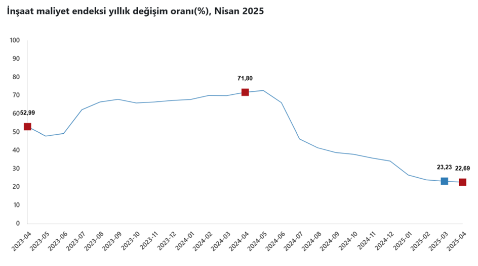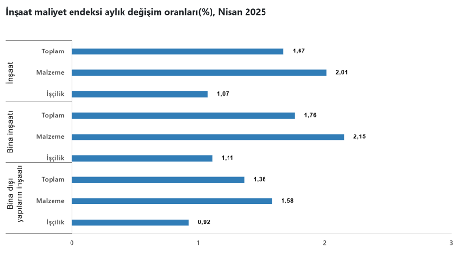 TÜİK'e göre inşaat maliyet endeksi nisanda bir önceki yılın aynı ayına göre yüzde 22,69, bir önceki aya göre yüzde 1,67 oranında arttı. İşçilik endeksinde yıllık artış ise yüzde 31,82 oldu. TÜİK, nisan ayı inşaat maliyet endeksi verilerini açıkladı. İnşaat maliyet endeksi, 2025 yılı Nisan ayında bir önceki aya göre %1,67, bir önceki yılın aynı ayına göre %22,69 arttı. Bir önceki aya göre malzeme endeksi %2,01, işçilik endeksi %1,07 arttı. Ayrıca bir önceki yılın aynı ayına göre malzeme endeksi %18,00, işçilik endeksi %31,82 arttı. Kaynak: TÜİK Bina inşaatı maliyet endeksi, bir önceki aya göre %1,76, bir önceki yılın aynı ayına göre %23,14 arttı. Bir önceki aya göre malzeme endeksi %2,15, işçilik endeksi %1,11 arttı. Ayrıca bir önceki yılın aynı ayına göre malzeme endeksi %18,96, işçilik endeksi %30,93 arttı. Bina dışı yapılar için inşaat maliyet endeksi, bir önceki aya göre %1,36, bir önceki yılın aynı ayına göre %21,22 arttı. Bir önceki aya göre malzeme endeksi %1,58, işçilik endeksi %0,92 arttı. Ayrıca bir önceki yılın aynı ayına göre malzeme endeksi %15,08, işçilik endeksi %35,10 arttı. Kaynak: TÜİK