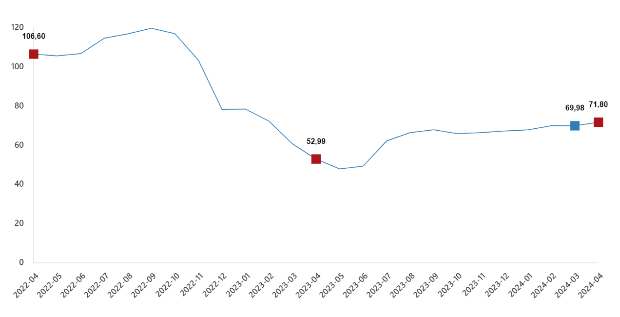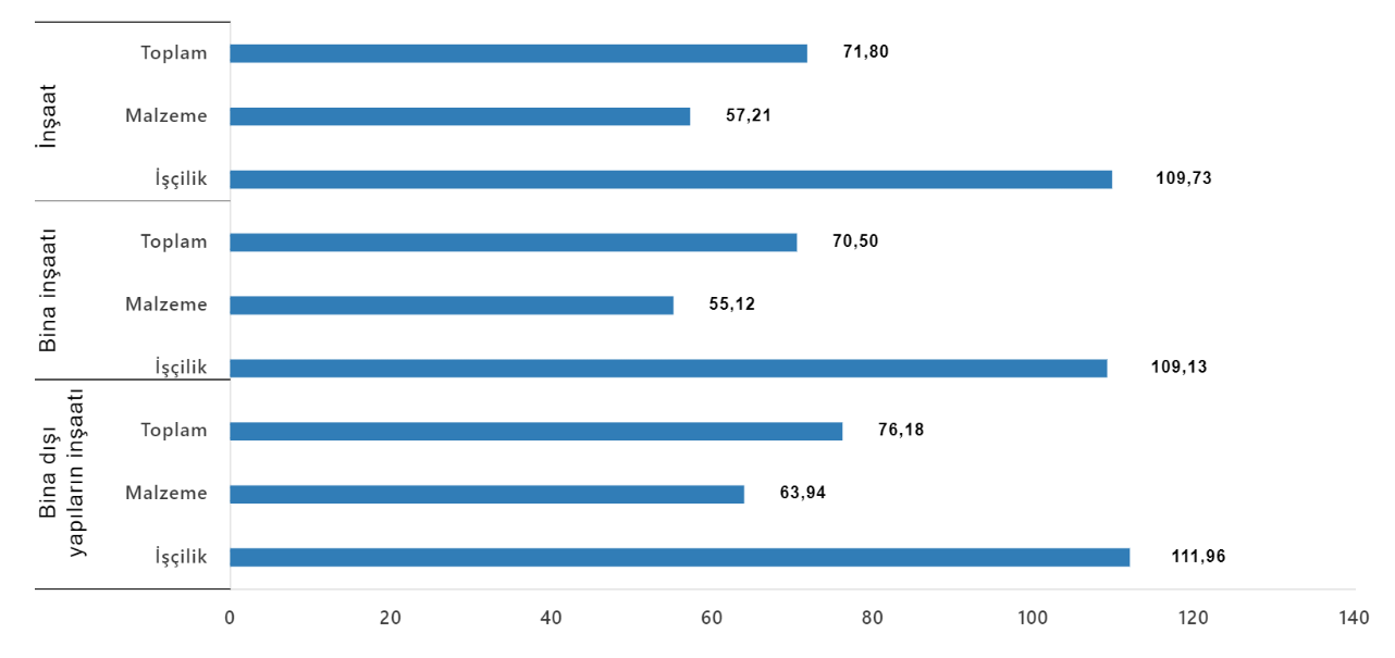 TÜİK'e göre inşaat maliyet endeksi nisanda bir önceki yılın aynı ayına göre yüzde 71,80, bir önceki aya göre yüzde 2,12 oranında arttı. İşçilik endeksinde yıllık artış ise yüzde 109,73 oldu. TÜİK, nisan ayı inşaat maliyet endeksi verilerini açıkladı. İnşaat maliyet endeksi, 2024 yılı Nisan ayında bir önceki aya göre yüzde 2,12, bir önceki yılın aynı ayına göre yüzde 71,80 arttı. Kaynak: TÜİK Bir önceki aya göre malzeme endeksi yüzde 2,71, işçilik endeksi yüzde 0,99 arttı. Ayrıca bir önceki yılın aynı ayına göre malzeme endeksi yüzde 57,21 arttı, işçilik endeksi ise yüzde 109,73 artış kaydetti. Bina inşaatı maliyet endeksi, bir önceki aya göre yüzde 2,14, bir önceki yılın aynı ayına göre yüzde 70,50 arttı. Bir önceki aya göre malzeme endeksi yüzde 2,77, işçilik endeksi yüzde 0,99 arttı. Ayrıca bir önceki yılın aynı ayına göre malzeme endeksi yüzde 55,12, işçilik endeksi yüzde 109,13 arttı. Bina dışı yapılar için inşaat maliyet endeksi, bir önceki aya göre yüzde 2,05, bir önceki yılın aynı ayına göre yüzde 76,18 arttı. Bir önceki aya göre malzeme endeksi yüzde 2,52, işçilik endeksi yüzde 1,01 arttı. Ayrıca bir önceki yılın aynı ayına göre malzeme endeksi yüzde 63,94, işçilik endeksi yüzde 111,96 arttı. Kaynak: TÜİK [news_id:736402]