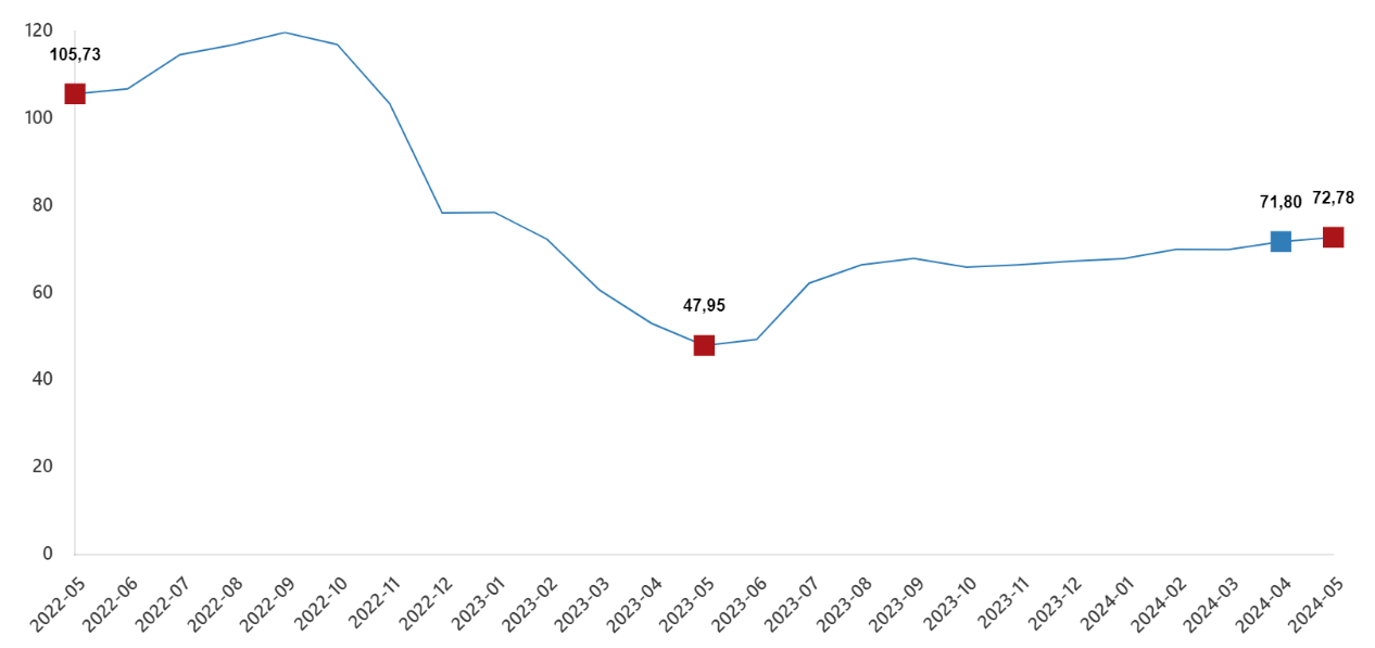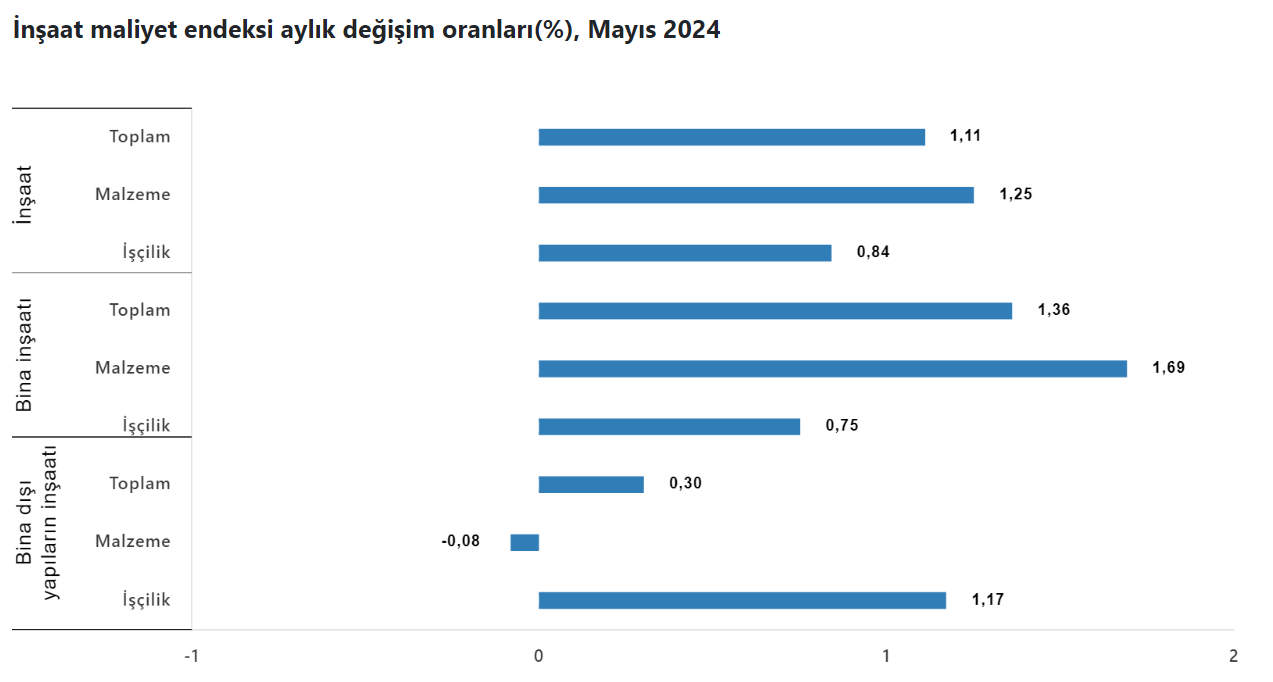 TÜİK'e göre inşaat maliyet endeksi, mayısta aylık bazda yüzde 1,11, yıllık bazda ise yüzde 72,78 artış gösterdi. Bu rakamlar ise inşaat maliyetlerindeki artışın son 16 ayın en yüksek seviyesine çıktığını gösterdi. Türkiye İstatistik Kurumu, mayıs ayına ilişkin inşaat maliyet endeksi verilerini açıkladı. Buna göre endeks, mayısta bir önceki aya kıyasla yüzde 1,11, geçen yılın aynı ayına göre yüzde 72,78 yükseldi. Kaynak: TÜİK Aylık bazda malzeme endeksi yüzde 1,25, işçilik endeksi yüzde 0,84 arttı. Yıllık bazda malzeme endeksi yüzde 58,75, işçilik endeksi de yüzde 108,93 artış kaydetti. Bina inşaatı maliyet endeksi, aylık bazda yüzde 1,36, yıllık bazda yüzde 71,51 yükseliş gösterdi. Aylık bazda malzeme endeksinde yüzde 1,69, işçilik endeksinde de yüzde 0,75 artış görüldü. Yıllık bazda malzeme endeksi yüzde 56,8, işçilik endeksi de yüzde 108,25 yükseldi. Bina dışı yapılar için inşaat maliyet endeksi, aylık bazda 0,3, yıllık bazda 77,1 arttı. Bir önceki aya göre malzeme endeksinde yüzde 0,08 azalırken, işçilik endeksinde yüzde 1,17 artış kaydedildi. Geçen yılın aynı ayına göre malzeme endeksinde yüzde 65,09, işçilik endeksinde yüzde 111,44 yükseliş görüldü. Kaynak: TÜİK [news_id:739151]