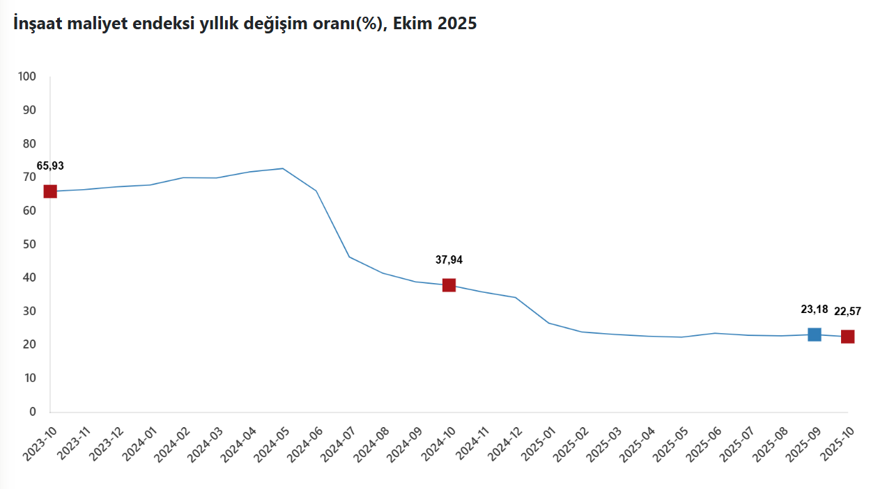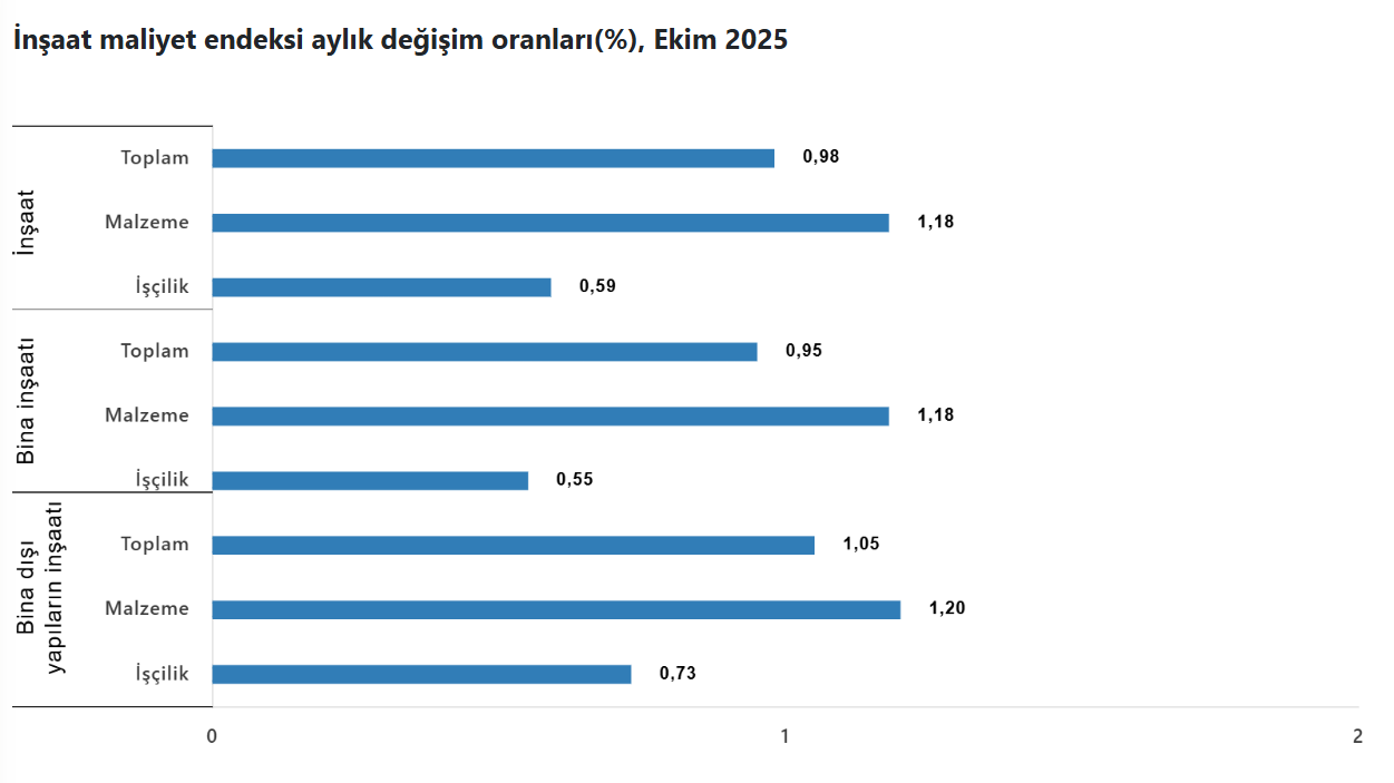 TÜİK'in açıkladığı verilere göre inşaat maliyet endeksi ekim ayında aylık bazda yüzde 0,98, yıllık bazda ise yüzde 22,57 artış kaydetti. Türkiye İstatistik Kurumu (TÜİK), ekim ayına ilişkin inşaat maliyet endeksi verilerini açıkladı. Endeks, ekimde bir önceki aya kıyasla yüzde 0,98, geçen yılın aynı ayına göre yüzde 22,57 yükseldi. Aylık bazda malzeme endeksi yüzde 1,18, işçilik endeksi yüzde 0,59 artış gösterdi. Yıllık bazda da malzeme endeksi yüzde 18,68, işçilik endeksi yüzde 30,49 arttı. Bina inşaatı maliyet endeksi, ekimde bir önceki aya göre yüzde 0,95, geçen yılın aynı ayına kıyasla yüzde 22,29 yükseldi. Bir önceki aya göre malzeme endeksi yüzde 1,18, işçilik endeksi yüzde 0,55 artış kaydetti. Ayrıca geçen yılın aynı ayına göre malzeme endeksinde yüzde 18,42, işçilik endeksinde yüzde 29,94 yükseliş kayıtlara geçti. Bina dışı yapılar için inşaat maliyet endeksi, ekimde bir önceki aya göre yüzde 1,05, geçen yılın aynı ayına kıyasla yüzde 23,48 arttı. Söz konusu yapılarda bir önceki aya göre malzeme endeksi yüzde 1,2, işçilik endeksi yüzde 0,73 yükselirken geçen yılın aynı ayına göre malzeme endeksi yüzde 19,52, işçilik endeksi yüzde 32,46 artış gösterdi. Kaynak: TÜİK [news_id:788044]
