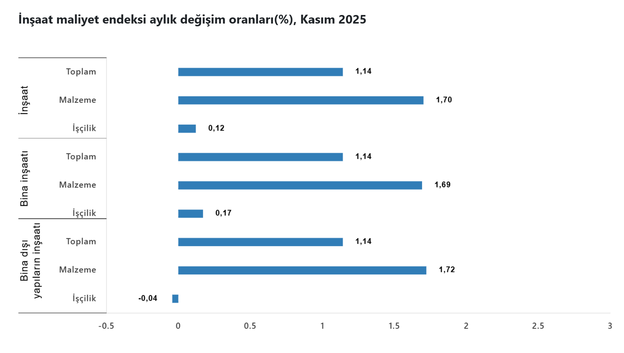 TÜİK'in açıkladığı verilere göre inşaat maliyet endeksi kasım ayında aylık bazda yüzde 1,14, yıllık bazda ise yüzde 23,93 artış kaydetti. Türkiye İstatistik Kurumu (TÜİK), kasım ayına ilişkin inşaat maliyet endeksi verilerini açıkladı. İnşaat maliyet endeksi, 2025 yılı Kasım ayında bir önceki aya göre %1,14 arttı, bir önceki yılın aynı ayına göre %23,93 arttı. Bir önceki aya göre malzeme endeksi %1,70 arttı, işçilik endeksi %0,12 arttı. Ayrıca bir önceki yılın aynı ayına göre malzeme endeksi %20,48 arttı, işçilik endeksi %30,98 arttı. Bina inşaatı maliyet endeksi, bir önceki aya göre %1,14 arttı, bir önceki yılın aynı ayına göre %23,50 arttı. Bir önceki aya göre malzeme endeksi %1,69 arttı, işçilik endeksi %0,17 arttı. Ayrıca bir önceki yılın aynı ayına göre malzeme endeksi %20,03 arttı, işçilik endeksi %30,37 arttı. Bina dışı yapılar için inşaat maliyet endeksi, bir önceki aya göre %1,14 arttı, bir önceki yılın aynı ayına göre %25,33 arttı. Bir önceki aya göre malzeme endeksi %1,72 arttı, işçilik endeksi %0,04 azaldı. Ayrıca bir önceki yılın aynı ayına göre malzeme endeksi %21,90 arttı, işçilik endeksi %33,14 arttı. Kaynak: TÜİK