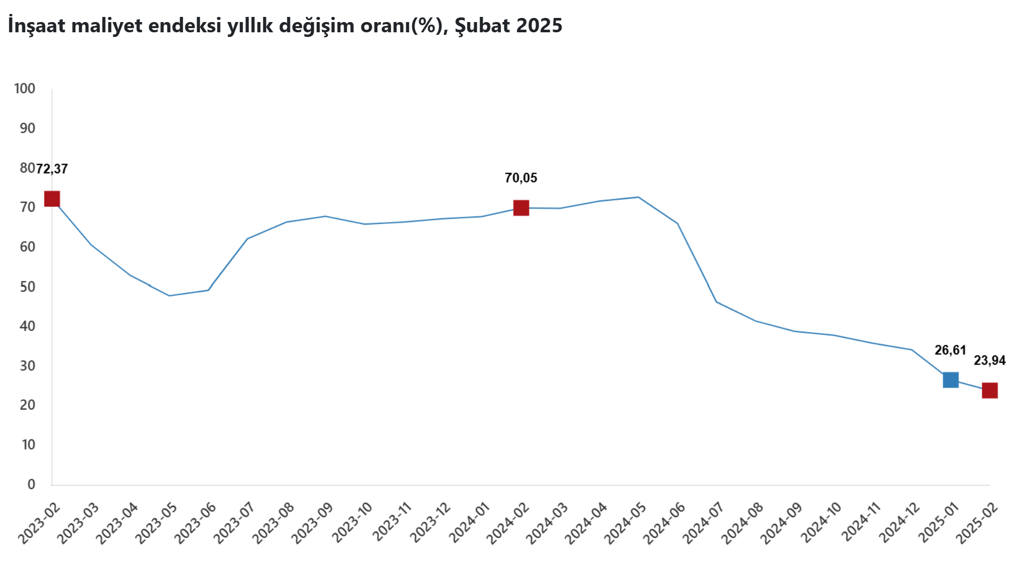İnşaat maliyet endeksi şubatta aylık bazda yüzde 1,24, yıllık bazda yüzde 23,94 artış kaydetti. Türkiye İstatistik Kurumu (TÜİK), şubat ayına ilişkin inşaat maliyet endeksi verilerini açıkladı. Buna göre, endeks şubatta bir önceki aya kıyasla yüzde 1,24, geçen yılın aynı ayına göre yüzde 23,94 yükseldi. Kaynak: TÜİK Aylık bazda malzeme endeksi yüzde 1,99 artarken işçilik endeksi yüzde 0,02 azaldı. Yıllık bazda ise malzeme endeksi yüzde 19,49, işçilik endeksi yüzde 32,38 artış gösterdi. Bina inşaatı maliyet endeksi, şubatta bir önceki aya göre yüzde 1,13, geçen yılın aynı ayına kıyasla yüzde 24,44 yükseliş kaydetti. Bir önceki aya göre malzeme endeksi yüzde 1,97 artarken işçilik endeksi yüzde 0,23 azaldı. Ayrıca geçen yılın aynı ayına göre malzeme endeksi yüzde 20,43, işçilik endeksi yüzde 31,68 yükseldi. Bina dışı yapılar için inşaat maliyet endeksi, şubatta bir önceki aya göre yüzde 1,59, geçen yılın aynı ayına kıyasla yüzde 22,34 artış gösterdi. Söz konusu yapılarda bir önceki aya göre malzeme endeksi yüzde 2,04, işçilik endeksi yüzde 0,74 yükseldi. Geçen yılın aynı ayına göre malzeme endeksi yüzde 16,64, işçilik endeksi yüzde 34,97 artış kaydetti. [news_id:765617]