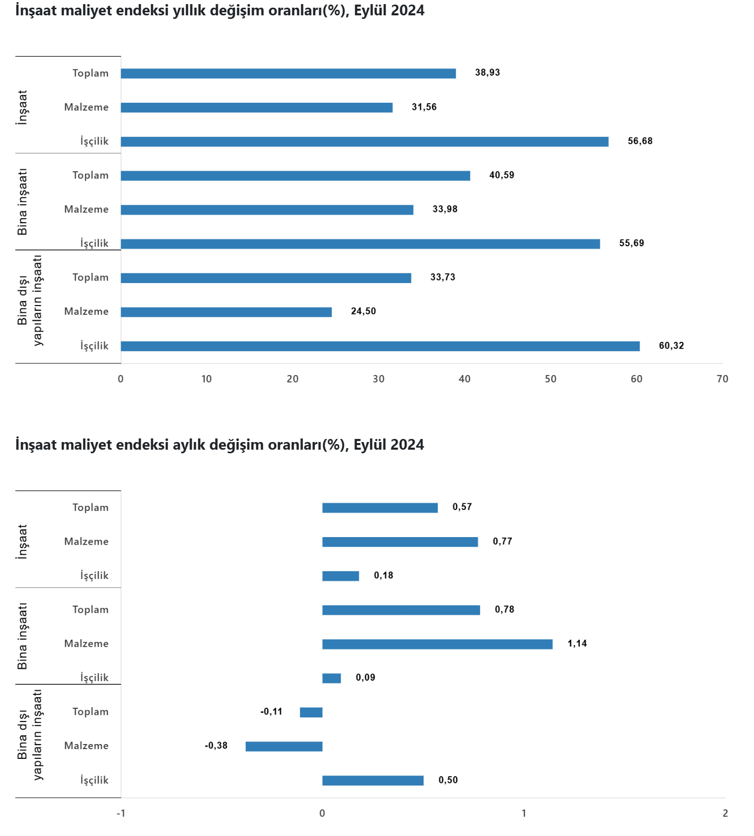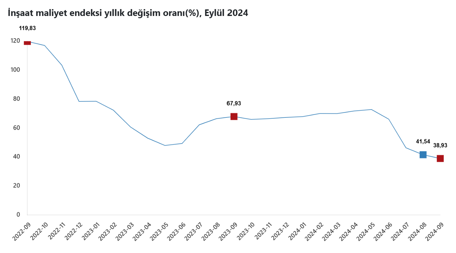 TÜİK verilerine göre inşaat maliyet endeksi eylülde aylık bazda yüzde 0,57, yıllık bazda yüzde 38,93 artış gösterdi. Türkiye İstatistik Kurumu, eylül ayına ilişkin inşaat maliyet endeksi verilerini açıkladı. Buna göre endeks, eylülde bir önceki aya kıyasla yüzde 0,57, geçen yılın aynı ayına göre yüzde 38,93 yükseldi. Kaynak: TÜİK Aylık bazda malzeme endeksi yüzde 0,77, işçilik endeksi yüzde 0,18 arttı. Yıllık bazda malzeme endeksi yüzde 31,56, işçilik endeksi de yüzde 56,68 artış kaydetti. Bina inşaatı maliyet endeksi, aylık bazda yüzde 0,78, yıllık bazda yüzde 40,59 yükseliş gösterdi. Aylık bazda malzeme endeksi yüzde 1,14, işçilik endeksi yüzde 0,09 arttı. Yıllık bazda da malzeme endeksi yüzde 33,98, işçilik endeksi de yüzde 55,69 yükseldi. Bina dışı yapılar için inşaat maliyet endeksi, aylık bazda 0,11 azalırken, yıllık bazda 33,73 artış kaydetti. Bir önceki aya göre malzeme endeksi yüzde 0,38 gerilerken, işçilik endeksinde yüzde 0,5 yükseliş görüldü. Geçen yılın aynı ayına göre malzeme endeksinde yüzde 24,5, işçilik endeksinde yüzde 60,32 artış kayıtlara geçti. Kaynak: TÜİK