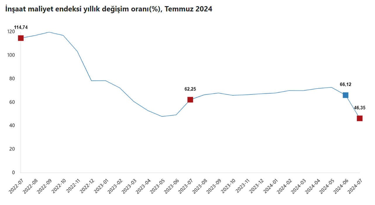 TÜİK verilerine göre inşaat maliyet endeksi temmuz ayında yıllık bazda yüzde 46,35, aylık bazda yüzde 1,91 artış kaydetti. Böylelikle inşaat maliyetlerindeki artış hızı temmuz ayında yavaşlamış oldu. TÜİK, temmuzda ayı İnşaat Maliyet Endeksi verilerini açıkladı. İnşaat maliyet endeksi, 2024 yılı temmuz ayında bir önceki aya göre yüzde 1,91 arttı, bir önceki yılın aynı ayına göre yüzde 46,35 arttı. Kaynak: TÜİK Bir önceki aya göre malzeme endeksi yüzde 2,12 arttı, işçilik endeksi yüzde 1,49 arttı. Ayrıca bir önceki yılın aynı ayına göre malzeme endeksi yüzde 41,01 arttı, işçilik endeksi yüzde 58,40 arttı. Önceki ay inşaat maliyetleri yıllık bazda yüzde 68,12 artış göstermişti. Böylece inşaat maliyetlerinin artış hızı temmuzda gerilemiş oldu. Bina maliyeti Bina inşaatı maliyet endeksi, bir önceki aya göre yüzde 1,53 arttı, bir önceki yılın aynı ayına göre yüzde 46,78 arttı. Bir önceki aya göre malzeme endeksi yüzde 1,69 arttı, işçilik endeksi yüzde 1,24 arttı. Ayrıca bir önceki yılın aynı ayına göre malzeme endeksi yüzde 41,82 arttı, işçilik endeksi yüzde 57,38 arttı. Bina dışı yapıların maliyeti Bina dışı yapılar için inşaat maliyet endeksi, bir önceki aya göre yüzde 3,14 arttı, bir önceki yılın aynı ayına göre yüzde 45,01 arttı. Bir önceki aya göre malzeme endeksi yüzde 3,47 arttı, işçilik endeksi yüzde 2,40 arttı. Ayrıca bir önceki yılın aynı ayına göre malzeme endeksi yüzde 38,58 arttı, işçilik endeksi yüzde 62,18 arttı.