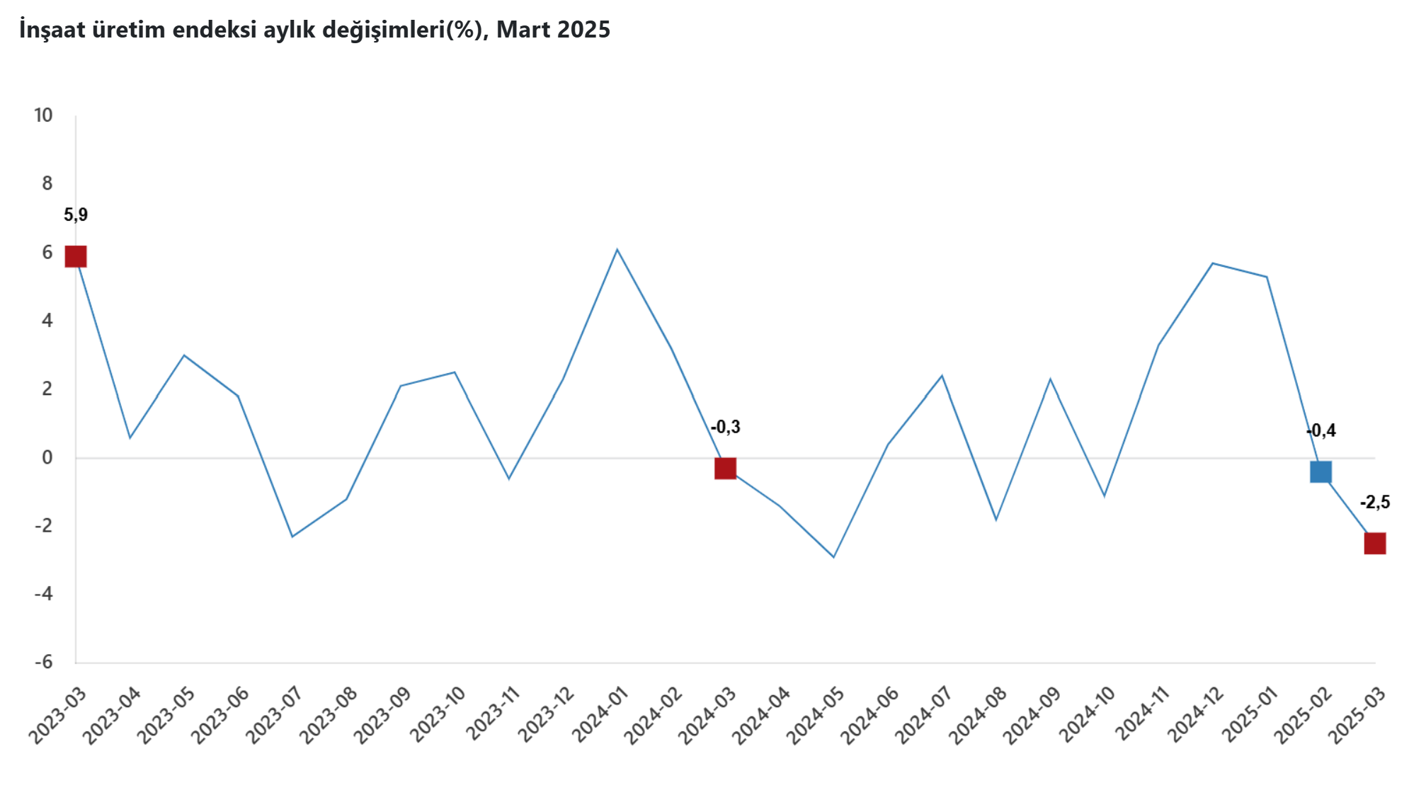 İnşaat üretim endeksi martta aylık bazda yüzde 2,5 gerilemeyle geçtiğimiz yılın mayıs ayından bu yana en büyük düşüşünü kaydetti. Türkiye İstatistik Kurumu (TÜİK), mart ayına ilişkin inşaat üretim endeksini açıkladı. Buna göre, endeks martta yıllık bazda yüzde 10,5 artış kaydetti. İnşaatın alt sektörleri incelendiğinde endeks, martta geçen yılın aynı ayına kıyasla bina inşaatı sektöründe yüzde 12,9, bina dışı yapıların inşaatında yüzde 5,8 ve özel inşaat faaliyetlerinde yüzde 6 yükseldi. İnşaat üretim endeksi martta aylık bazda ise yüzde 2,5 azaldı. Endeks, martta bina inşaatı sektöründe bir önceki aya göre yüzde 3,2, bina dışı yapıların inşaatında yüzde 0,5, özel inşaat faaliyetlerinde yüzde 1,2 azalış gösterdi. Kaynak: TÜİK