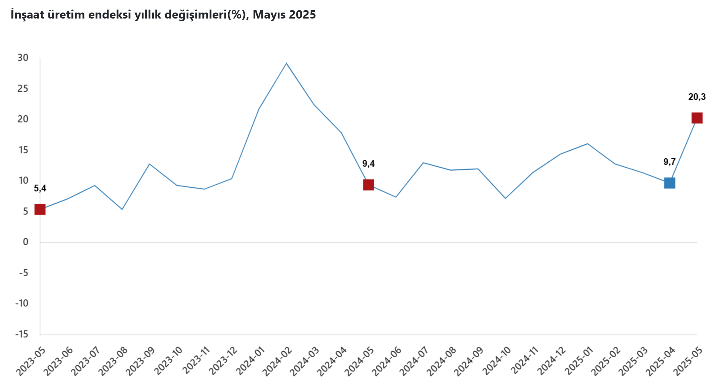 İnşaat üretim endeksi, mayısta yıllık bazda yüzde 20,3 ile son 14 ayın en güçlü artışını kaydetti. Türkiye İstatistik Kurumu (TÜİK), mayıs ayına ilişkin inşaat üretim endeksi verilerini açıkladı. Buna göre, endeks mayısta yıllık bazda yüzde 20,3 artış kaydetti. Kaynak: TÜİK İnşaatın alt sektörleri incelendiğinde endeks, mayısta geçen yılın aynı ayına kıyasla bina inşaatı sektöründe yüzde 23,3, bina dışı yapıların inşaatında yüzde 10,1 ve özel inşaat faaliyetlerinde yüzde 17,4 yükseldi. İnşaat üretim endeksi mayısta aylık bazda ise yüzde 4,8 arttı. Endeks, mayısta bina inşaatı sektöründe bir önceki aya göre yüzde 5,6, bina dışı yapıların inşaatında yüzde 2,7, özel inşaat faaliyetlerinde yüzde 3,4 artış gösterdi. [news_id:775437]