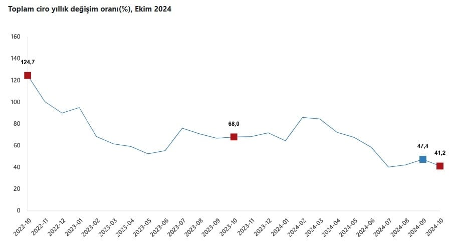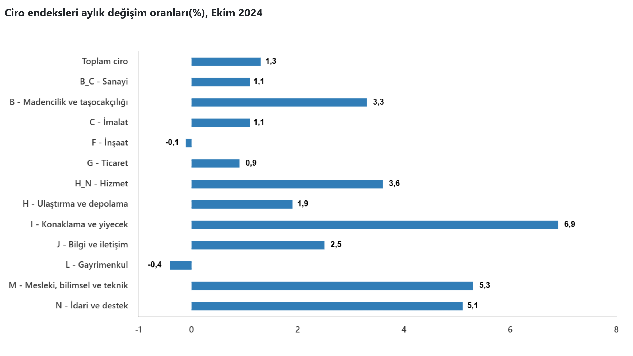 TÜİK verilerine göre sanayi, inşaat, ticaret ve hizmet sektörleri toplamında ciro endeksi ekimde aylık bazda yüzde 1,3 artış kaydetti. Bu dönemde inşaat ve gayrimenkul dışında tüm sektörlerin cirosunda artış yaşandı. Türkiye İstatistik Kurumu (TÜİK) 2024 Ekim'e ilişkin Ciro Endekslerini açıkladı. Buna göre sanayi, inşaat, ticaret ve hizmet sektörleri toplamında ciro endeksi (2021=100), 2024 yılı Ekim ayında yıllık yüzde 41,2 arttı Kaynak: TÜİK Toplam cironun alt detaylarına bakıldığında; 2024 yılı Ekim ayında yıllık sanayi sektörü ciro endeksi yüzde 29,5 arttı, inşaat ciro endeksi yüzde 63,7 arttı, ticaret ciro endeksi %yüzde 2,3 arttı, hizmet ciro endeksi yüzde 51,7 arttı. Aylık artış yüzde 1,3 oldu Sanayi, inşaat, ticaret ve hizmet sektörleri toplamında ciro endeksi (2021=100), 2024 yılı ekim ayında aylık yüzde 1,3 arttı. Toplam cironun alt detaylarına bakıldığında; 2024 yılı Ekim ayında aylık sanayi sektörü ciro endeksi yüzde 1,1 arttı, inşaat ciro endeksi yüzde 0,1 azaldı, ticaret ciro endeksi yüzde 0,9 arttı, hizmet ciro endeksi yüzde 3,6 arttı. Bu dönemde inşaat ve gayrimenkul dışında tüm sektörlerin cirosunda artış yaşandı. Kaynak: TÜİK