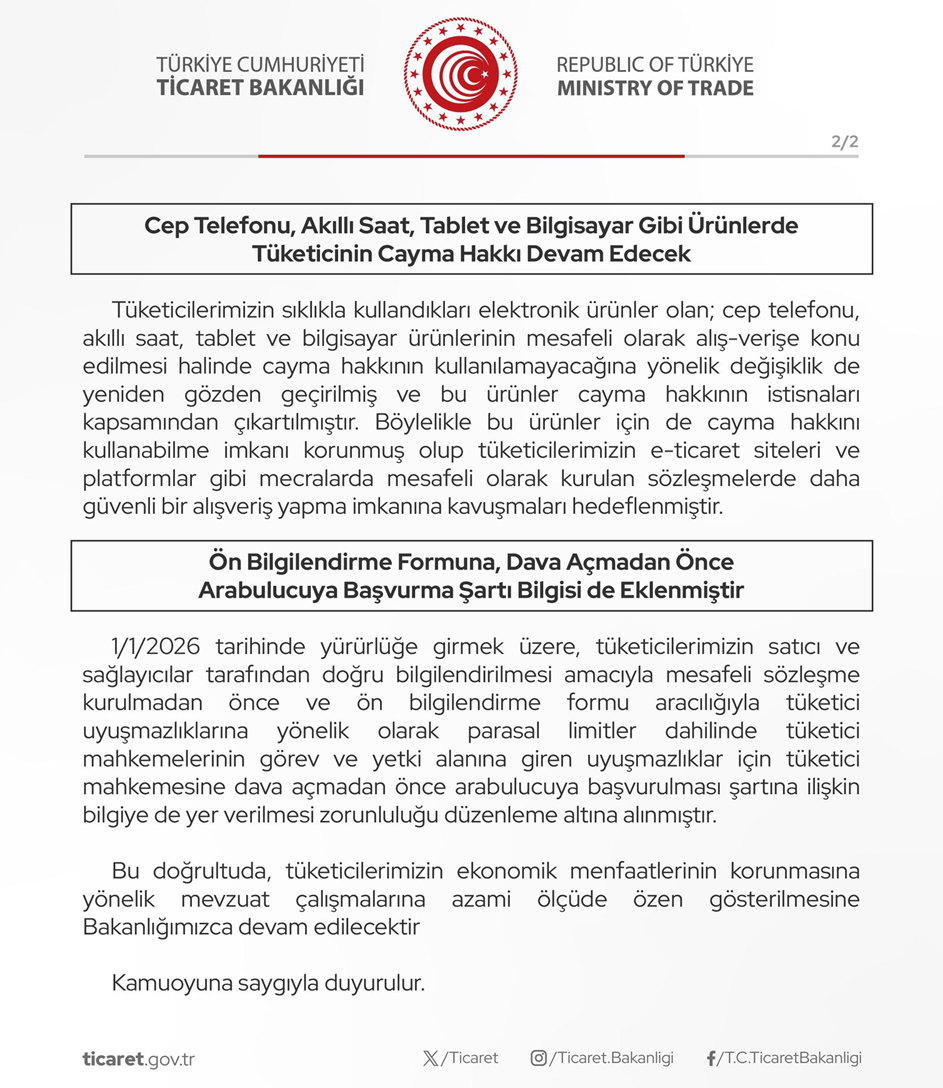 Ticaret Bakanlığı, internet alışverişlerinde tüketicilerin haklarını korumaya yönelik önemli değişikliklere imza attı. Yeni düzenlemeye göre internet alışverişinde iade isteyen tüketiciden artık kargo ücreti alınamayacak. Tüketiciler, daha önce cayma hakkı kaldırılan elektronik ürünlerde de cayma hakkını kullanabilecek. Ticaret Bakanlığı tarafından Mesafeli Sözleşmeler Yönetmeliği’nde tüketici lehine yeni düzenlemeler yapıldı. İade kargo ücretini satıcı karşılayacak Tüketicilerin mesafeli alışverişlerde ürün iadesi yaparken kargo ücretinden sorumlu tutulmalarına yönelik daha önce getirilen değişiklik, 28. Tüketici Konseyi’nde gelen öneriler doğrultusunda geri çekildi. Buna göre, cayma hakkını kullanan tüketicilerin iade kargo ücretinin satıcı veya sağlayıcı tarafından karşılanması kararlaştırıldı. Elektronik ürünlere cayma hakkı getirildi Cep telefonu, akıllı saat, tablet ve bilgisayar gibi ürünlerde kaldırılan cayma hakkından da tüketicilerden gelen talepler dikkate alınarak vazgeçildi. Böylece cep telefonu, akıllı saat, tablet ve bilgisayarlar gibi elektronik ürünlerde tüketiciler, satın alma sonrası 14 gün içinde herhangi bir gerekçe göstermeksizin cayma hakkını kullanabilecek. Arabuluculuk bilgisi ön bilgilendirme formunda yer alacak 1 Ocak 2026 itibarıyla yürürlüğe girecek başka bir düzenleme ise tüketici uyuşmazlıklarında arabuluculuğa başvuru şartıyla ilgili oldu. Buna göre, parasal limitler dahilindeki uyuşmazlıklarda mahkemeye başvurmadan önce arabulucuya başvurulması gerektiği bilgisinin mesafeli satış sözleşmesi yapılmadan önce tüketiciye sunulan ön bilgilendirme formunda yer alması zorunlu hale getirildi. Kaynak: Ticaret Bakanlığı
