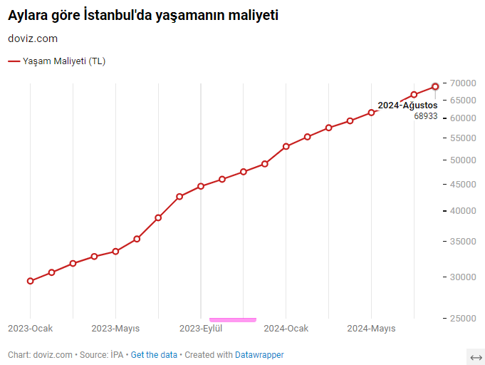 İstanbul Planlama Ajansı, ağustos ayında İstanbul’da dört kişilik bir ailenin ortalama yaşam maliyetini hesapladı. İstanbul Planlama Ajansı, İstanbul'da Yaşam Maliyeti araştırmasının ağustos sonuçlarını açıkladı. İstanbul Planlama Ajansı’nın araştırmasına göre İstanbul’da dört kişilik bir ailenin ortalama yaşam maliyeti 68.933 TL oldu. Buna göre İstanbul’da ortalama yaşam maliyeti, geçtiğimiz aya göre 2.383 TL artış kaydetti. Bir önceki yılın ağustos ayına göre İstanbul’da yaşam maliyeti yıllık bazda %61,84 artış gösterdi. Temel tüketim maddelerinin bir önceki yılın ağustos ayına göre fiyat artışlarına bakıldığında ise en çarpıcı fiyat artışlarından birinin yıllık bazda %124,77 artış ile tuvalet kağıdında olduğu görüldü. Kaynak: İPA [news_id:744062]