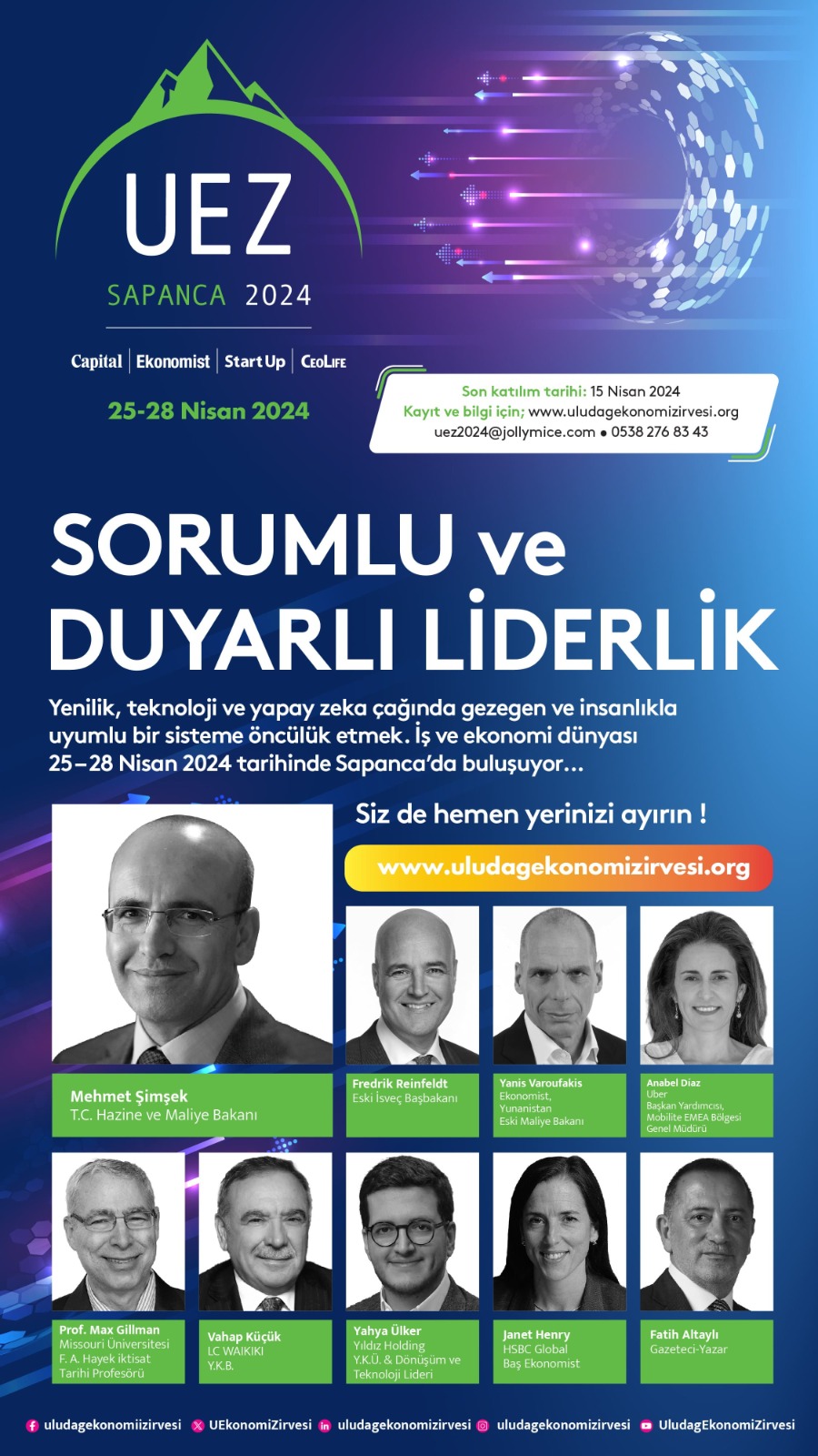 Türkiye ekonomisinin nabzını tutan, bölgenin en etkili iş ve ekonomi zirvesi UEZ (Uludağ Ekonomi Zirvesi) 25-28 Nisan 2024 tarihleri arasında Sapanca NG Enjoy Otel’de gerçekleştirilecek. UEZ 2024’ün bu yılki teması “Sorumlu ve Duyarlı Liderlik: Teknoloji ve Yapay Zeka Çağında Gezegen ve İnsanlıkla Uyumlu Bir Sisteme Öncülük Etmek” olarak belirlendi. Açılış konuşmasını Bakan Şimşek yapacak Zirvenin açılış konuşmasını T.C. Hazine ve Maliye Bakanı Mehmet Şimşek’in yapacağı UEZ 2024’te Türkiye’nin ve dünyanın saygın siyasetçileri, iş dünyası liderleri ve akademisyenleri bir araya gelerek iş dünyasında büyüme, sürdürülebilirlik, teknolojik dönüşüm, yeni nesillerin eğitimine ve geleceğine yatırım gibi konuları ele alacak. Zirvenin bu yılki ana sponsorluğunu Uber üstleniyor. Uber Başkan Yardımcısı ve EMEA Bölgesi Mobilite Başkanı, İspanya'nın en etkili 100 iş insanı arasında gösterilen Anabel Diaz Calderon da Zirve’nin ilk günü bir konuşma yapacak. İsveç Eski Başbakanı ve Yunanistan Eski Maliye Bakanı UEZ 2024’te iş dünyası liderleriyle buluşacak UEZ 2024 konuşmacıları arasında İsveç Eski Başbakanı Fredrik Reinfeldt ve Yunanistan Eski Maliye Bakanı ve ekonomist Yanis Varoufakis de yer alacak. Varoufakis, ekonomi politikaları ve uluslararası ilişkiler konusundaki derin bilgisiyle, Reinfeldt ise liderlik ve sürdürülebilir kalkınma konularında geniş tecrübesiyle zirveye katkı sağlayacak. UEZ 2024, 2 gün boyunca 14 panele ev sahipliği yapacak 2 gün boyunca 14 panelin gerçekleşeceği Zirve’de bu yıl “Dijital Dönüşüme Öncülük Etmek”, “Yeni Global Düzende Büyüme Fırsatları”, “Global Ekonomi İçin Yeni Bir Gelecek Arayışı”, “Sorumlu ve Duyarlı Liderlik”, “21’inci Yüzyıl İçin Sürdürülebilir İş Modelleri ve Stratejiler”, “Paris 2024 ve Sporun Gücü”, “Eğitimin Geleceği: Dijital Çağda Global Yetenekler Geliştirmek”, “Finansta Değişim Yaratan Yeni Teknolojiler ve Düzenlemeler”, “Zirvede Sohbetler”, “Gayrimenkulün Yarını: Yaşanabilir Kentler ve Mekanlar Planlamak”, “Liderlerin Gelecek Vizyonu: Yarının Şirketi için Yenilikçi Yaklaşımlar, Yatırımlar ve Hedefler”, “Yapay Zeka İş Dünyasını Nasıl Değiştirecek?”, “Girişimcilik: Yeni İşler, “Trendler ve Teknolojiler”, “Finansal Gülergeçerlik” gibi konu başlıklarında paneller yer alacak. Uludağ Ekonomi Zirvesi kapsamında, bu yıl 13’üncüsü gerçekleştirilecek olan Stars Of Region Start up Yarışması ödül töreni de düzenlenecek. Dünyanın pek çok ülkesinden başvuruda bulunan yüzlerce girişimci arasından seçilen projeler UEZ 2024’te yatırım alma fırsatı bulacak. İş ve ekonomi dünyasının etkili isimleri zirvede Uludağ Ekonomi Zirvesi’nde ulusal ve uluslararası bir çok önemli isim yer alıyor: SANKO Holding Yönetim Kurulu Başkanı Adil Sani Konukoğlu, Mediterra Capital Management Limited Kurucu Ortağı Ahmet Faralyalı, Türk Felsefeci ve Akademisyen Prof. Dr. Ahmet Arslan, Bilkent Üniversitesi, İktisat Bölümü Merkez Bankacılığı ve Finansal Piyasalar Profesörü Prof. Dr. Ali Hakan Kara, Multinet Up CEO’su Ali Emre Sever, İstanbul Portföy Yönetimi A.Ş. Genel Müdürü Barış Hocaoğlu, Doğan Holding Yönetim Kurulu Başkanı Begüm Doğan Faralyalı, Figopara Kurucu Ortağı Bulut Arukel, Zip Türkiye CEO'su ve Yönetim Kurulu Üyesi Burak Elgin, sahibinden.com CEO’su Burak Ertaş, Akademisyen, Bilim İnsanı, Jeolog ve Yazar Prof. Dr. A. M. Celâl Şengör, Girişimci ve Yatırımcı Daniel Doll Steinberg, SKD Türkiye Yönetim Kurulu Başkanı ve Fibabanka Yönetim Kurulu Üyesi Ebru Dildar Edin, Ekonomist Emrah Lafçı, Papara CEO’su Emre Kenci, Vodafone Türkiye CEO’su Engin Aksoy, Şölen İcra Kurulu Başkanı ve CEO’su Erdoğan Çoban, Index Grup Yönetim Kurulu Başkanı ve 2017-2018 Dönemi TÜSİAD Yönetim Kurulu Başkanı Erol Bilecik, Bahçeşehir Üniversitesi Rektörü Prof. Dr. Esra Hatipoğlu, Pasifik Holding CEO’su F. Nusret Dur, Gazeteci-Yazar Fatih Altaylı, Test Education Centre Kurucusu Fulya Yalezan, İsveç Eski Başbakanı Fredrik Reinfeldt, Hayat Finans Katılım Bankası Genel Müdürü ve Yönetim Kurulu Üyesi Galip Karagöz, BSH REM CEO’su Gökhan Sığın, Akkök Holding CEO’su İhsan Gökşin Durusoy, Türk Milli Modern Pentatlet İlke Özyüksel Mihrioğlu, Rönesans Holding Yönetim Kurulu Başkanı İpek Ilıcak Kayaalp, HSBC Global Baş Ekonomisti Janet Henry, Stand-Up Komedi Sanatçısı Kaan Sekban, Microsoft Türkiye Genel Müdürü Levent Özbilgin, Missouri Üniversitesi F. A. Hayek iktisat Tarihi Profesörü Prof. Max Gillman, Pegasus Hava Yolları Yönetim Kurulu Başkanı Mehmet Nane, Yıldız Holding Yönetim Kurulu Başkan Vekili ve CEO’su Mehmet Tütüncü, Koç Üniversitesi Rektörü Prof. Dr. Metin Sitti, Türkiye Milli Paralimpik Komitesi Başkanı Dr. Av. Murat Aksu, TSKB Genel Müdürü ve Yönetim Kurulu Üyesi Murat Bilgiç, GYODER Yönetim Kurulu Başkanı Neşecan Çekici, Uber Türkiye Genel Müdürü Neyran Bahadırlı, Sipay Kurucusu Nezih Sipahioğlu, Eksim Holding Yönetim Kurulu Başkan Vekili Osman Arıoğlu, Hepsipay Genel Müdürü Ozan Bayülgen, Servotel Kurucusu, Başkanı ve Yönetici Ortağı Ömer Kemal İsvan, Paralimpik Okçu Öznur Cüre Girdi, İstanbul Saint-Joseph Lisesi Müdürü Paul Georges, HSBC Türkiye CEO’su Selim Kervancı, Akfen Holding Başkanvekili ve CEO’su Selim Akın, Hepiyi Sigorta Genel Müdürü Şenol Ortaç, P&G Türkiye, Kafkasya ve Orta Asya Yönetim Kurulu Başkanı ve Genel Müdürü Tankut Turnaoğlu, LC WAIKIKI Yönetim Kurulu Başkanı Vahap Küçük, Yıldız Holding Dönüşüm ve Teknoloji Lideri Yahya Ülker, Yunanistan Eski Maliye Bakanı ve Ekonomist Yanis Varoufakis. UEZ 2024’ün ana sponsorluğunu Uber üstleniyor. Bu