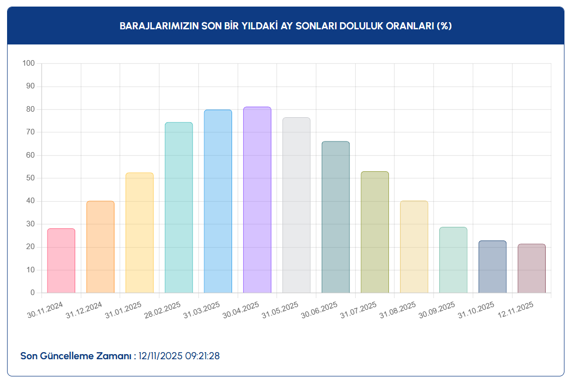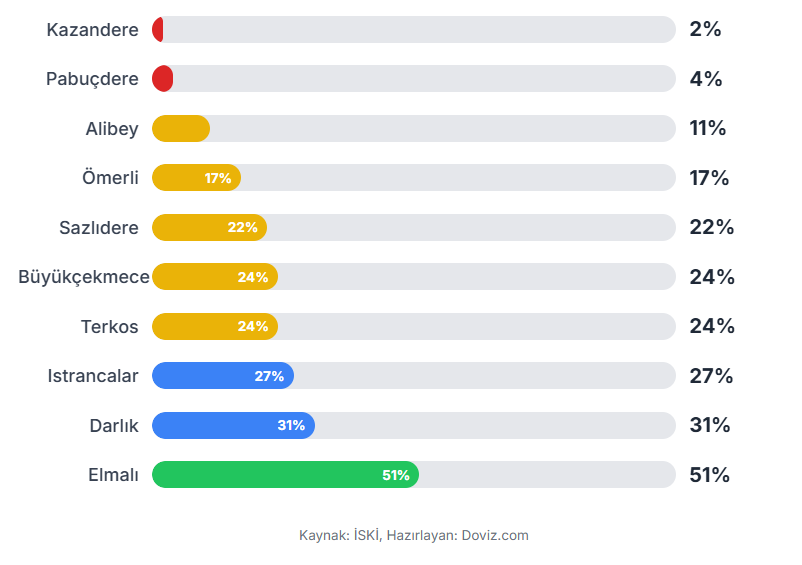 İstanbul Su ve Kanalizasyon İdaresi (İSKİ), İstanbul’un barajlarındaki son tabloyu duyurdu. Yağışların yetersiz olmasıyla birlikte İstanbul’a su sağlayan barajlardaki doluluk oranlarında da düşüş hızlandı. İSKİ'nin açıkladığı verilere göre 12 Kasım 2025 itibarıyla megakentteki barajların genel doluluk oranı yüzde 21,54 seviyesine geriledi. Baraj dolulukları son olarak nisan ayının sonunda yüzde 80’in üzerine kadar çıkmıştı. İSKİ'nin paylaştığı tabloya göre İstanbul'a su sağlayan barajların doluluk oranı şöyle sıralandı: [news_id:788678]