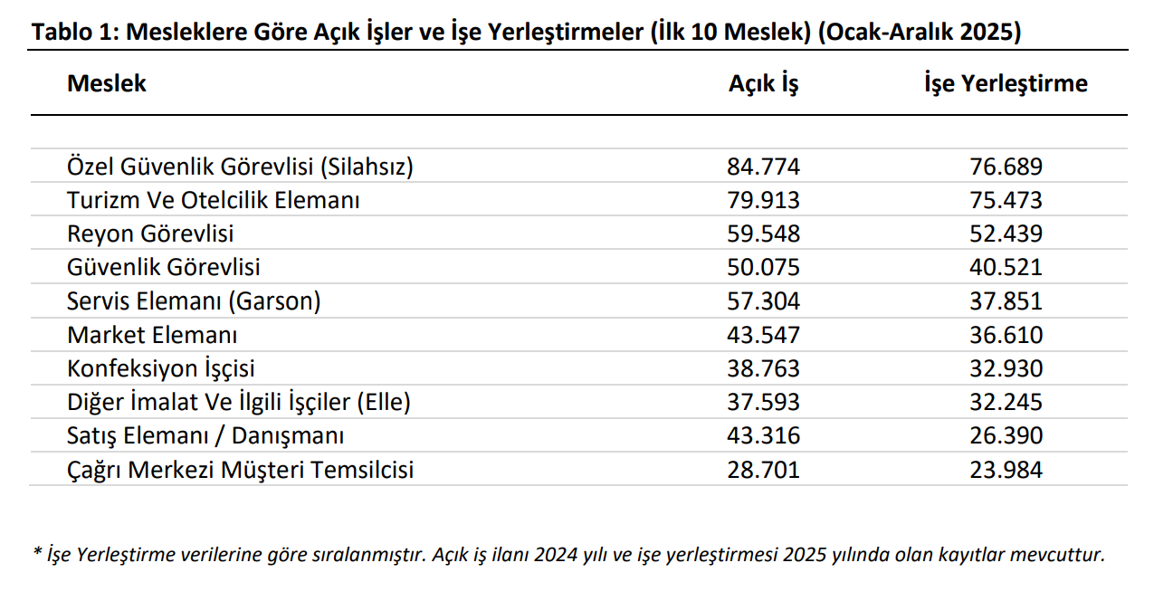 2025 yılında yaklaşık 1,5 milyon kişinin platformları üzerinden iş bulduğunu açıklayan İŞKUR, yıl genelinde en çok işe alım gerçekleşen meslekleri açıkladı. Türkiye İş Kurumu, 2025 yılının Aralık ayına ait aylık istatistik bültenini yayımladı. Rapora göre, aralık ayı itibarıyla kuruma kayıtlı iş arayan sayısı 2 milyon 331 bin 346 kişi olarak kayıtlara geçti. 2025 yılının tamamını kapsayan Ocak-Aralık döneminde ise İŞKUR aracılığıyla toplam 1 milyon 478 bin 405 kişinin iş sahibi olmasına destek sağlandı. Sadece aralık ayında 49 bin 826'sı erkek ve 32 bin 166'sı kadın olmak üzere toplam 81 bin 992 işe yerleşme işlemi sonuçlandırıldı. En fazla işe alım yapılan sektörler Yıl genelinde en fazla işe yerleştirme faaliyeti sanayi sektöründe, özellikle "İmalat" alanında yoğunlaştı. Mesleki bazda yapılan incelemelerde ise en çok işe alım yapılan alanlar sırasıyla "Özel Güvenlik Görevlisi (Silahsız), Turizm ve Otelcilik Elemanı ve Reyon Görevlisi" oldu. Kurumun aracılık ettiği yerleştirmelerde kadınlar, gençler ve yükseköğrenim mezunları önemli bir paya sahip oldu. Bu kapsamda 573 bin 763 kadın, 503 bin 327 genç ve 296 bin 926 yükseköğrenim mezunu iş hayatına adım attı. İşverenlerden alınan açık iş sayısı ise yıl genelinde 2 milyon 435 bin 200'e ulaştı. Bu taleplerin yüzde 98,6 gibi büyük bir çoğunluğu özel sektörden geldi. Danışmanlık ve eğitim programları hız kazandı İstihdamı desteklemek amacıyla yürütülen danışmanlık hizmetlerinde de yoğun bir mesai harcandı. 2025 yılı boyunca iş arayanlarla toplam 3 milyon 219 bin 741 bireysel görüşme gerçekleştirilirken, öğrencilere yönelik 24 bin 978 okul ziyareti yapıldı. İşgücü piyasası programları kapsamında düzenlenen 15 bin 828 programa 84 bin 894 kişi katılım sağladı. Aktif işgücü programlarından faydalananların sayısında bir önceki yıla göre yüzde 22,8 oranında artış gözlendi. Mesleki eğitim kurslarında ise en çok kursiyerin bulunduğu branşlar "Çağrı Merkezi Elemanı, Perakende Satış Elemanı ve Kablo Ağı Bantlama Elemanı" olarak sıralandı. [news_id:797486]