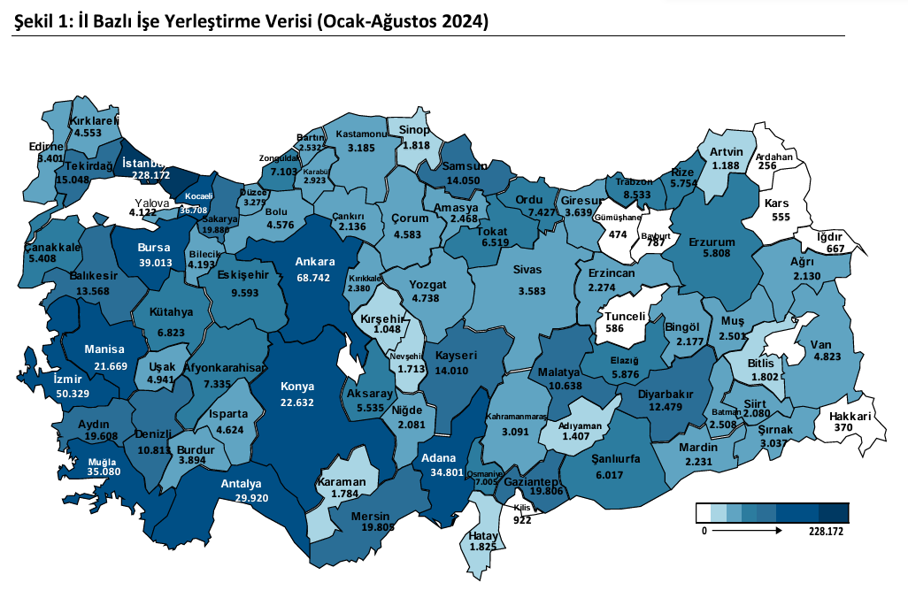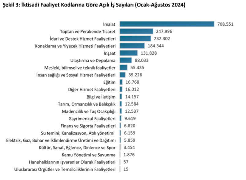 İŞKUR verilerine göre açık iş sayısı ağustos ayında geçen yılın aynı ayına göre yüzde 5,85 düşüşle 221 bin 874 oldu. Peki, yılın ilk 8 ayında en fazla personele ihtiyaç duyulan sektörler hangileri oldu? İşte detaylar.. İŞKUR, "Ağustos ayı Açık İş İstatistikleri Araştırması" sonuçlarını kamuoyuyla paylaştı. İŞKUR'un açıkladığı verilere göre açık iş sayısı ağustosta geçen yılın aynı ayına göre %5,85 düşüş kaydederek 221 bin 874 oldu. İŞKUR’un aylık raporuna göre ocak-ağustos döneminde ise açık iş sayısı %0,1 artışla 1 milyon 793 bin 632 oldu. Kaynak: İŞKUR En fazla açık sanayide İlk 8 ayda açık işlerin yüzde 99’u özel sektörden alınan açık işlerden oluştu. Sektörler itibarıyla en fazla açık iş (708.551 açık iş) imalat sanayi sektöründe oldu. En çok açık iş ise “Turizm ve Otelcilik Elemanı, Özel Güvenlik Görevlisi (Silahsız) ve Servis Elemanı (Garson)” mesleklerinde kaydedildi. Kaynak: İŞKUR Kayıtlı işsiz sayısı düştü İŞKUR’a kayıtlı işsiz sayısı Ağustos ayında geçen yılın aynı ayına göre %14,68 düşüşle 2 milyon 371 bin 977 kişi oldu. Geçen yılın aynı ayında kayıtlı işsiz sayısı 2 milyon 779 bin 984 seviyesindeydi. Kayıtlı işsizlerin %47,4’ü erkek, %52,6’sı kadın, %21,1’i 15-24 yaş grubunda yer aldı. İşe yerleştirilen erkek sayısı yine kadın sayısını geçti İŞKUR aracılığıyla ağustos ayında yıllık %19,71 artışla 73 bin 131’i (%61,3) erkek, 46 bin 205’i (%38,7) kadın olmak üzere 119 bin 336 işe yerleşme gerçekleşti. 2024 yılı Ocak-Ağustos döneminde ise 947 bin 388 işe yerleştirmeye aracılık edildi. Ocak-Ağustos 2024 döneminde sektörler itibarıyla en fazla işe yerleştirme sanayi sektöründe “İmalat” alanında; mesleklere göre ise en fazla işe yerleştirme sırasıyla “Turizm ve Otelcilik Elemanı, Özel Güvenlik Görevlisi (Silahsız) ve Reyon Görevlisi” mesleklerinde gerçekleştirildi. [news_id:744889]