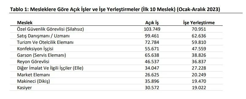 İŞKUR verilerine göre işverenler aralık ayında 209 bin 645 açık iş ilanı iletti. Peki, aralık ayında işverenler en çok hangi mesleklerden personele ihtiyaç duydu? İşte detaylar.. İŞKUR, istihdamın korunması ve artırılması, işsizlerin mesleki niteliklerinin geliştirilmesi, işsizliğin azaltılması ve özel politika gerektiren grupların iş gücü piyasasına kazandırılması amacıyla aralık ayında 83.407’si (%60,1) erkek, 55.482’si (%39,9) kadın olmak üzere ülke genelinde 138.889 kişiyi işe yerleştirdiğini duyurdu. İŞKUR tarafından 2023 yılı Ocak-Aralık döneminde ise 1 milyon 237 bin 26 işe yerleştirmeye aracılık edildi. En fazla ve en az işe yerleştirme yapılan iller Ocak-kasım döneminde en fazla işe yerleşme, 255 bin 936 kişiyle İstanbul'da oldu. İstanbul'u 93 bin 844 kişiyle Ankara, 66 bin 382 kişiyle Bursa, 63 bin 621 kişiyle İzmir ve 41 bin 425 kişiyle Adana izledi. Kaynak: İŞKUR İşverenlerin en çok eleman aradığı meslekler Aralık ayında İŞKUR’un işverenlerden aldığı açık iş sayısı 209 bin 645 olurken, 2023 yılı Ocak-Aralık döneminde ise 2 milyon 677 bin 6 açık iş ilanı alındı. Sektörler itibarıyla en fazla açık iş (1 milyon 141 bin 685) imalat sanayi sektöründe yer alırken, açık işlerin yüzde 98,9’u özel sektörden alınan açık işlerden oluştu. İşverenlerin eleman teminiyle ilgili İŞKUR'a en çok talepte bulunduğu meslekler ise özel güvenlik görevlisi, satış danışmanı, turizm ve otelcilik elemanı, konfeksiyon işçisi, garson, reyon görevlisi, diğer imalat ve ilgili işçiler, market elemanı, makineci (dikiş) ve kasiyer olarak sıralandı. Kaynak: İŞKUR [news_id:720411]