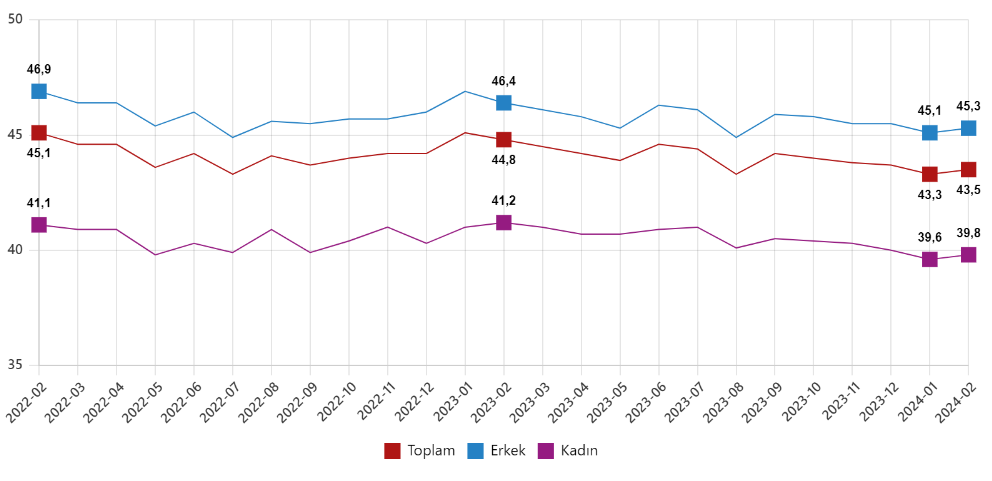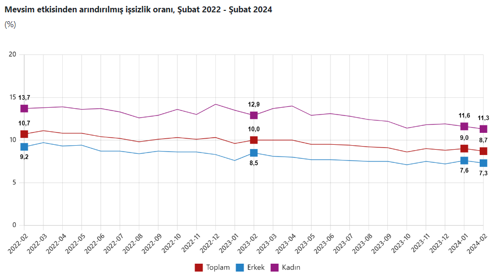 Türkiye İstatistik Kurumu (TÜİK), şubat ayına ilişkin işsizlik rakamlarını açıkladı. TÜİK tarafından açıklanan verilere göre şubat ayında işsizlik oranı yüzde 8,7 seviyesinde gerçekleşti. Böylelikle işsizlik oranı 10. ayında da tek hanede kalmayı sürdürdü. Hanehalkı İşgücü Araştırması sonuçlarına göre; 15 ve daha yukarı yaştaki kişilerde işsiz sayısı 2024 yılı Şubat ayında bir önceki aya göre 109 bin kişi azalarak 3 milyon 78 bin kişi oldu. İşsizlik oranı erkeklerde %7,3 iken kadınlarda %11,3 olarak tahmin edildi. Kaynak: TÜİK Mevsim etkisinden arındırılmış istihdam oranı %49,3 oldu İstihdam edilenlerin sayısı 2024 yılı Şubat ayında bir önceki aya göre 147 bin kişi artarak 32 milyon 423 bin kişi, istihdam oranı ise 0,2 puan artarak %49,3 oldu. Bu oran erkeklerde %66,5 iken kadınlarda %32,5 olarak gerçekleşti. Kaynak: TÜİK Mevsim etkisinden arındırılmış işgücüne katılma oranı %54,0 İşgücü 2024 yılı Şubat ayında bir önceki aya göre 38 bin kişi artarak 35 milyon 501 bin kişi, işgücüne katılma oranı ise aynı seviyede kalarak %54,0 olarak gerçekleşti. İşgücüne katılma oranı erkeklerde %71,7 iken kadınlarda %36,6 oldu. Genç nüfusta mevsim etkisinden arındırılmış işsizlik %15,6 15-24 yaş grubunu kapsayan genç nüfusta işsizlik oranı bir önceki aya göre 0,8 puan azalarak %15,6 oldu. Bu yaş grubunda işsizlik oranı; erkeklerde %13,4, kadınlarda ise %19,6 olarak tahmin edildi. Mevsim ve takvim etkilerinden arındırılmış haftalık ortalama fiili çalışma süresi 43,5 saat İstihdam edilenlerden referans döneminde işbaşında olanların, mevsim ve takvim etkilerinden arındırılmış haftalık ortalama fiili çalışma süresi 2024 yılı Şubat ayında bir önceki aya göre 0,2 saat artarak 43,5 saat olarak gerçekleşti. Kaynak: TÜİK Mevsim etkisinden arındırılmış atıl işgücü oranı %24,5 Zamana bağlı eksik istihdam, potansiyel işgücü ve işsizlerden oluşan atıl işgücü oranı 2024 yılı Şubat ayında bir önceki aya göre 1,9 puan azalarak %24,5 oldu. Zamana bağlı eksik istihdam ve işsizlerin bütünleşik oranı %16,3 iken işsiz ve potansiyel işgücünün bütünleşik oranı %17,6 olarak tahmin edildi. [news_id:728497]