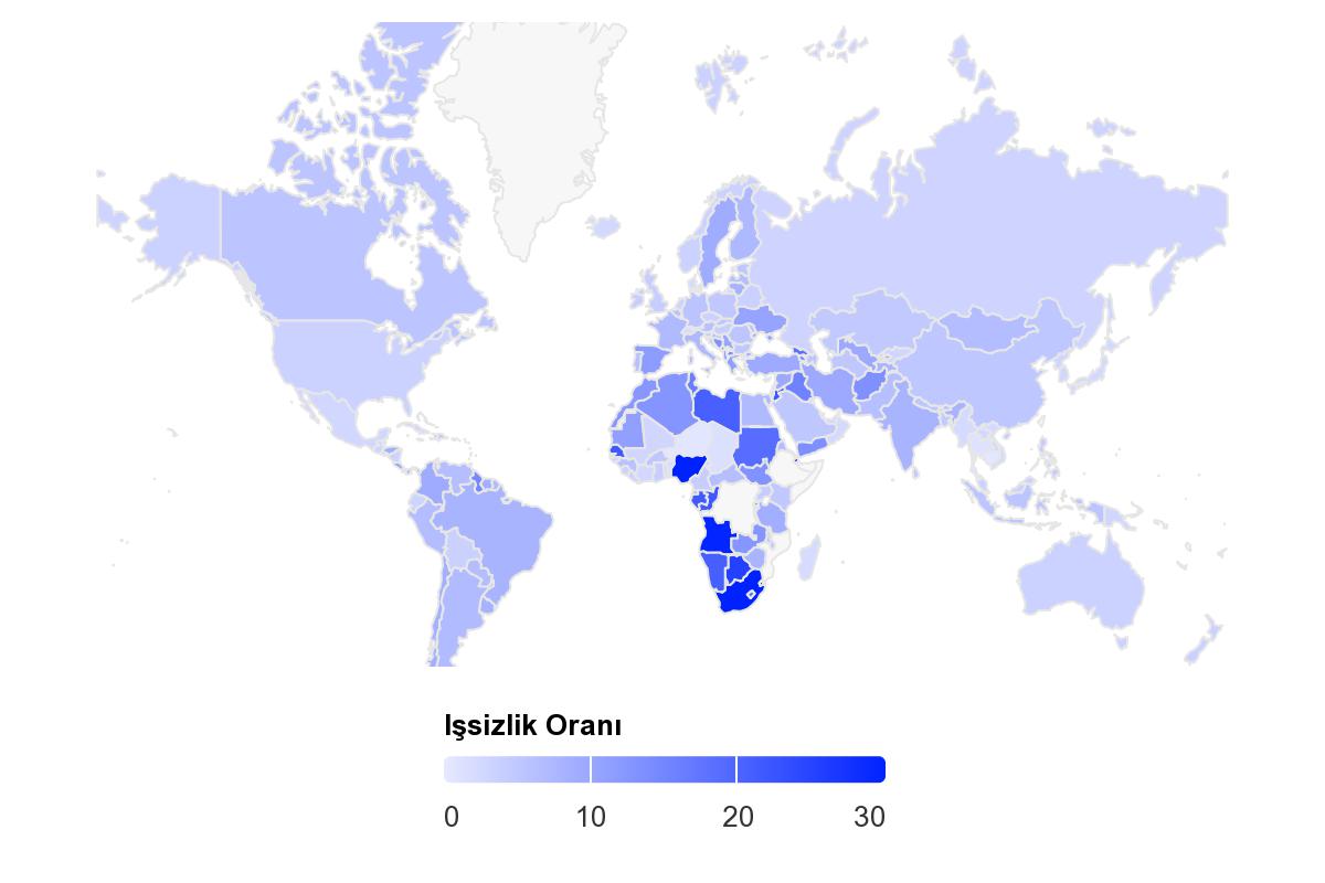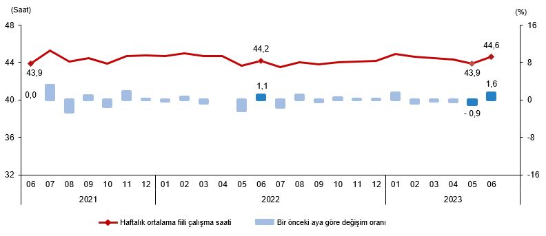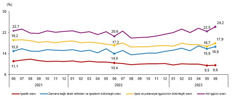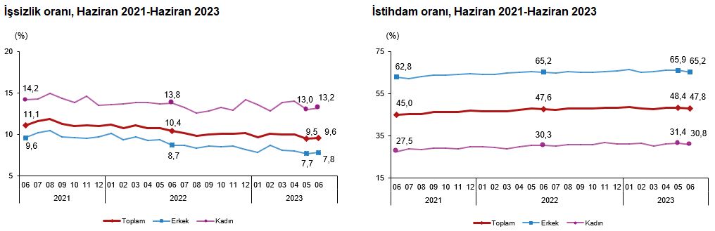 Türkiye İstatistik Kurumu (TÜİK), haziran ayına ilişkin işsizlik verilerini açıkladı. Türkiye İstatistik Kurumu (TÜİK) tarafından açıklanan verilere göre, haziran ayında Türkiye’de işsizlik oranı yüzde 9,6 seviyesinde gerçekleşti. Hanehalkı İşgücü Araştırması sonuçlarına göre; 15 ve daha yukarı yaştaki kişilerde işsiz sayısı haziran ayında bir önceki aya göre 2 bin kişi artarak 3 milyon 337 bin kişi oldu. İşsizlik oranı erkeklerde %7,8 iken kadınlarda %13,2 olarak tahmin edildi. Mevsim etkisinden arındırılmış istihdam oranı %47,8 oldu İstihdam edilenlerin sayısı 2023 yılı Haziran ayında bir önceki aya göre 363 bin kişi azalarak 31 milyon 291 bin kişi, istihdam oranı ise 0,6 puan azalarak %47,8 oldu. Bu oran erkeklerde %65,2 iken kadınlarda %30,8 olarak gerçekleşti. Mevsim etkisinden arındırılmış işgücüne katılma oranı %52,9 olarak gerçekleşti İşgücü 2023 yılı Haziran ayında bir önceki aya göre 359 bin kişi azalarak 34 milyon 629 bin kişi, işgücüne katılma oranı ise 0,6 puan azalarak %52,9 olarak gerçekleşti. İşgücüne katılma oranı erkeklerde %70,7 iken kadınlarda %35,5 oldu. Genç nüfusta mevsim etkisinden arındırılmış işsizlik oranı %18,6 oldu 15-24 yaş grubunu kapsayan genç nüfusta işsizlik oranı bir önceki aya göre 1,2 puanlık artış ile %18,6 oldu. Bu yaş grubunda işsizlik oranı; erkeklerde %15,4, kadınlarda ise %24,2 olarak tahmin edildi. Mevsim etkisinden arındırılmış temel işgücü göstergeleri, 15+ yaş, Haziran 2023 Mevsim ve takvim etkilerinden arındırılmış haftalık ortalama fiili çalışma süresi 44,6 saat oldu İstihdam edilenlerden referans döneminde işbaşında olanların, mevsim ve takvim etkilerinden arındırılmış haftalık ortalama fiili çalışma süresi 2023 yılı Haziran ayında bir önceki aya göre 0,7 saat artarak 44,6 saat olarak gerçekleşti. Mevsim ve takvim etkilerinden arındırılmış haftalık ortalama fiili çalışma süresi, Haziran 2021-Haziran 2023 Mevsim etkisinden arındırılmış atıl işgücü oranı %24,2 oldu Zamana bağlı eksik istihdam, potansiyel işgücü ve işsizlerden oluşan atıl işgücü oranı 2023 yılı Haziran ayında bir önceki aya göre 1,7 puanlık artış ile %24,2 oldu. Zamana bağlı eksik istihdam ve işsizlerin bütünleşik oranı %16,6 iken işsiz ve potansiyel işgücünün bütünleşik oranı %17,9 olarak tahmin edildi. Mevsim etkisinden arındırılmış işgücüne ilişkin tamamlayıcı göstergeler, Haziran 2021-Haziran 2023 Bu konu ile ilgili bir sonraki haber bülteninin yayımlanma tarihi 17 Ağustos 2023'tür. Küresel çapta ülkelerin işsizlik oranlarının sıcaklık haritası ise şöyle sıralanmaktadır: Kaynak: TradingEconomics