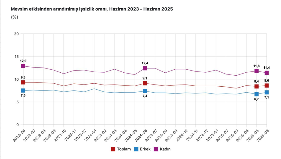 Cumhurbaşkanı Yardımcısı Cevdet Yılmaz, işsizlik oranının program hedefinden daha iyi bir patikada ilerlediğini söyledi. Cumhurbaşkanı Yardımcısı Cevdet Yılmaz, bugün açıklanan işsizlik verilerini sosyal medya hesabından değerlendirdi. Yılmaz’ın sosyal medya üzerinden yaptığı paylaşım şöyle oldu: “İşsizlik oranı bir önceki aya göre 0,2 puan yükselerek yüzde 8,6 olmuştur. Son 26 aydır tek haneli seviyelerde istikrarlı seyreden işsizlik oranı program hedefimizden daha iyi bir patikada ilerlemektedir. 2025 yılı haziran ayında mevsim etkisinden arındırılmış işsizlik oranı geçen yıla göre 0,5 puan azalarak yüzde 8,6 olarak gerçekleşmiş; kadınlarda ise aynı dönem itibariyle 1 puan azalarak yüzde 11,4’e gerilemiştir. Enflasyonun kontrol altına alındığı, ekonomiye güvenin pekiştiği bu süreçte istihdamımızı artırmaya yönelik çok boyutlu tedbirler almaya, kadınların ve gençlerin işgücüne katılımını destekleyen politikalarımızı uygulamaya devam ediyoruz. Sürdürülebilir kalkınma anlayışımız doğrultusunda istihdamı sadece nicelik yönüyle ele almayan; istihdamın bölgesel dağılımını, niteliğini ve verimliliğini gözeten bir yaklaşımla işgücü piyasasındaki dönüşümü şekillendiriyoruz. Uyguladığımız politikalar ile sosyal refahı güçlendirmeyi, fırsat eşitliğini artırmayı ve toplumsal refahı ileriye taşımayı amaçlıyoruz.” [news_id:780095]