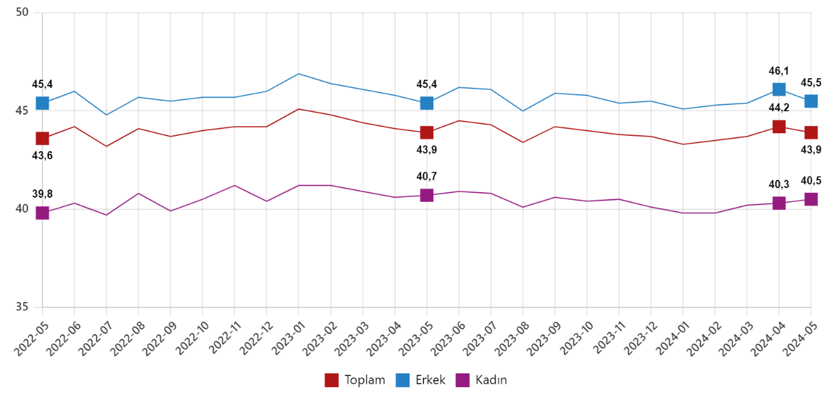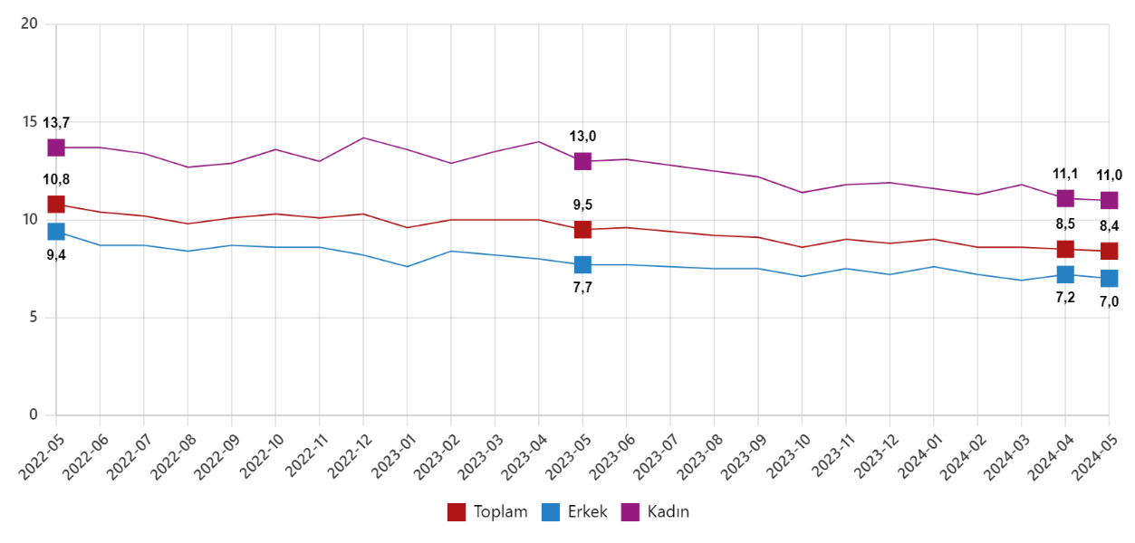 Türkiye İstatistik Kurumu (TÜİK), mayıs ayına ilişkin işsizlik rakamlarını açıkladı. TÜİK tarafından açıklanan verilere göre mayıs ayında işsizlik oranı %8,4 seviyesinde gerçekleşti. Nisan ayında işsizlik %8,5 seviyesindeydi. Öte yandan Hanehalkı İşgücü Araştırması sonuçlarına göre 15 ve daha yukarı yaştaki kişilerde işsiz sayısı 2024 yılı Mayıs ayında bir önceki aya göre 27 bin kişi azalarak 3 milyon 11 bin kişi oldu. İşsizlik oranı erkeklerde %7 iken kadınlarda %11 olarak tahmin edildi. Kaynak: TÜİK Mevsim etkisinden arındırılmış istihdam oranı %50,0 oldu İstihdam edilenlerin sayısı 2024 yılı Mayıs ayında bir önceki aya göre 273 bin kişi artarak 32 milyon 920 bin kişi, istihdam oranı ise 0,4 puan artarak %50,0 oldu. Bu oran erkeklerde %67,3 iken kadınlarda %33,0 olarak gerçekleşti. Mevsim etkisinden arındırılmış işgücüne katılma oranı %54,5 olarak gerçekleşti İşgücü 2024 yılı Mayıs ayında bir önceki aya göre 245 bin kişi artarak 35 milyon 931 bin kişi, işgücüne katılma oranı ise 0,3 puan artarak %54,5 olarak gerçekleşti. İşgücüne katılma oranı erkeklerde %72,4 iken kadınlarda %37,1 oldu. Genç nüfusta mevsim etkisinden arındırılmış işsizlik oranı %15,0 oldu 15-24 yaş grubunu kapsayan genç nüfusta işsizlik oranı bir önceki aya göre 0,3 puan artarak %15,0 oldu. Bu yaş grubunda işsizlik oranı; erkeklerde %12,8, kadınlarda ise %19,3 olarak tahmin edildi. Mevsim ve takvim etkilerinden arındırılmış haftalık ortalama fiili çalışma süresi 43,9 saat oldu İstihdam edilenlerden referans döneminde işbaşında olanların, mevsim ve takvim etkilerinden arındırılmış haftalık ortalama fiili çalışma süresi 2024 yılı Mayıs ayında bir önceki aya göre 0,3 saat azalarak 43,9 saat olarak gerçekleşti. Kaynak: TÜİK Mevsim etkisinden arındırılmış atıl işgücü oranı %25,2 oldu Zamana bağlı eksik istihdam, potansiyel işgücü ve işsizlerden oluşan atıl işgücü oranı 2024 yılı Mayıs ayında bir önceki aya göre 2,0 puan azalarak %25,2 oldu. Zamana bağlı eksik istihdam ve işsizlerin bütünleşik oranı %17,4 iken işsiz ve potansiyel işgücünün bütünleşik oranı %17,1 olarak tahmin edildi. [news_id:738985]