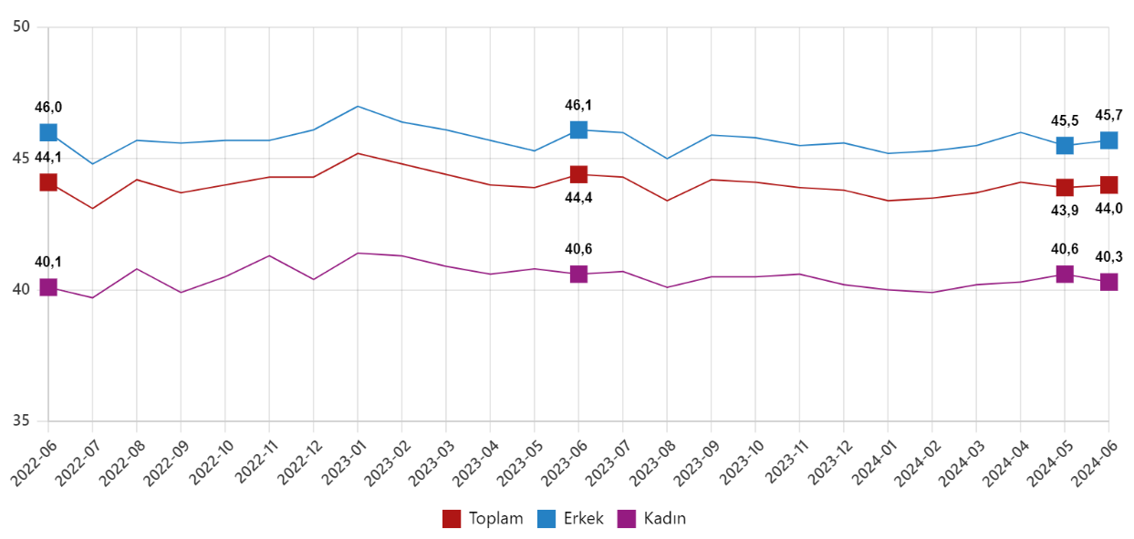 Türkiye İstatistik Kurumu (TÜİK), haziran ayına ilişkin işsizlik rakamlarını açıkladı. TÜİK tarafından açıklanan verilere göre haziran ayında işsizlik oranı %9,2 seviyesinde gerçekleşti. Bu döneme ilişkin beklenti %8,2 seviyesinde belirlenmişti. Böylelikle işsizlik oranı 11 ayın en yüksek seviyesine çıkmış oldu. Hanehalkı İşgücü Araştırması sonuçlarına göre 15 ve daha yukarı yaştaki kişilerde işsiz sayısı ise 2024 yılı Haziran ayında bir önceki aya göre 234 bin kişi artarak 3 milyon 305 bin kişi oldu. İşsizlik oranı erkeklerde %7,6 iken kadınlarda %12,4 olarak tahmin edildi. Kaynak: TÜİK Mevsim etkisinden arındırılmış istihdam oranı %49,3 İstihdam edilenlerin sayısı 2024 yılı Haziran ayında bir önceki aya göre 341 bin kişi azalarak 32 milyon 522 bin kişi, istihdam oranı ise 0,6 puan azalarak %49,3 oldu. Bu oran erkeklerde %66,9 iken kadınlarda %32,1 olarak gerçekleşti. Mevsim etkisinden arındırılmış işgücüne katılma oranı %54,4 İşgücü 2024 yılı Haziran ayında bir önceki aya göre 107 bin kişi azalarak 35 milyon 827 bin kişi, işgücüne katılma oranı ise 0,2 puan azalarak %54,4 olarak gerçekleşti. İşgücüne katılma oranı erkeklerde %72,4 iken kadınlarda %36,7 oldu. Genç nüfusta mevsim etkisinden arındırılmış işsizlik oranı %17,6 15-24 yaş grubunu kapsayan genç nüfusta işsizlik oranı bir önceki aya göre 1,7 puan artarak %17,6 oldu. Bu yaş grubunda işsizlik oranı; erkeklerde %14,8, kadınlarda ise %23,2 olarak tahmin edildi. [news_id:742355] Mevsim ve takvim etkilerinden arındırılmış haftalık ortalama fiili çalışma süresi 44,0 saat İstihdam edilenlerden referans döneminde işbaşında olanların, mevsim ve takvim etkilerinden arındırılmış haftalık ortalama fiili çalışma süresi 2024 yılı Haziran ayında bir önceki aya göre 0,1 saat artarak 44,0 saat olarak gerçekleşti. Kaynak: TÜİK Mevsim etkisinden arındırılmış atıl işgücü oranı %29,2 Zamana bağlı eksik istihdam, potansiyel işgücü ve işsizlerden oluşan atıl işgücü oranı 2024 yılı Haziran ayında bir önceki aya göre 3,8 puan artarak %29,2 oldu. Zamana bağlı eksik istihdam ve işsizlerin bütünleşik oranı %20,2 iken işsiz ve potansiyel işgücünün bütünleşik oranı %19,5 olarak tahmin edildi.