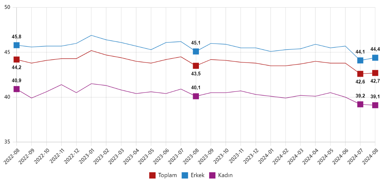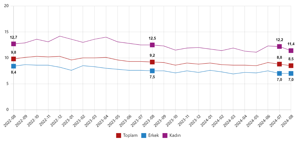 Türkiye İstatistik Kurumu (TÜİK), ağustos ayına ilişkin işsizlik rakamlarını açıkladı. TÜK'in Hanehalkı İşgücü Araştırması sonuçlarına göre 15 ve daha yukarı yaştaki kişilerde işsiz sayısı 2024 yılı Ağustos ayında bir önceki aya göre 89 bin kişi azalarak 3 milyon 55 bin kişi oldu. Aynı dönemde işsizlik oranı ise 0,3 puan azalarak %8,5 seviyesinde gerçekleşti. İşsizlik oranı erkeklerde yüzde 7 iken kadınlarda yüzde 11,4 olarak tahmin edildi. Kaynak: TÜİK İstihdam edilenlerin sayısı 2024 yılı Ağustos ayında bir önceki aya göre 78 bin kişi artarak 32 milyon 776 bin kişi, istihdam oranı ise 0,1 puan artarak %49,7 oldu. Bu oran erkeklerde %67,1 iken kadınlarda %32,6 olarak gerçekleşti. İşgücüne katılma oranı %54,3 İşgücü 2024 yılı Ağustos ayında bir önceki aya göre 10 bin kişi azalarak 35 milyon 831 bin kişi, işgücüne katılma oranı ise 0,1 puan azalarak %54,3 olarak gerçekleşti. İşgücüne katılma oranı erkeklerde %72,1 iken kadınlarda %36,8 oldu. Genç nüfusta işsizlik oranı %16,5 15-24 yaş grubunu kapsayan genç nüfusta işsizlik oranı bir önceki aya göre 0,1 puan artarak %16,5 oldu. Bu yaş grubunda işsizlik oranı; erkeklerde %13,8, kadınlarda ise %21,4 olarak tahmin edildi. Haftalık ortalama fiili çalışma süresi 42,7 saat İstihdam edilenlerden referans döneminde işbaşında olanların, mevsim ve takvim etkilerinden arındırılmış haftalık ortalama fiili çalışma süresi 2024 yılı Ağustos ayında bir önceki aya göre 0,1 saat artarak 42,7 saat olarak gerçekleşti. Kaynak: TÜİK [news_id:745309] [news_id:745370] [news_id:748654]