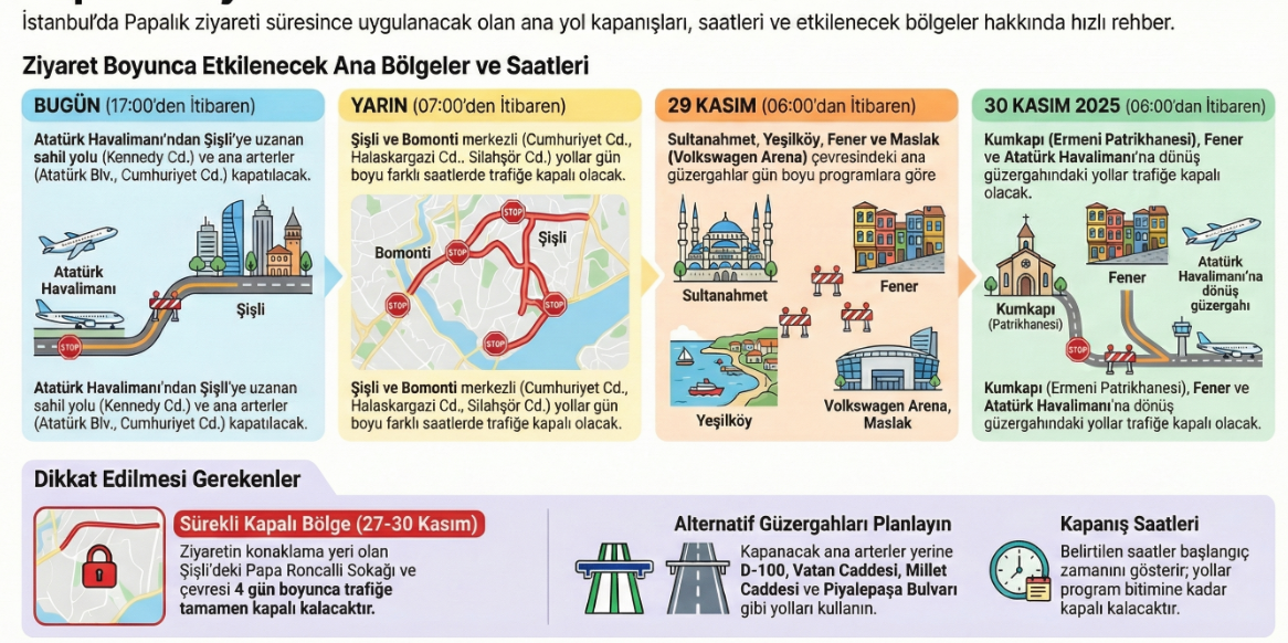 Vatikan Devlet Başkanı ve Katolik dünyasının ruhani lideri Papa 14. Leo, Türkiye'ye doğru hareket ederken İstanbul Valiliği de ziyaret dolayısıyla kapanacak yolların listesini açıkladı. Vatikan Devlet Başkanı ve Katolik dünyasının ruhani lideri Papa 14. Leo, Ankara'daki programların ardından akşam İstanbul'a gelecek. Buradaki programlar kapsamında 28 Kasım Cuma günü Harbiye'deki Saint Esprit Katolik Kilisesi'nde (Kutsal Ruh Katedrali) piskoposlar, rahipler, diyakonlar ve ruhani görevlilerle toplantı yapacak Papa, ardından Fransız Fakirhanesi'ne ziyarette bulunacak. Daha sonra helikopterle İznik'e gidecek Papa 14. Leo, oradaki programının ardından aynı gün İstanbul'a dönerek Vatikan Temsilciliği'nde piskoposlarla görüşme yapacak. Leo, 29 Kasım Cumartesi günü sabah saatlerinde Sultanahmet Camisi'ni ve Mor Efrem Süryani Kadim Ortodoks Kilisesi'ni ziyaret ederek, yerel kiliseliler ve Hristiyan topluluklarının liderleriyle toplantı gerçekleştirecek. Sonraki durak Aya Yorgi Kilisesi ve Fener Rum Patrikhanesi olacak. Burada Fener Rum Patriği Bartholomeos ile görüşecek Papa, ortak bildiri imzalayacak. Papa 14. Leo'nun cumartesi günü programı, Volkswagen Arena'da düzenlenecek ayinle sürecek. Ziyaretlerine 30 Kasım Pazar günü de devam edecek Leo, öğleden sonra Atatürk Havalimanı'ndan uçakla Beyrut'a gidecek. Papa 14. Leo’nun ziyareti dolayısıyla İstanbul’da kapanacak yollar ve alternatif güzergahlar belirlendi. İstanbul Valiliği'nin duyurusuna göre kapanacak yollar şunlar olacak: [news_id:793197]