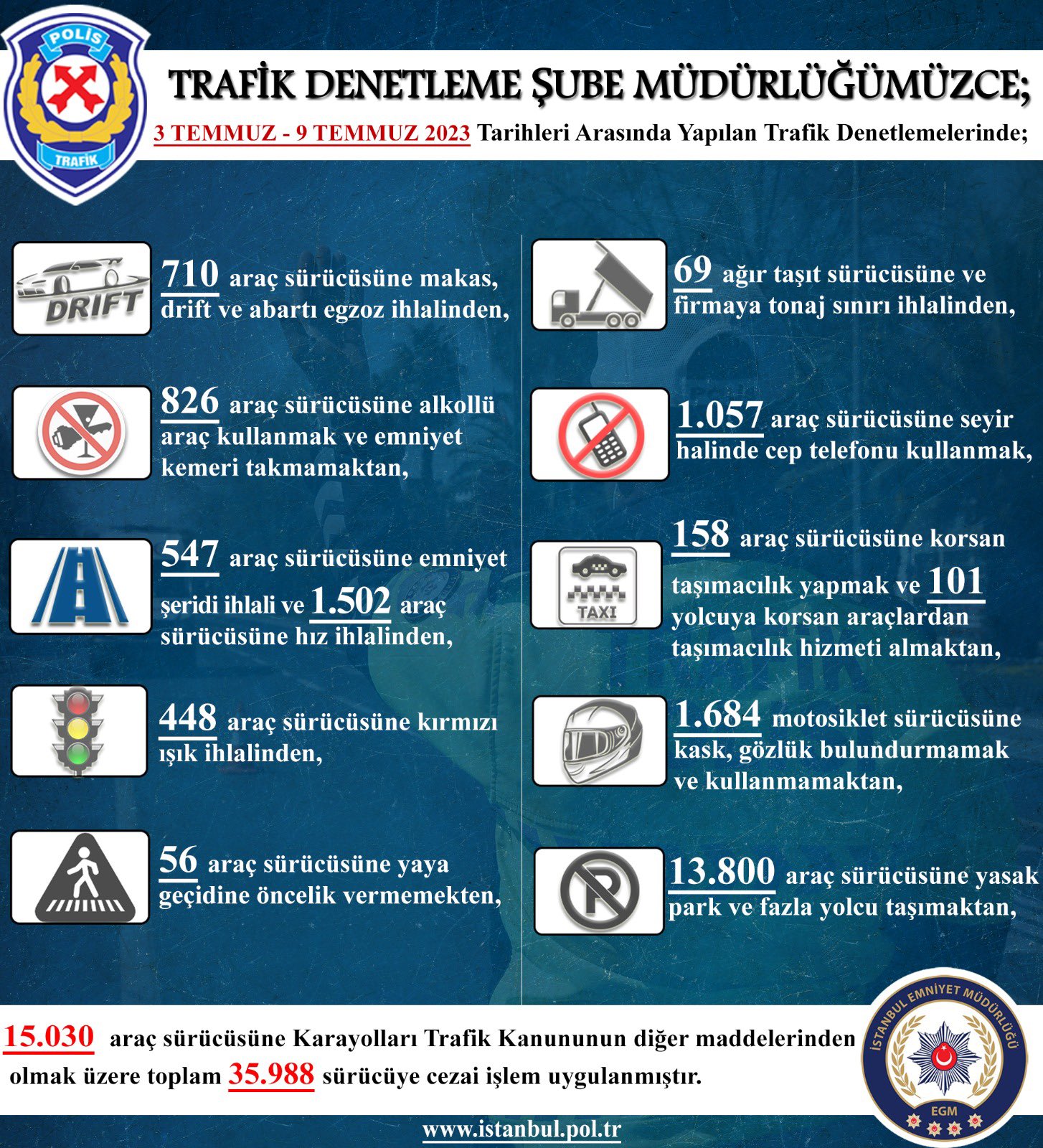 İstanbul Emniyet Müdürlüğü'nce 3-9 Temmuz tarihlerinde yapılan trafik denetimlerinde 35 bin 988 sürücüye cezai işlem uygulandığı bildirildi. İstanbul Emniyet Müdürlüğü sosyal medya hesabından, Trafik Denetleme Şube Müdürlüğü'nün 3-9 Temmuz tarihlerindeki uygulamalarına ilişkin veriler paylaşıldı. Buna göre, geçen hafta 710 araç sürücüsüne makas atma, drift ve abartı egzoz ihlalinden, 826 araç sürücüsüne alkollü araç kullanmak ve emniyet kemeri takmamaktan, 547 araç sürücüsüne emniyet şeridi ihlali ve 1502 araç sürücüsüne hız ihlalinden ceza kesildi. Denetimlerde 448 araç sürücüsüne kırmızı ışık ihlalinden, 56 araç sürücüsüne yaya geçidinde öncelik vermemekten, 1057 araç sürücüsüne seyir halinde cep telefonu kullanmaktan, 13 bin 800 araç sürücüsüne yasak park ve fazla yolcu taşımaktan işlem yapıldı. Ağır taşıt sürücüsü 69 kişi ve firmaya tonaj sınır ihlalinden, 158 araç sürücüsüne korsan taşımacılık yapmak ve 101 yolcuya korsan araçlardan taşımacılık hizmeti almaktan, 1684 motosiklet sürücüsüne kask, gözlük bulundurmamak ve kullanmamaktan cezai işlem uygulandı. Kontrollerde, 15 bin 30 araç sürücüsüne de Karayolları Trafik Kanunu'nun diğer maddelerinden olmak üzere, toplam 35 bin 988 sürücüye ceza kesildi. Kaynak: İstanbul EGM - Twitter