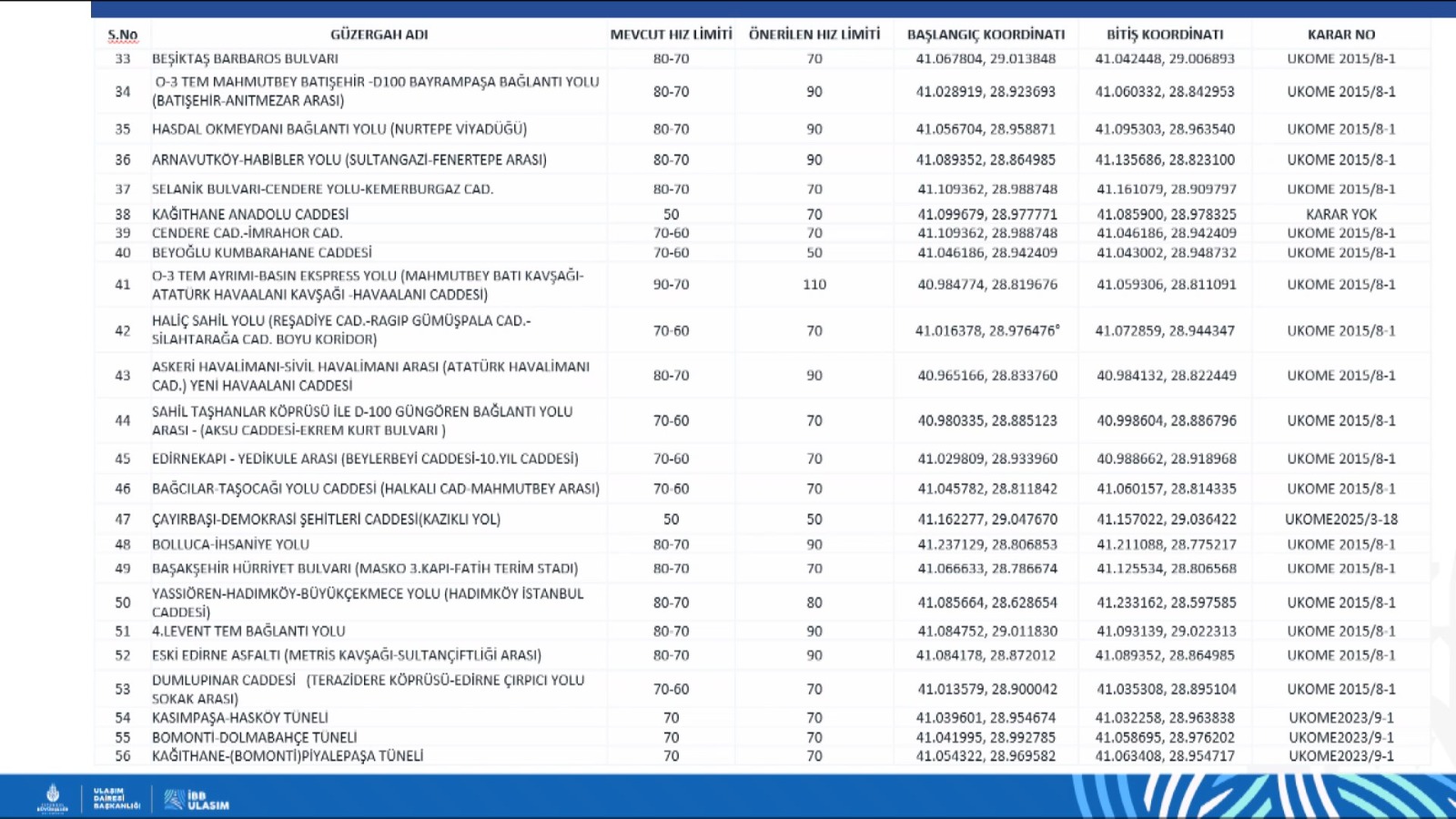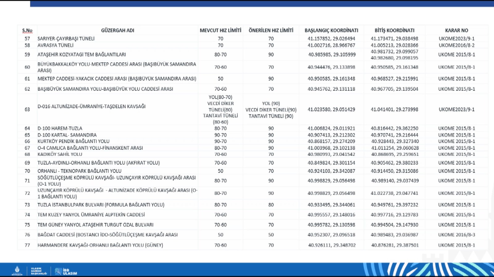 İstanbul Büyükşehir Belediyesi (İBB) Ulaşım Koordinasyon Merkezi (UKOME) toplantısında, Avrupa Yakası'nda 57, Anadolu Yakası'nda da 27 noktada olmak üzere toplam 84 güzergahın hız limitleri yeniden belirlendi. UKOME kasım ayı toplantısı, İBB Genel Sekreter Yardımcısı Pelin Alpkökin başkanlığında yapıldı. Eyüpsultan Feshane Art İstanbul Konferans Salonu'nda yapılan toplantıya, İstanbul Valiliği, İstanbul Emniyet Müdürlüğü, İstanbul Büyükşehir Belediye Başkanlığı, Karayolları 1. Bölge Müdürlüğü'nün ortaklaşa çalışmasıyla oluşturulan teklif sunuldu. İstanbul Geneli Trafik İşaret Levhalarının Sadeleştirmesi ve çeşitli yol kesimlerinde hız limitlerinin revize edilmesi teklifinin görüşüldüğü toplantıda, 84 noktada hız limitlerinin güncellenmesine oy birliğiyle karar verildi. "14 bin levhanın sökümü karara bağlandı" Toplantıda konuşan Ulaşım Koordinasyon Şube Müdürü Rıdvan Oğul ise şunları aktardı: "Çalışma, 2025/14 sayılı Cumhurbaşkanlığı Genelgesinde özetle ara yollardaki hız sınırlarının yeniden değerlendirilerek, yol yapısı üzerinde hız sınırlarını belirleyen işaretlemelerin gerekliliği ve konumunun incelenip, ülke genelinde yeknesaklığın sağlanması çalışmalarının ivedilikle yapılıp sonuçlandırılması talebi üzerine başlatıldı. Çalışma kapsamında yine genelgede belirtilen belediyelerin bakım ve onarımından sorumlu olduğu, taşıma kapasitesi yüksek yollar tanımına uygun olarak komisyonun belirlemiş olduğu çalışma grubu marifetiyle belirlenen toplam 84 yol güzergahında 1168 noktada tespit yapıldı. Bu tespitler sonucunda hız limitleri yeniden belirlendi. Levhalarla ilgili düzenlemeler yeniden yapıldı. Avrupa Yakası'nda 57 noktada, Anadolu Yakası'nda da 27 güzergahta olmak üzere toplam 84 güzergahta hızlar yeniden belirlendi. Bu çalışma sonucunda toplam 1105 levhanın yerinde uygulanması, 14 bin 655 levhanın da sökümü karara bağlandı. Büyük bir çalışma İstanbul genelinde. Takvime göre 31 Aralık 2025 tarihine kadar da saha çalışmalarının tamamlanması gerekiyor." Hız limiti değişen yollar ise şöyle sıralandı: Kaynak: Milliyet [news_id:790960]