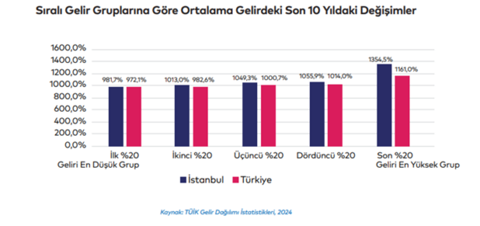 İstanbul Planlama Ajansı (İPA), İstanbul’un gelir dağılımındaki bozulmanın son 10 yılda Türkiye genelinden daha fazla olduğunu tespit etti. İstanbul Planlama Ajansı (İPA) tarafından yayımlanan gelir dağılımı raporuna göre hanehalkı kullanılabilir gelirine dayalı olarak ölçülen Gini katsayısı, İstanbul’da 2014 yılında 0,357 iken 2024’te 0,428’e yükseldi. Türkiye genelinde ise aynı dönemde Gini katsayısı 0,379’dan 0,418’e çıktı. Gini katsayısı, sıfıra yaklaştıkça gelir dağılımında eşitliği, bire yaklaştıkça ise eşitsizliği ifade ediyor. İstanbul’da bu göstergedeki yükseliş ise gelir eşitsizliğinin son 10 yılda önemli ölçüde arttığını gösteriyor. İstanbul’da hanehalkı kullanılabilir gelire göre sıralı %20’lik gruplar itibarıyla bakıldığında 2014 yılından itibaren ortalama geliri en az artan grup, en yoksul %20’lik gelir grubu olurken; ortalama geliri en fazla artan grup, geliri en yüksek %20’lik grup oldu. En yoksul %20’lik grubun ortalama geliri son 10 senede 10,8 katına çıkarken geliri en yüksek %20’lik grubun ortalama geliri 14,5 katına çıktı. Kaynak: İPA İstanbul’da en yüksek gelire sahip %10’luk kesimin payının en yoksul %10’luk kesimin payına oranı ise son 10 yılda 9 kattan 14 kata yükseldi. Toplumun en yüksek gelir elde eden %10’unun elde ettiği payın en düşük gelir elde eden %10’unun elde ettiği paya oranı şeklinde hesaplanan P90/P10 oranı İstanbul’da 2014 yılında 9,25 iken 2024 yılında bu oran 13,91’e yükseldi. İlgili raporda, Türkiye’de 100 yaşlı bireyden 23’ünün yoksulluk veya sosyal dışlanma riski altında olduğu bildirildi. Kaynak: İPA