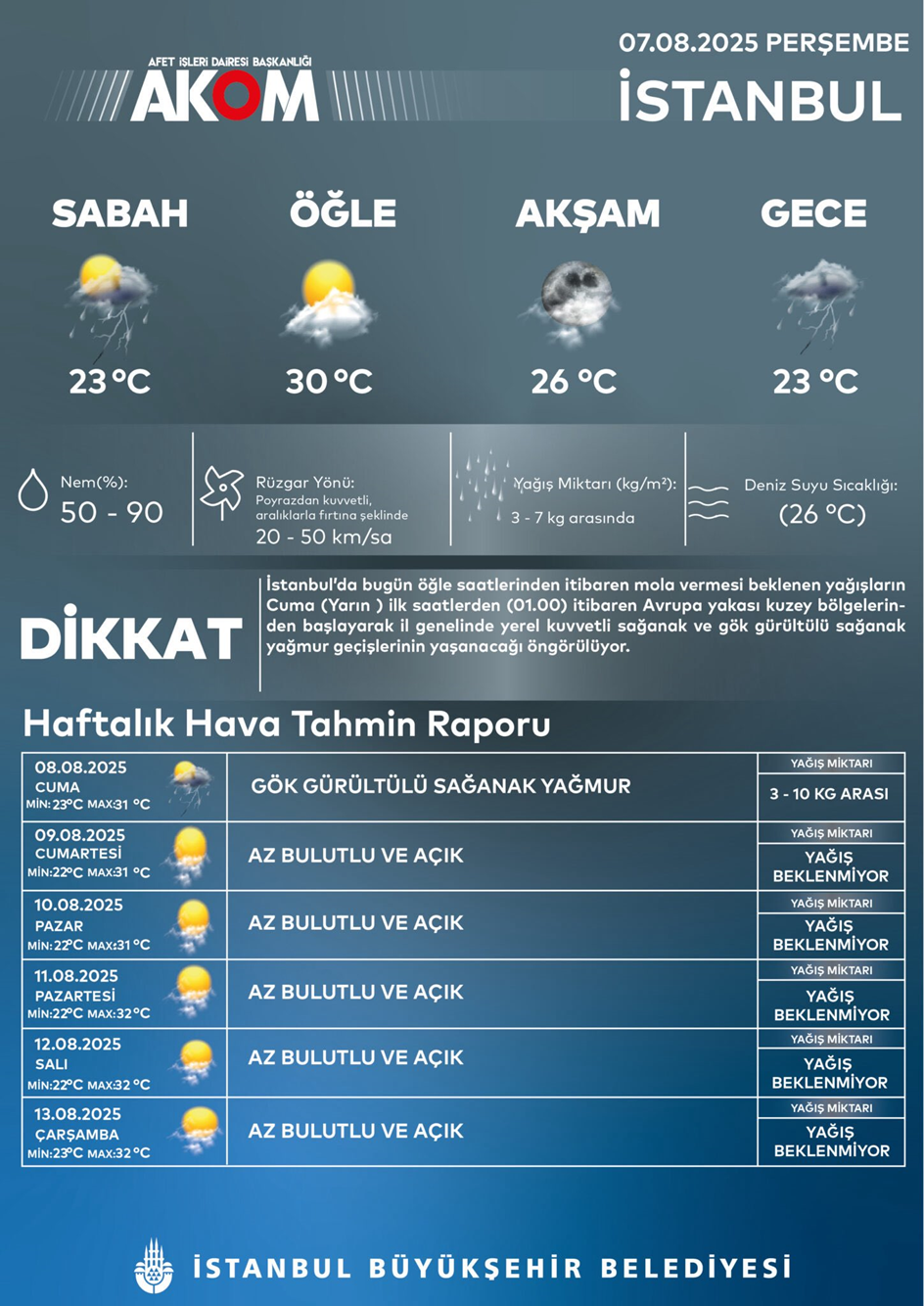 İstanbul Büyükşehir Belediyesi (İBB) Afet İşleri Dairesi’ne bağlı Afet Koordinasyon Merkezi (AKOM), haftalık hava tahmin raporunu yayımlayarak İstanbullulara uyarıda bulundu. İstanbul Büyükşehir Belediyesi (İBB) Afet İşleri Dairesi Afet Koordinasyon Merkezi (AKOM), yarın İstanbul’da gök gürültülü sağanak yağış beklendiğini bildirdi. Kent genelinde kuvvetli poyraz fırtınası ve yerel gök gürültülü sağanak yağışların etkili olacağı belirtilen raporda, bugün en yüksek sıcaklığın 30 derece en düşük sıcaklığın ise 23 derece olacağı kaydedildi. AKOM'dan yapılan açıklamada, "İstanbul'da bugün öğle saatlerinden itibaren mola vermesi beklenen yağışların cuma ilk saatlerden (01.00) itibaren Avrupa Yakası kuzey bölgelerinden başlayarak il genelinde yerel kuvvetli sağanak ve gök gürültülü sağanak yağmur geçişlerinin yaşanacağı öngörülüyor" denildi.